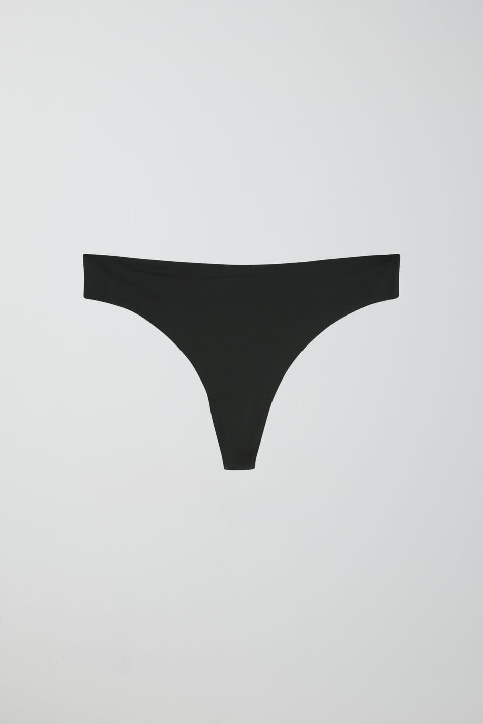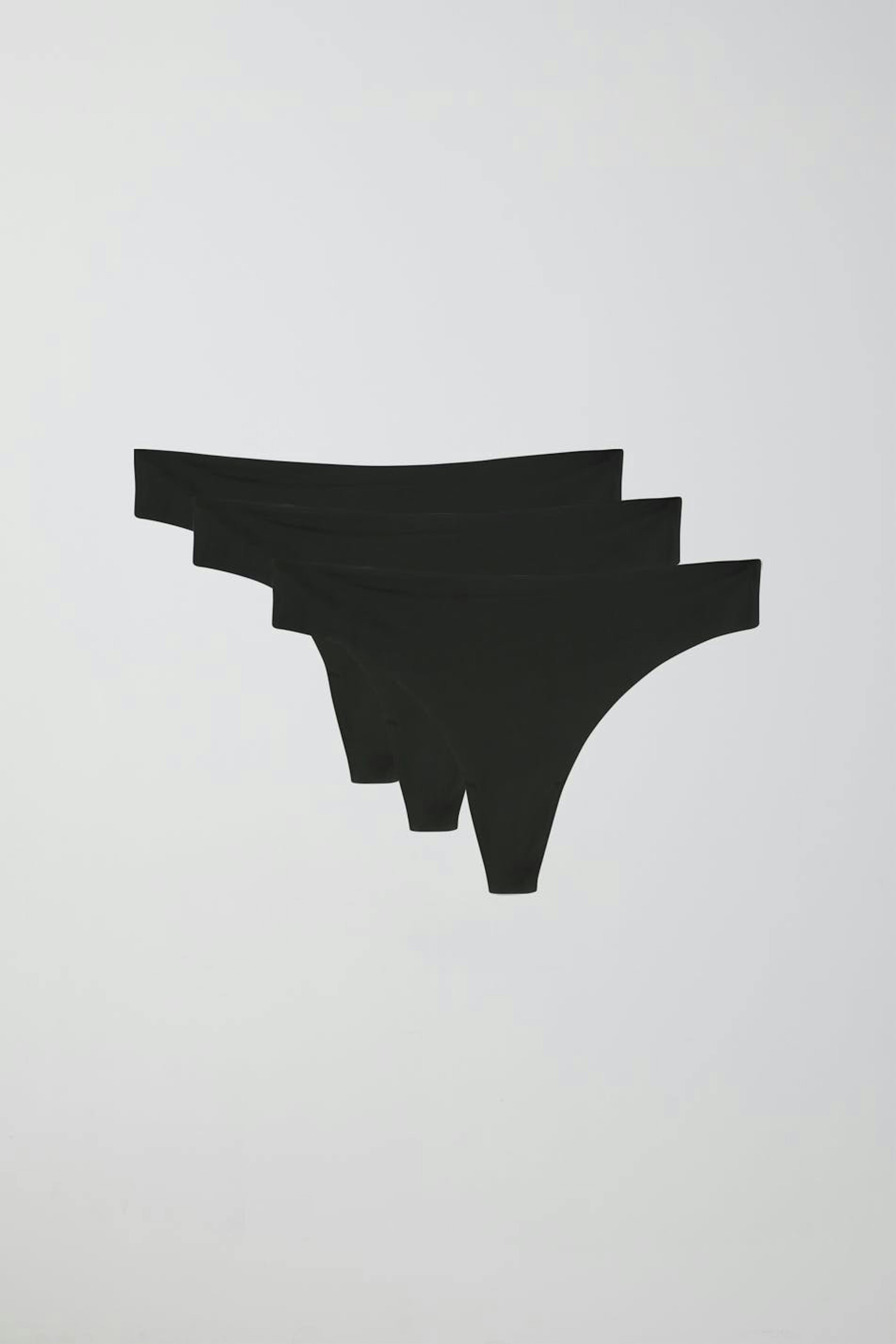 Stringtangas aus Mikrofaser mit rohen Kanten. Die Stringtangas sind schwarz und haben Schrittfutter aus Baumwolle.