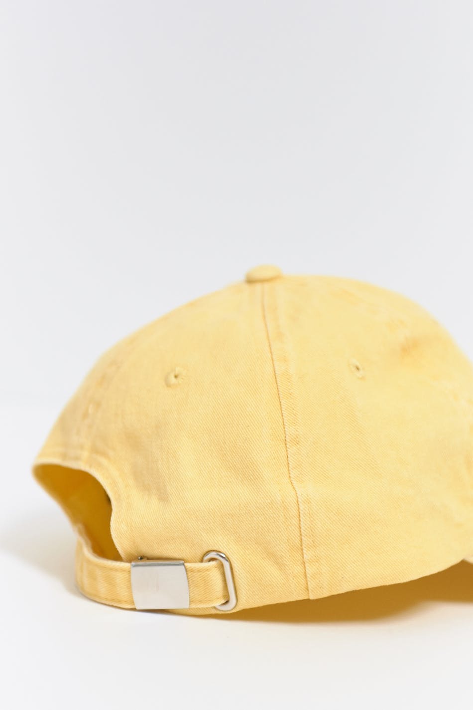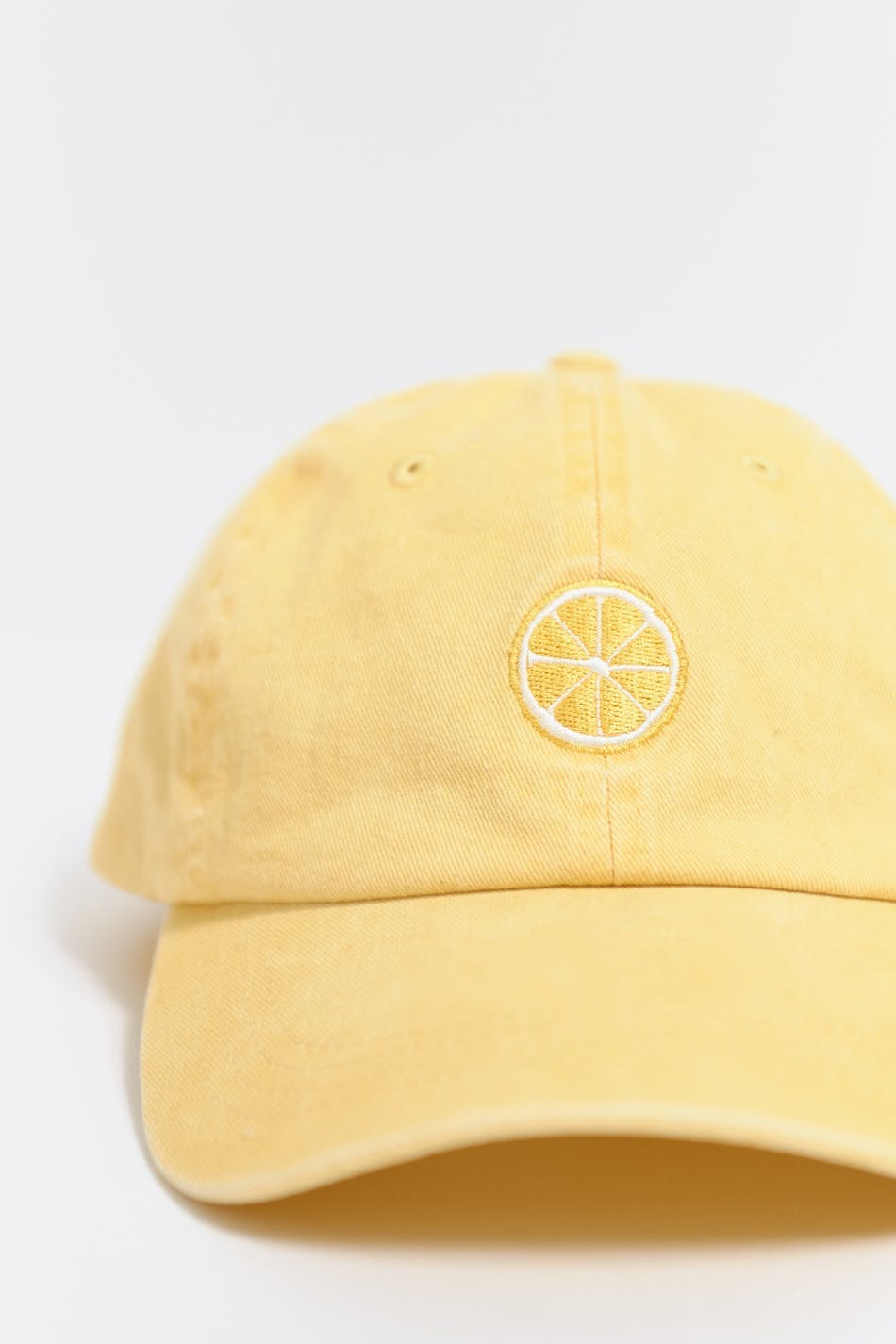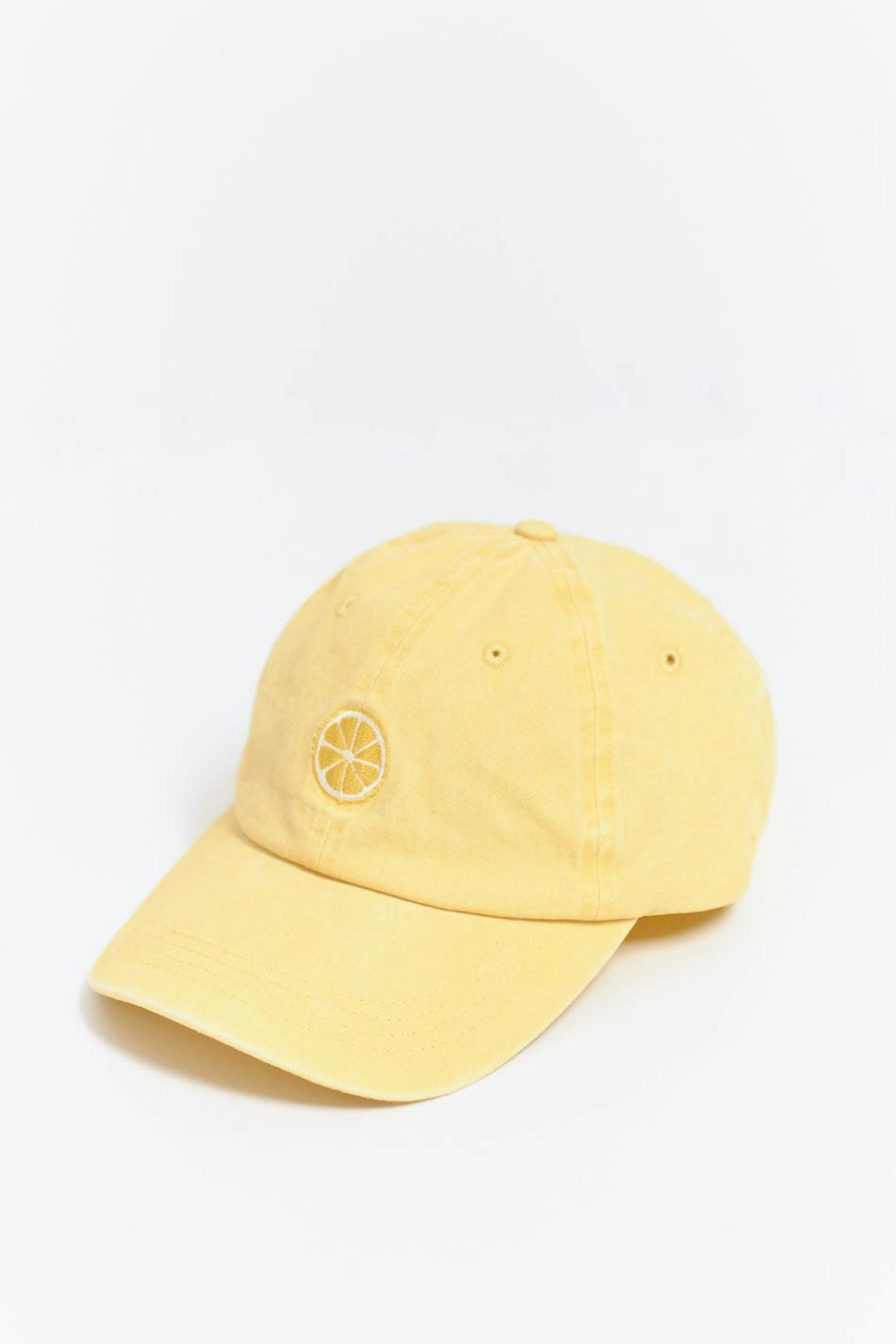 Klassische Kappe aus Baumwolle mit gestickter Zitrone. Die Kappe ist gelb und hat einstellbaren Tab hinten.