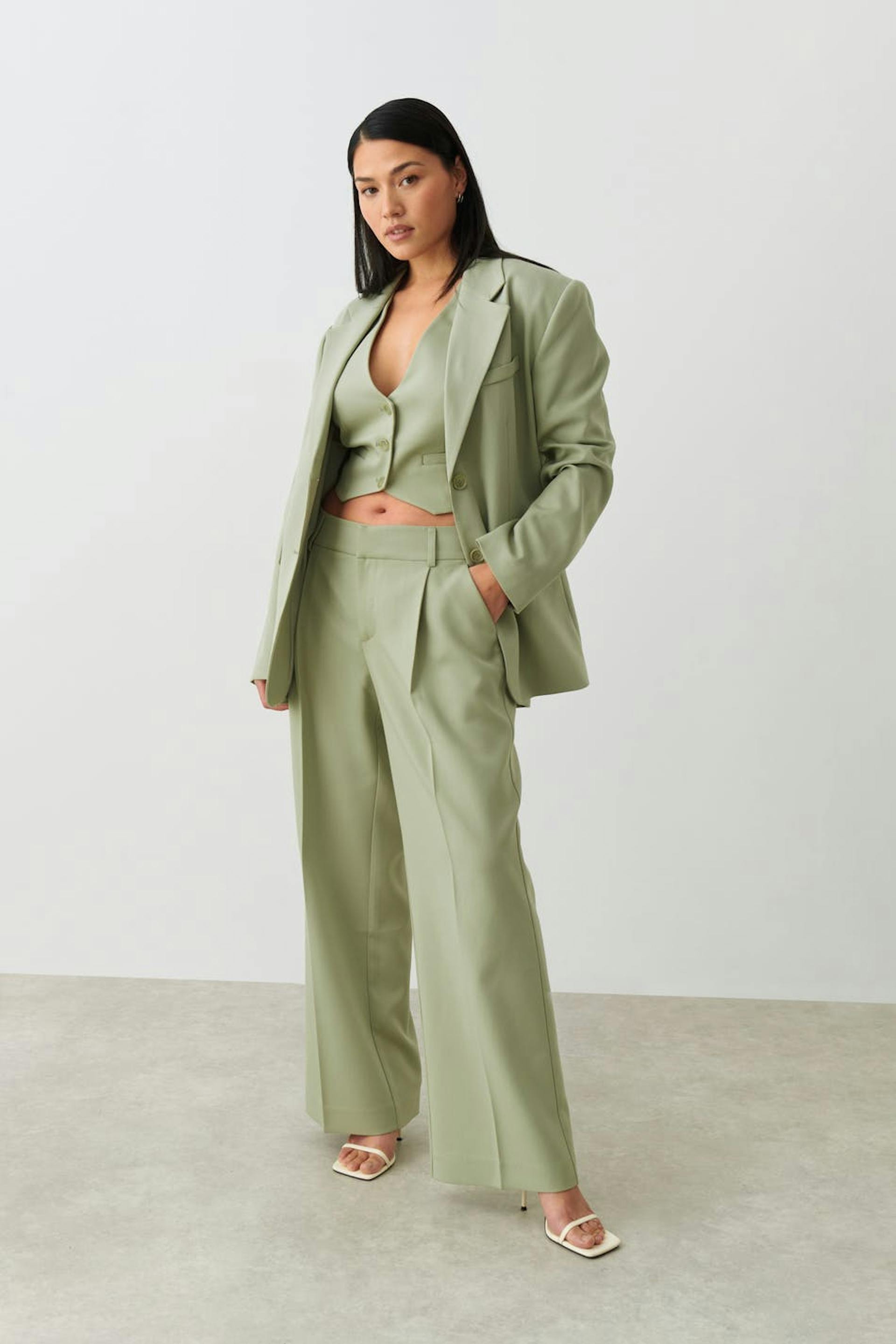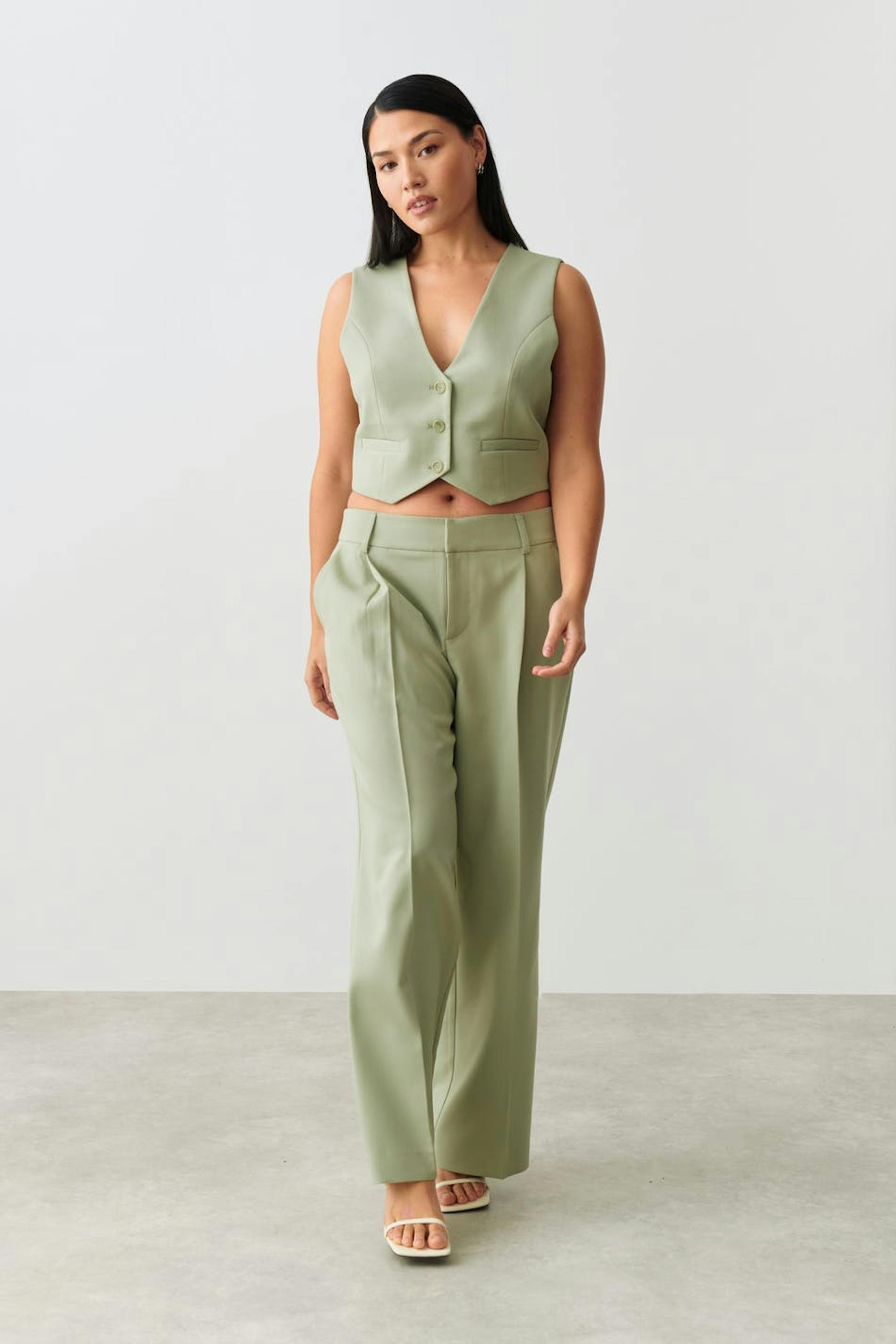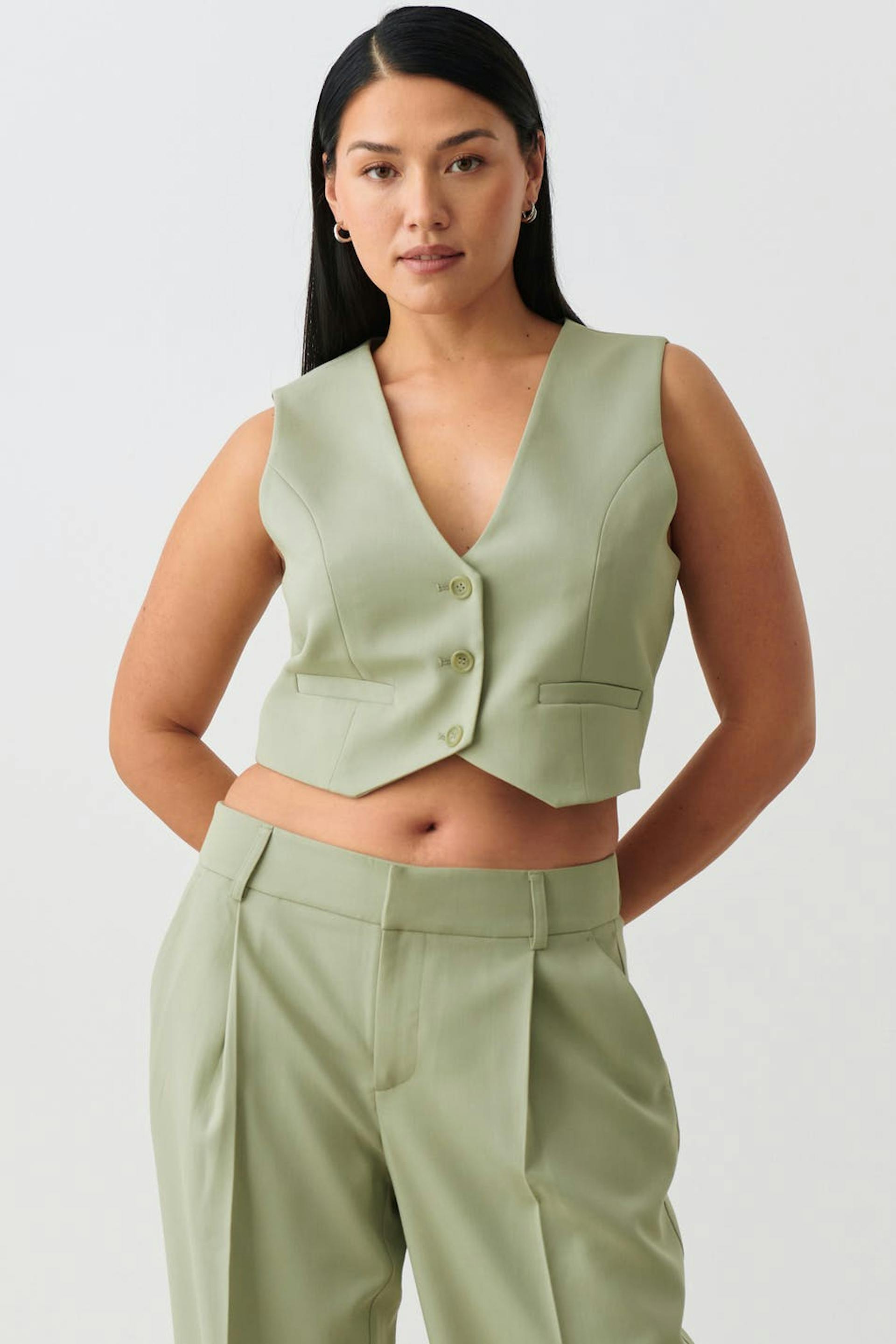 Abgeschnittene Anzugweste mit taillierter Passform. Die Weste ist grün und hat Knopfleiste vorne. Sie hat V-Ausschnitt, rahmengenähte Taschen in den Seiten und dekorative Säume vorne.