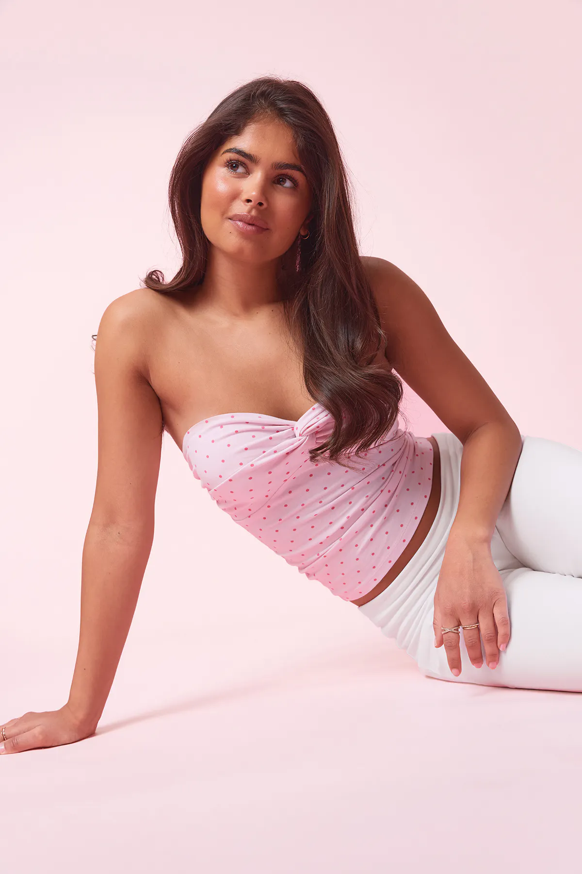 Gepunktetes Bandeau-Oberteil mit dekorativem Torsions-Knoten an der Büste. Das Oberteil ist rosa und hat figurbetonte Passform.