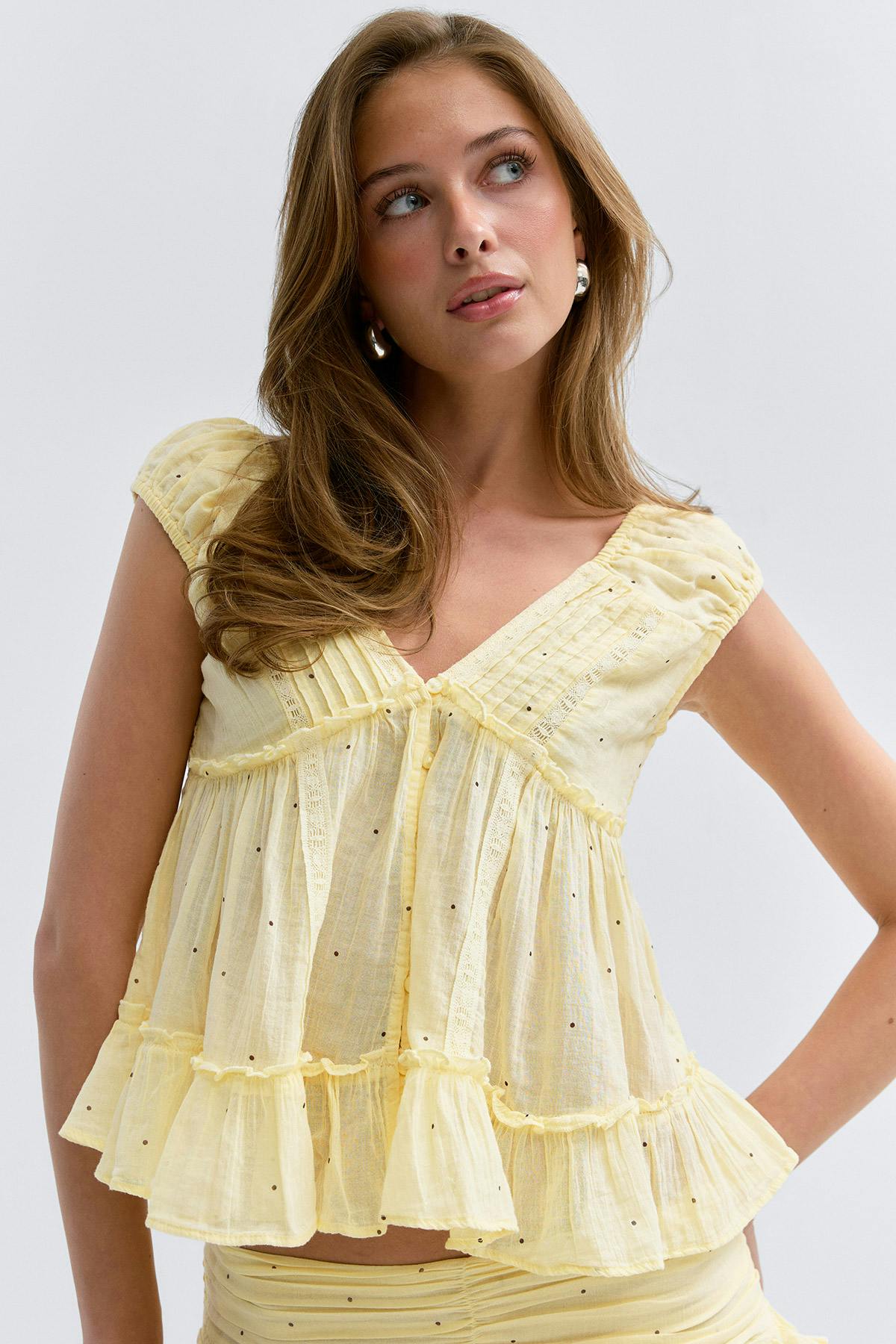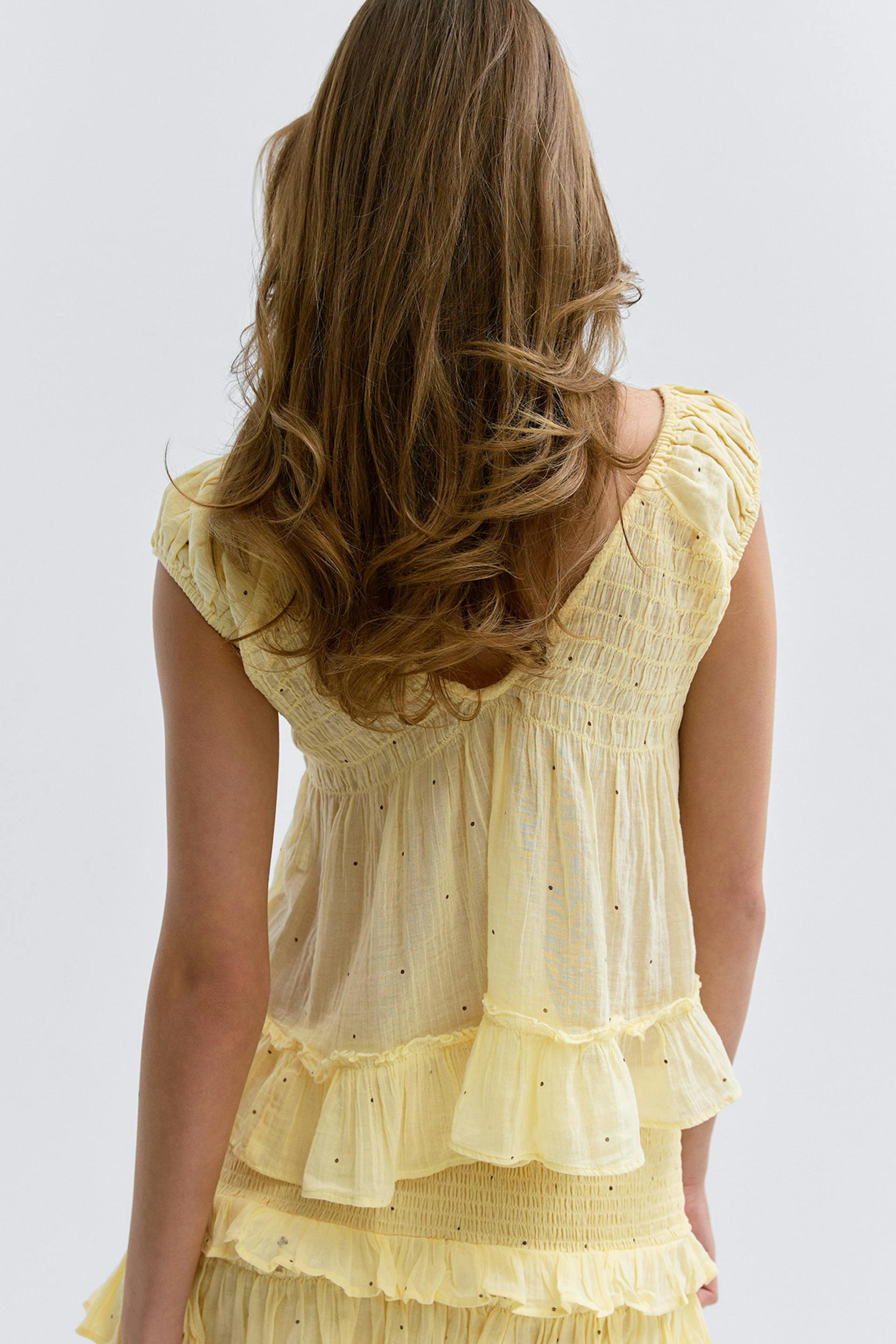 Ärmellose Bluse mit offenem Rücken. Die Bluse ist gelb und hat V-Ausschnitt. Sie hat normale Größe, Rüschen-Details und Knöpfe vorne.