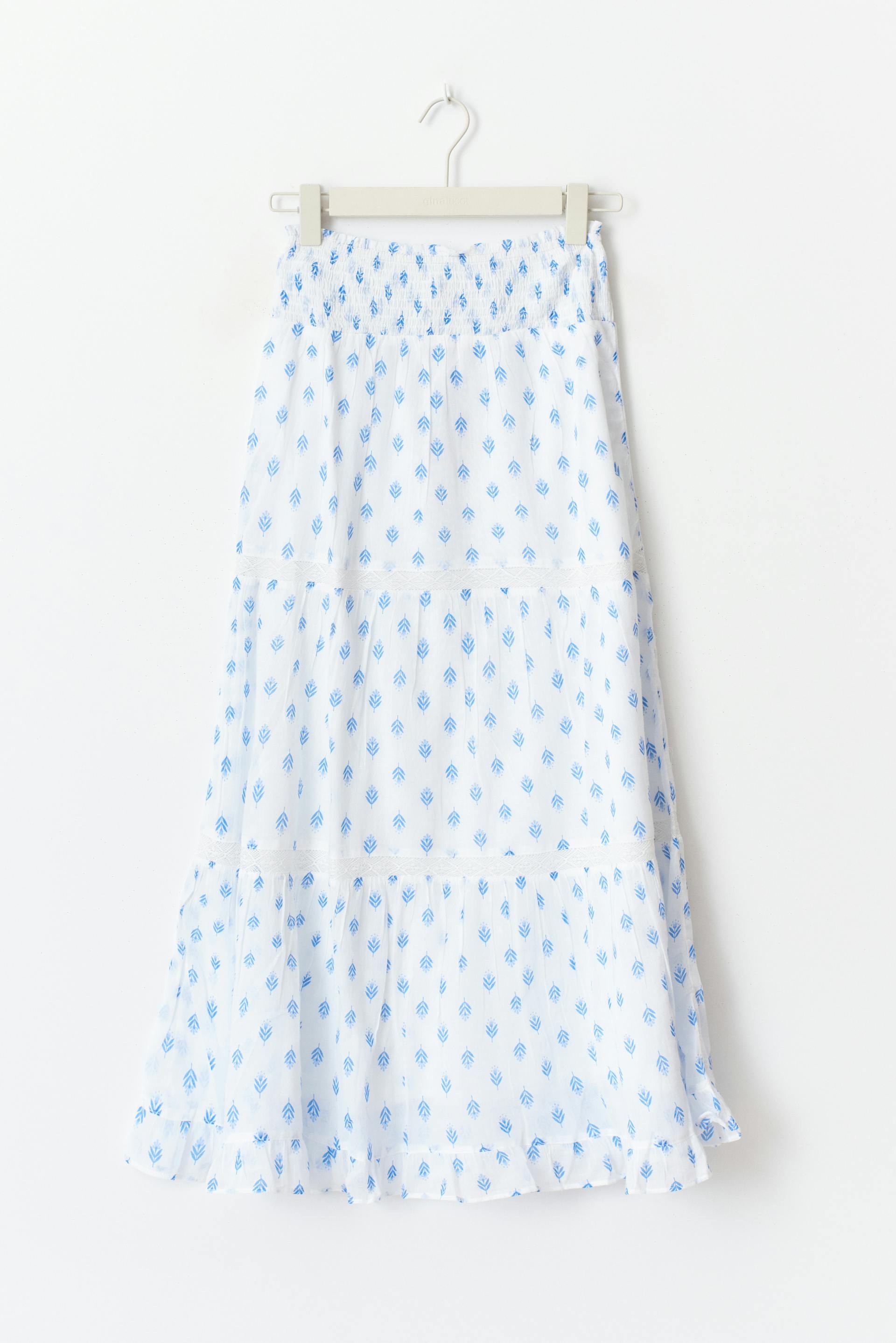 Tall Maxirock aus Baumwolle mit Volants. Der Rock ist blau und hat Spitzendetails. Er hat zerknittertes Material und Gummiband in der Taille.