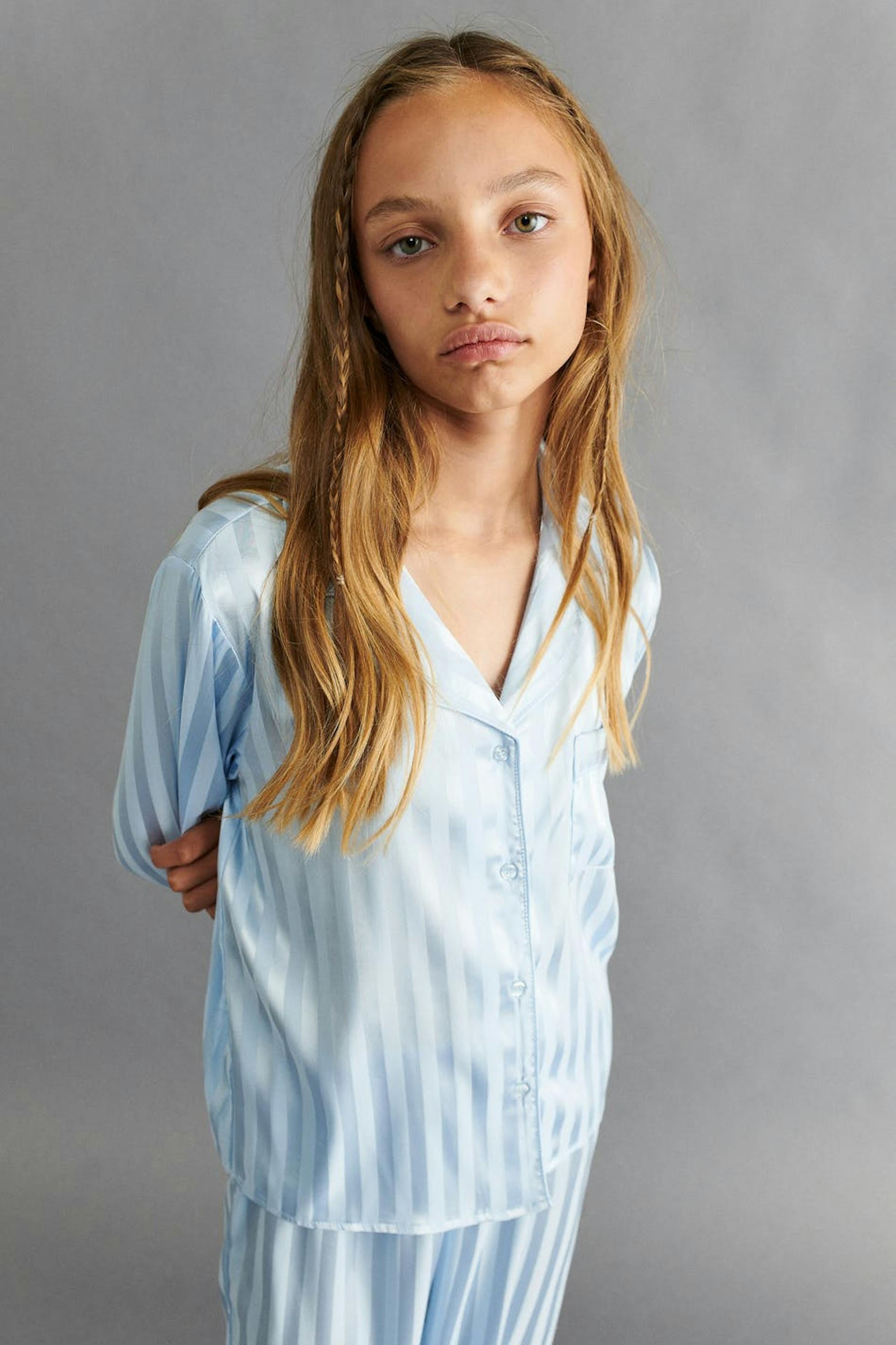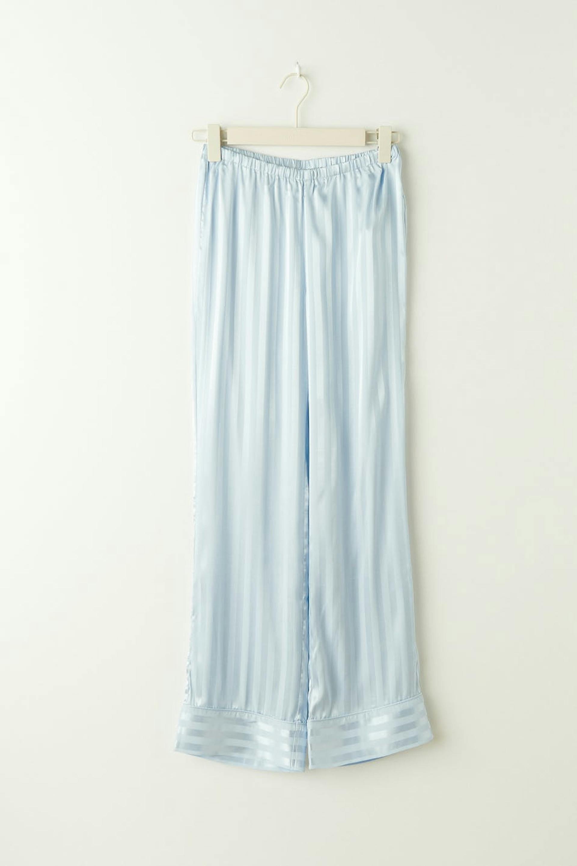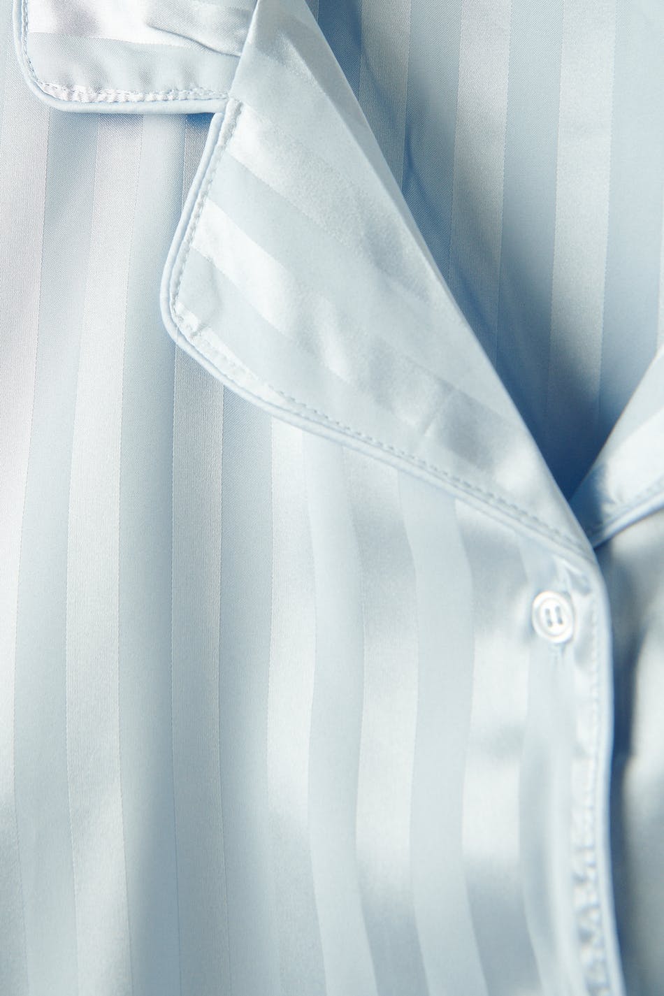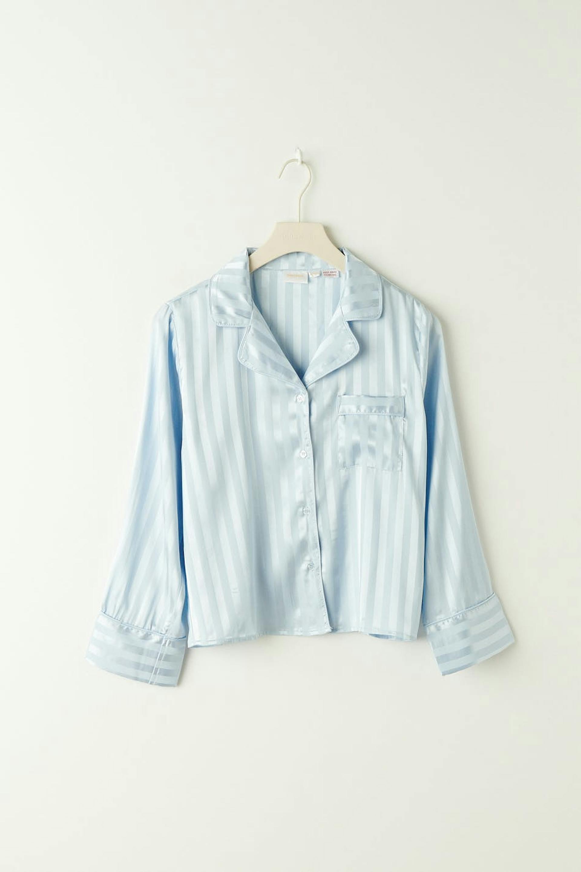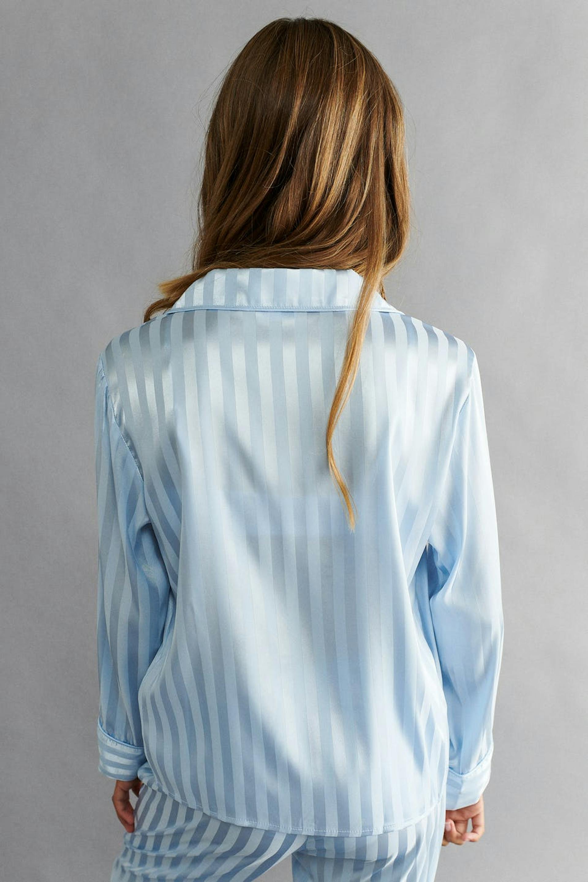 Gestreifter Schlafanzug aus Satin mit normaler Passform. Der Schlafanzug ist blau und hat ein langärmliges Pyjama-Shirt mit Brusttasche und Knopfleiste vorne. Er hat breite Pyjama-Trainingshosen mit Gummiband in der Taille und einer breiten, gefalteten Kante am Beinende.