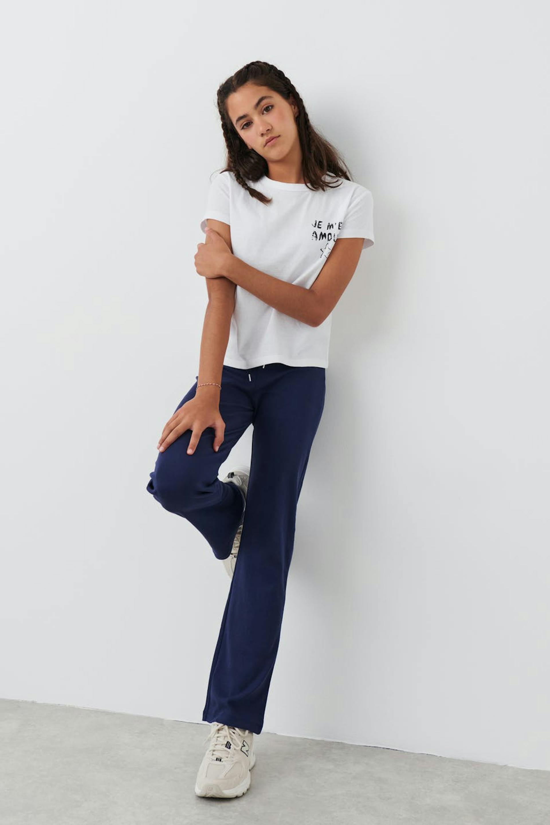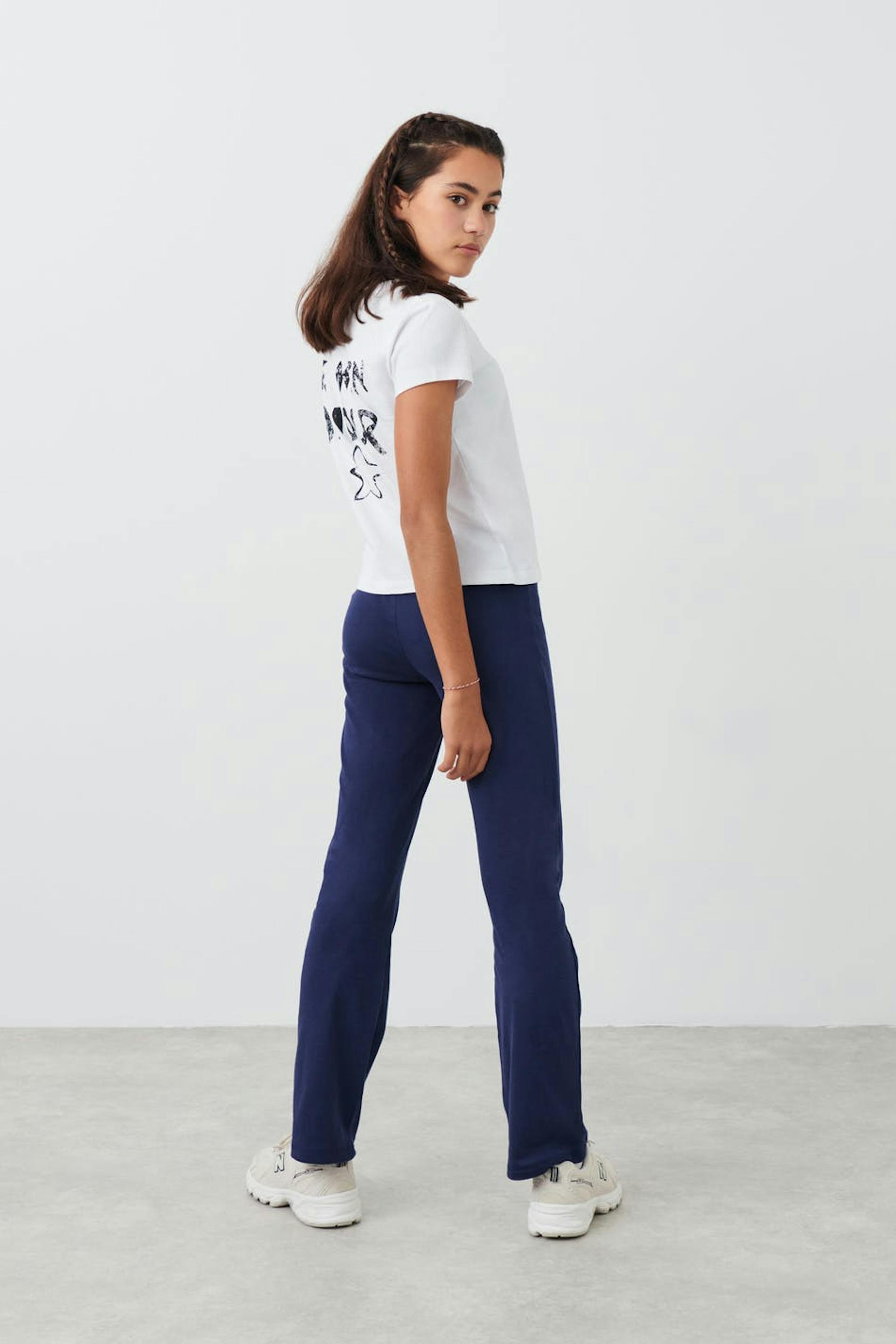 Jogginghosen aus Jersey mit tiefer Taille. Die Hosen sind blau und haben ausgestellte Beine. Sie haben Gummiband in der Taille und Selbstbindung vorne.