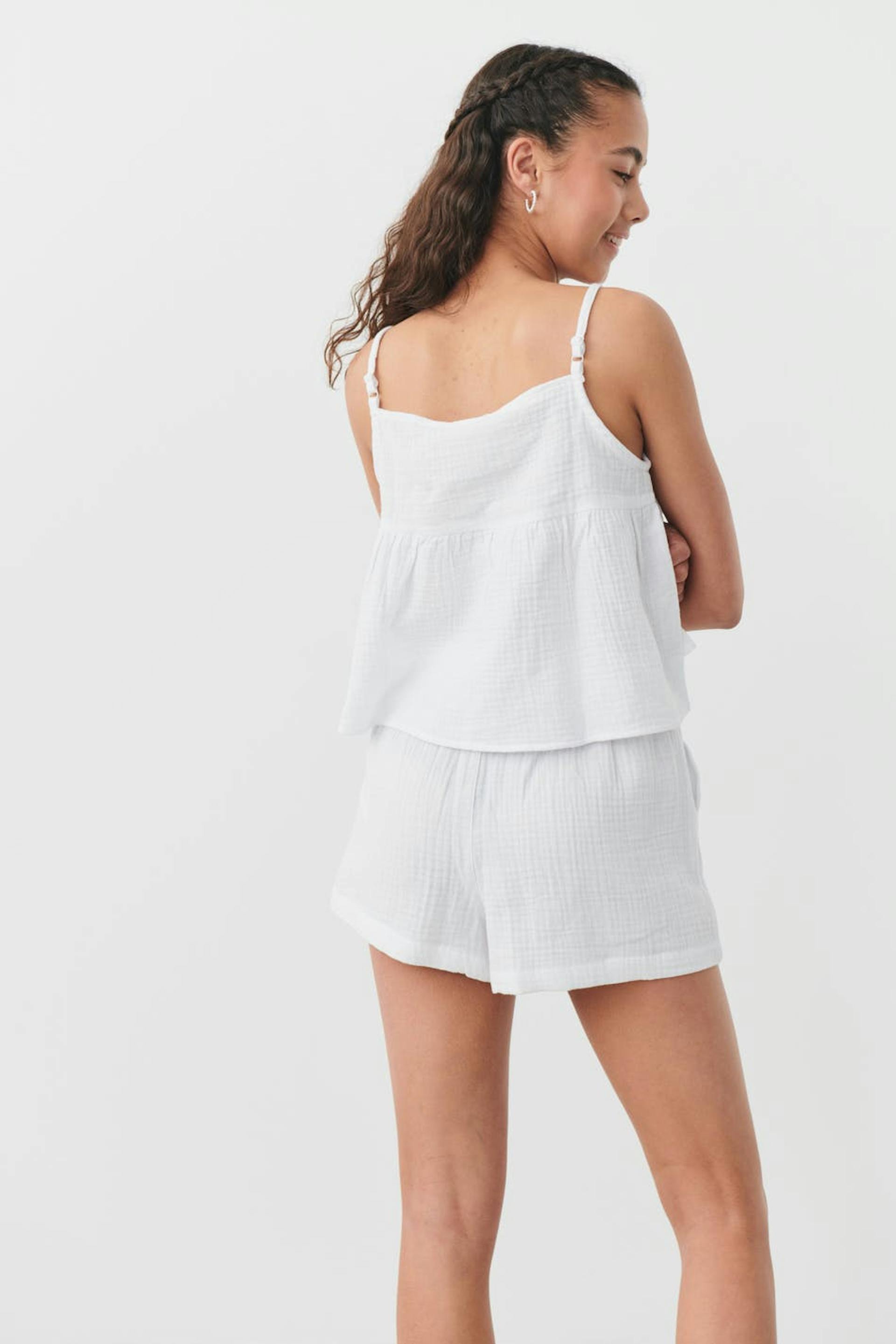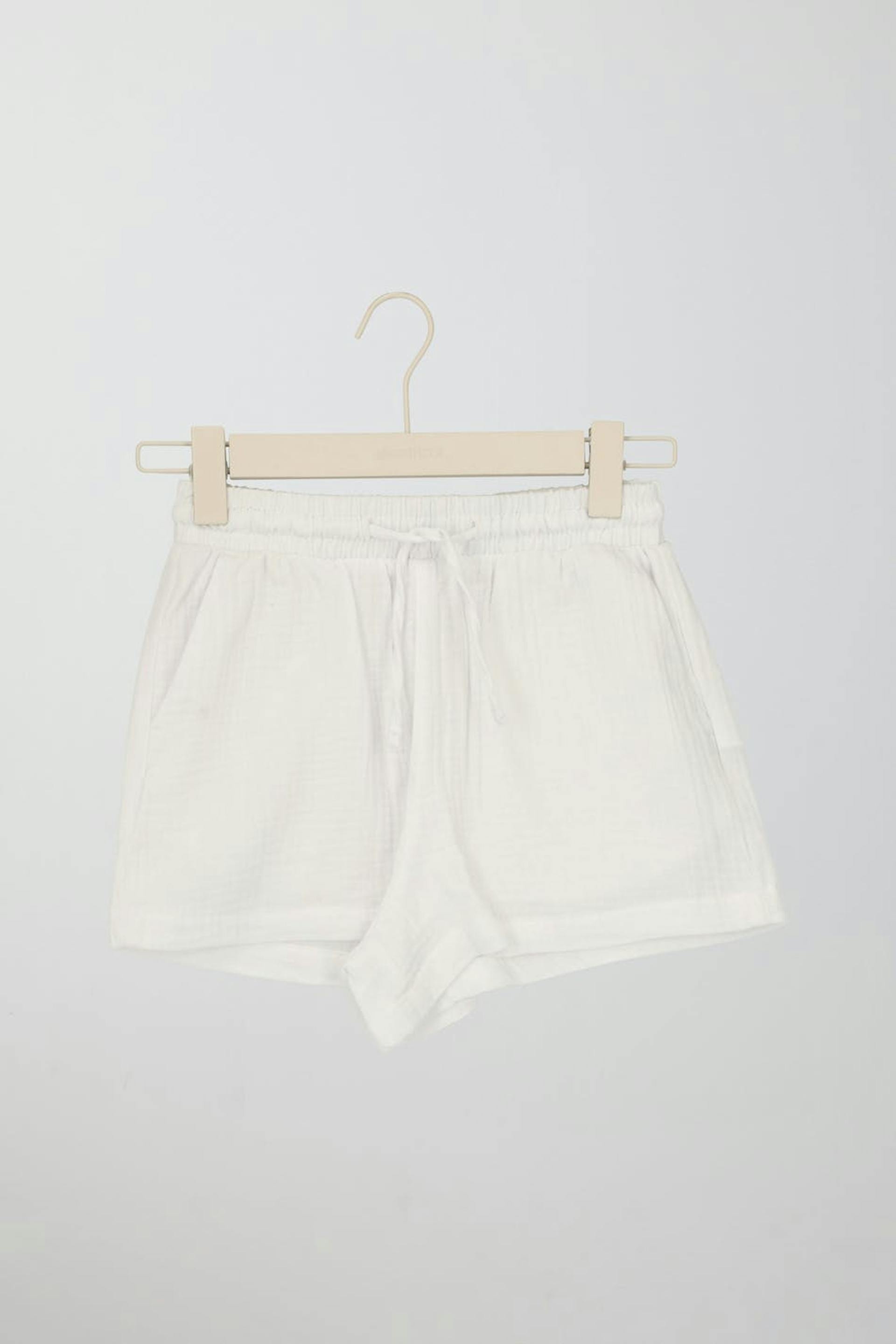 Shorts von Gina Tricot Young mit strukturierter, weicher doppelgewebter Baumwollqualität. Die Shorts sind weiβ und haben einen weit-geschnittenen Style. Sie haben Gummiband in der Taille mit Selbstbindung vorne und Taschen in den Seiten.