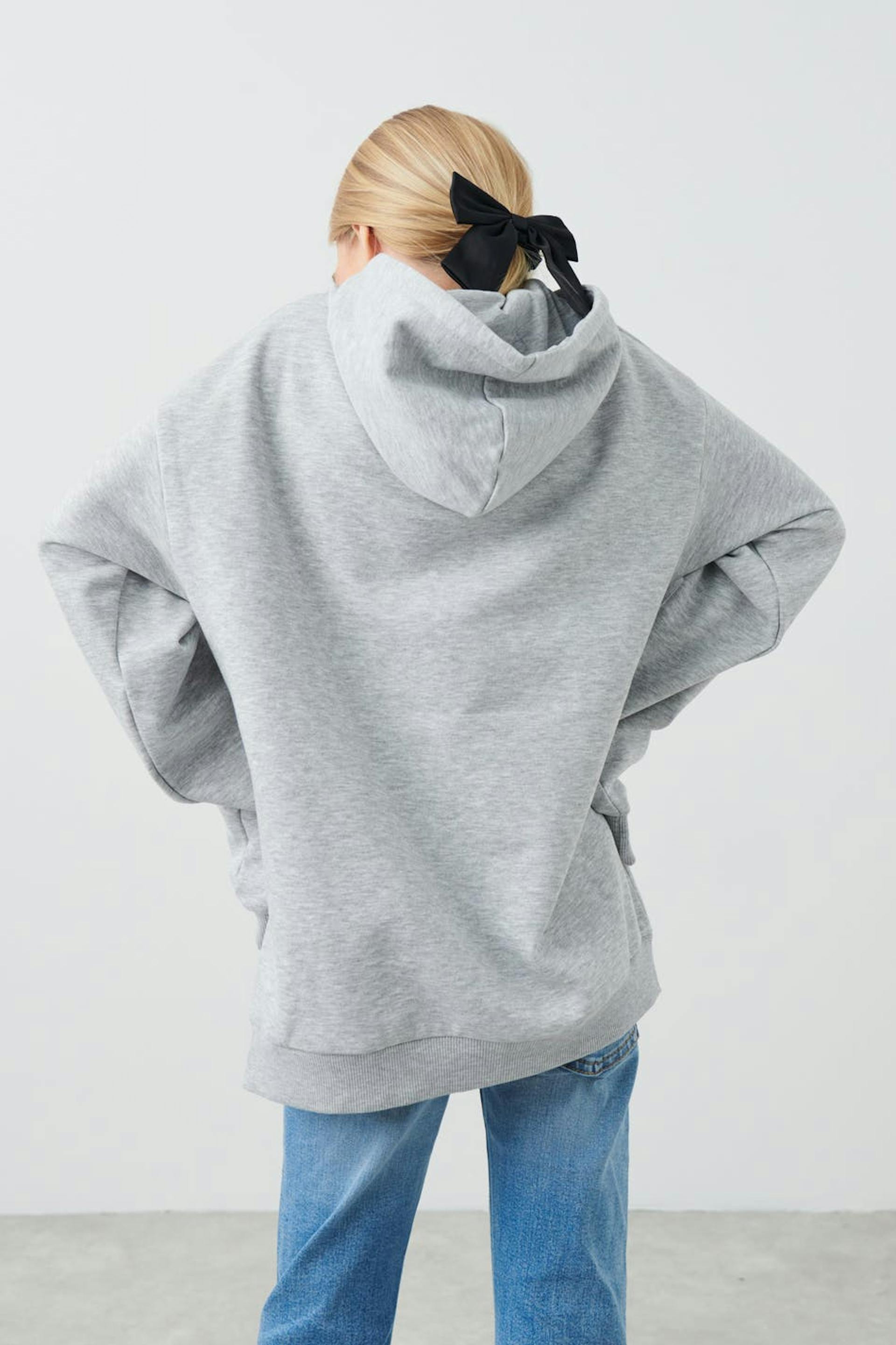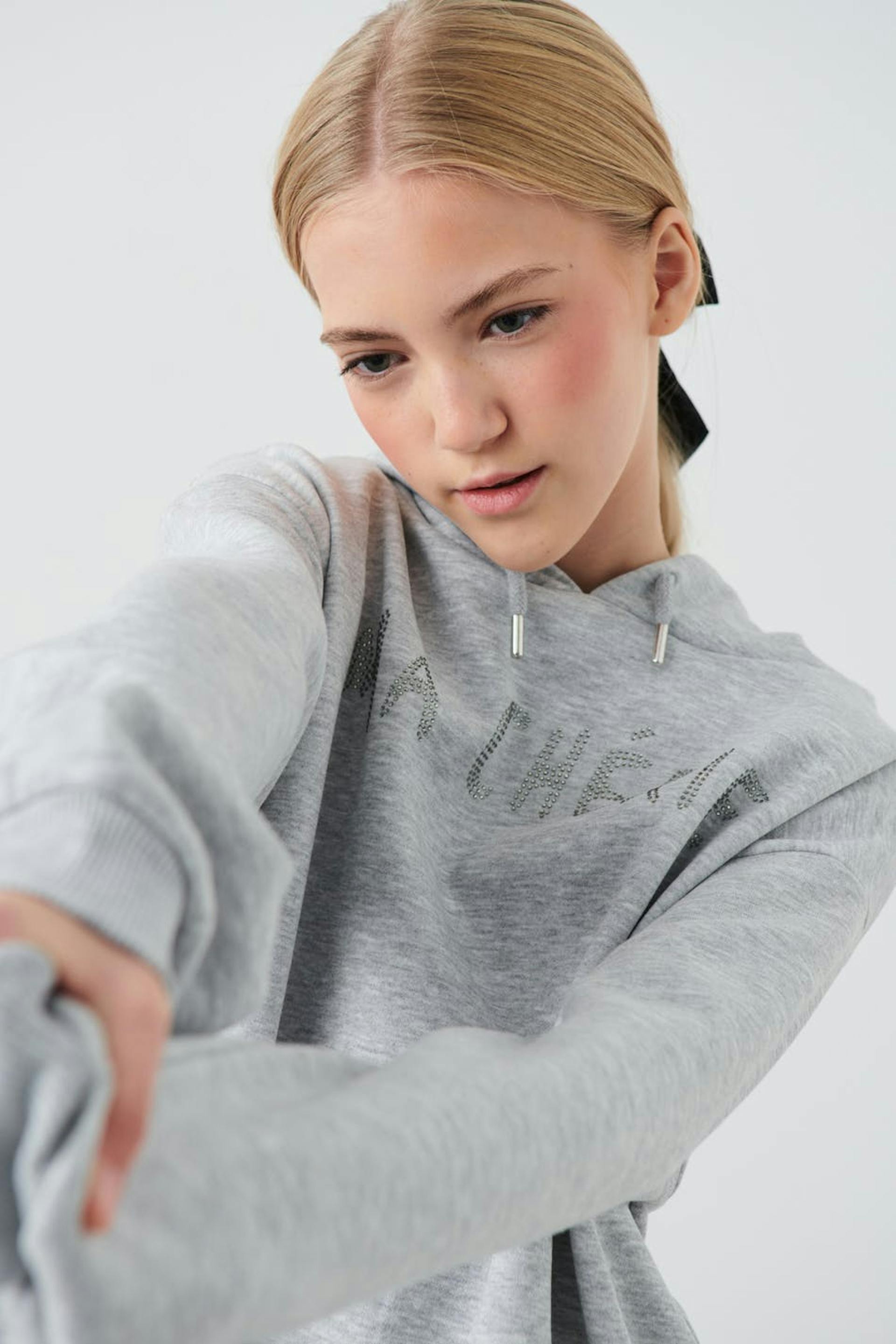 Hoodie aus weichem Trikot mit einer Oversize-Passform. Der Hoodie ist grau und hat Druck mit Strass vorne. Er hat Kapuze mit Kordelzug und Bündchen an den Ärmelenden und an der Unterkante.