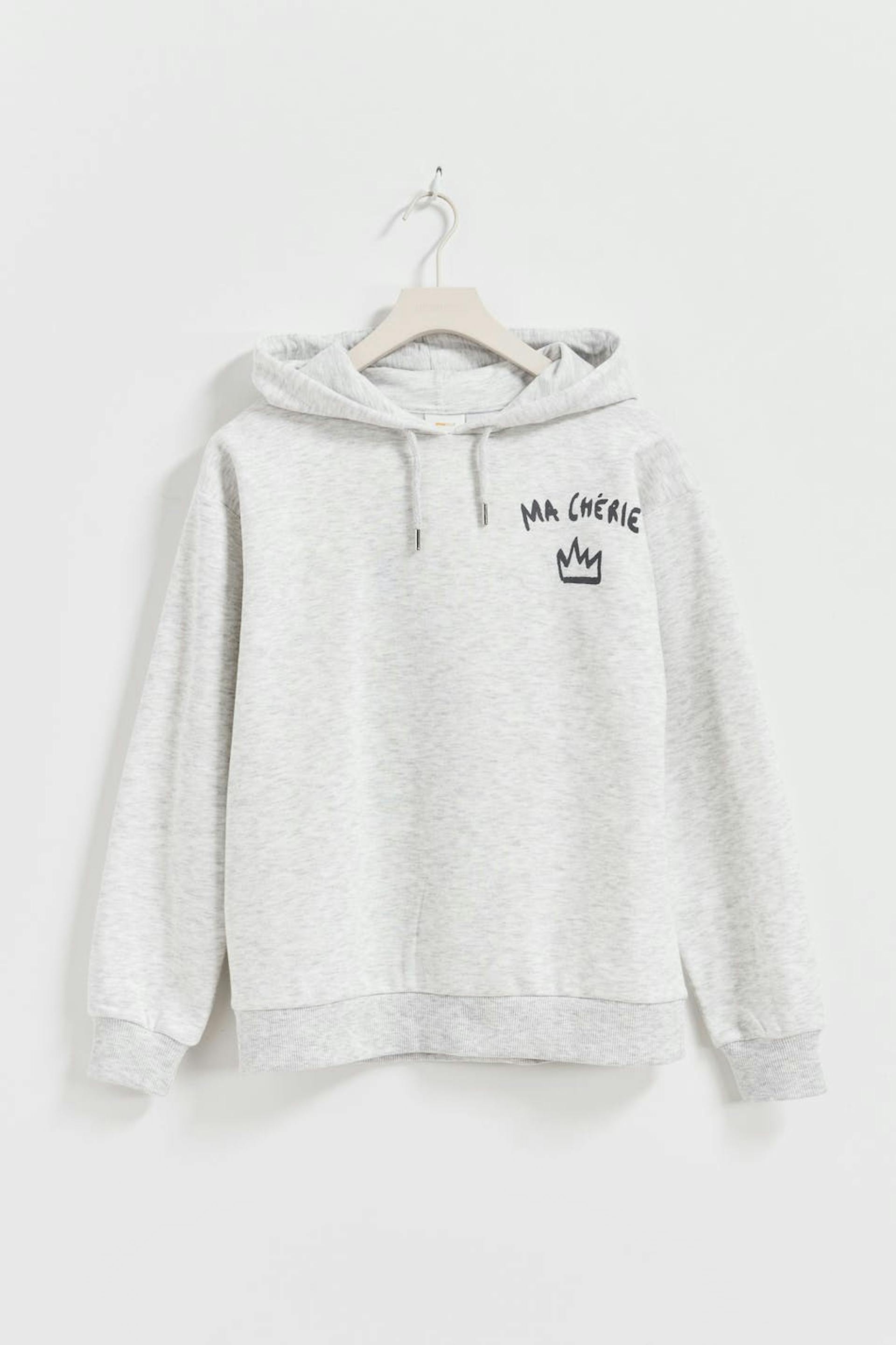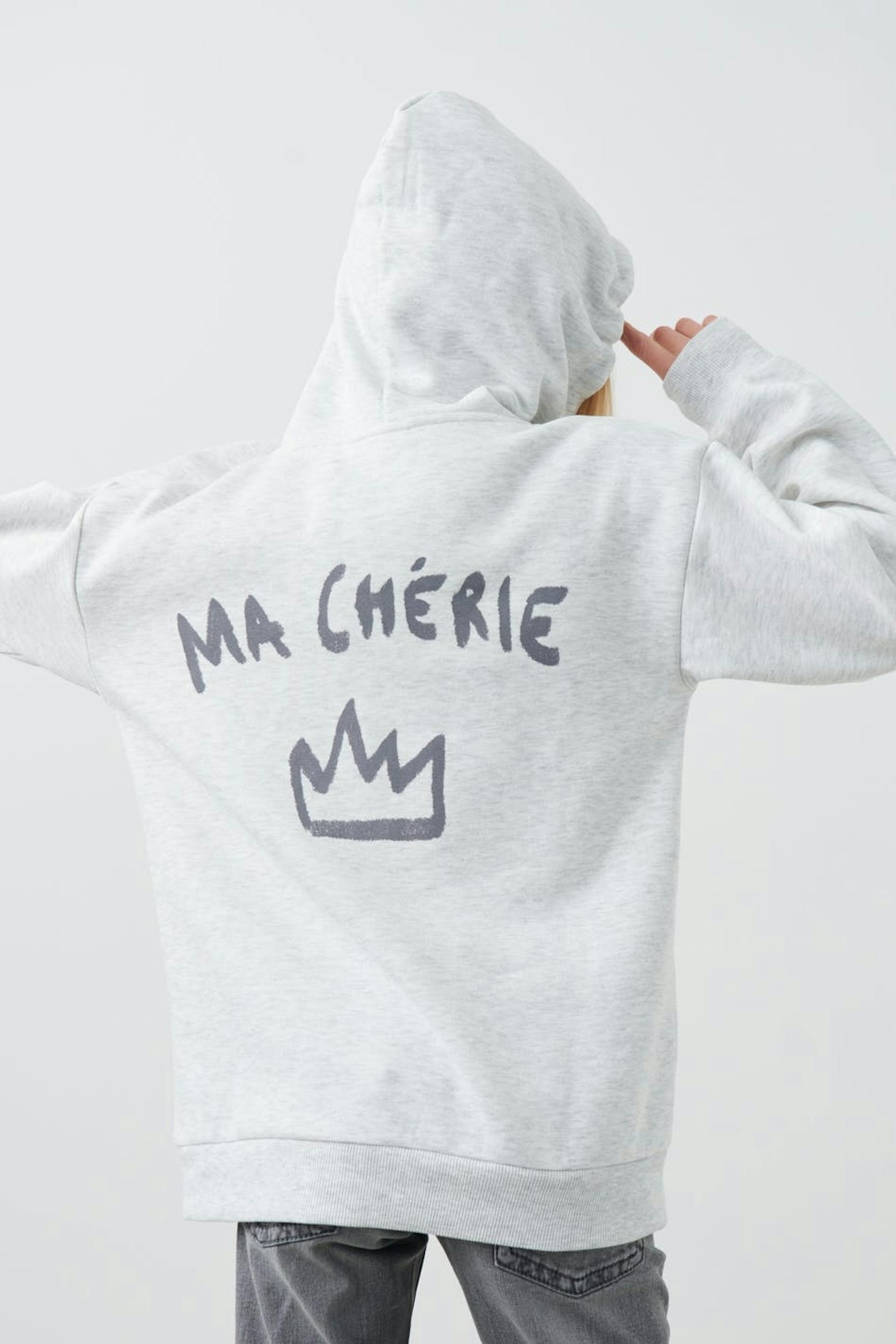 Hoodie aus weichem Trikot mit einer Oversize-Passform. Der Hoodie ist grau und hat Druck auf der Rückseite und auf der Brust. Er hat Kapuze mit Kordelzug und Bündchen an den Ärmelenden und an der Unterkante.