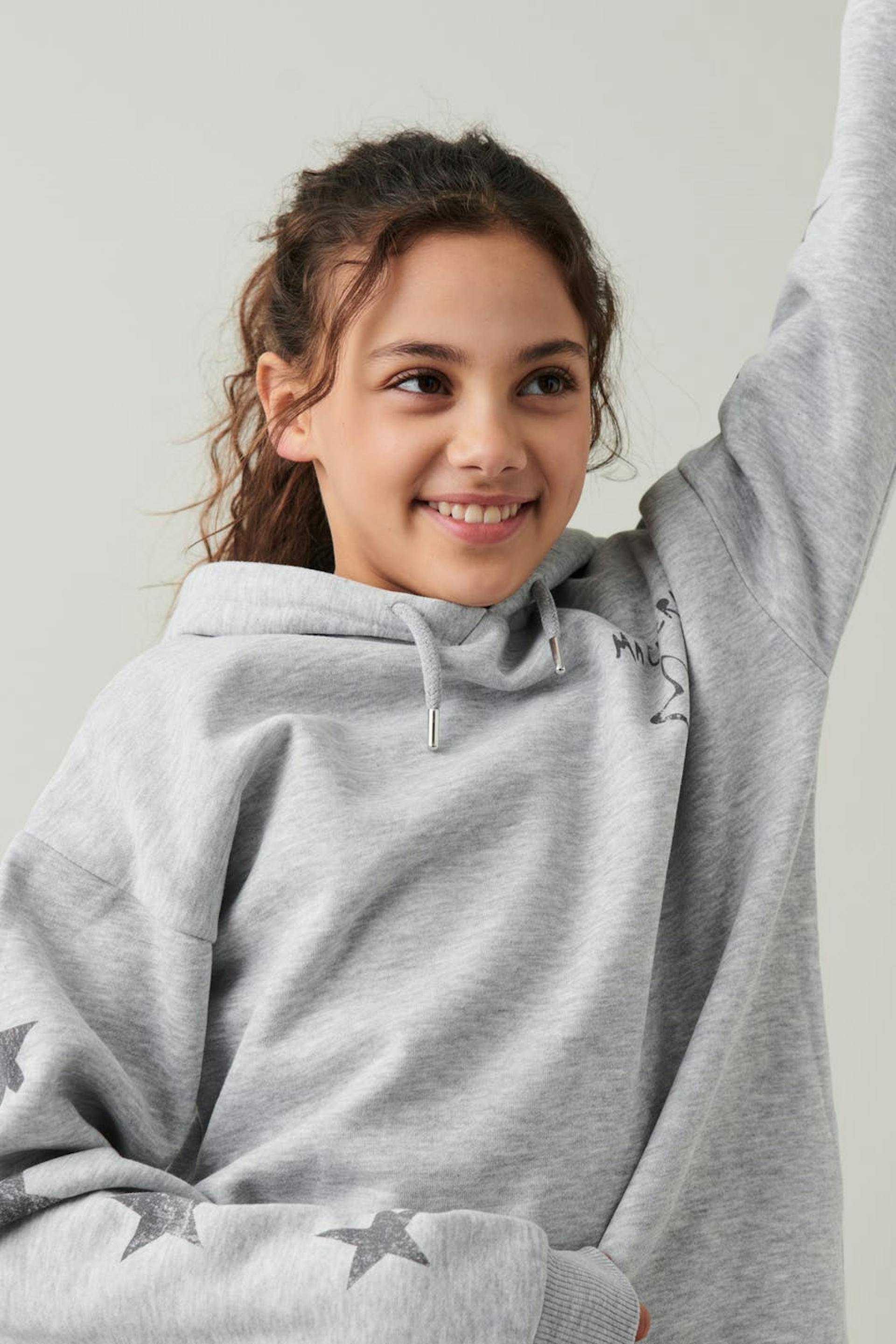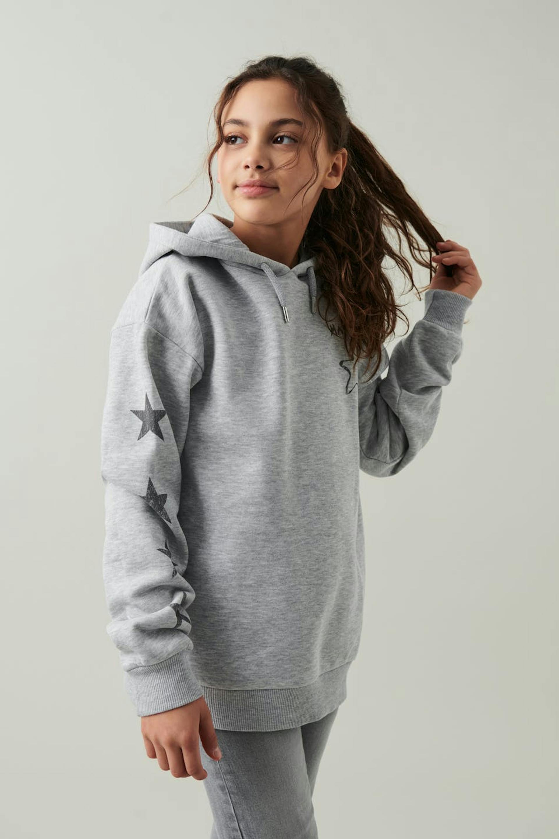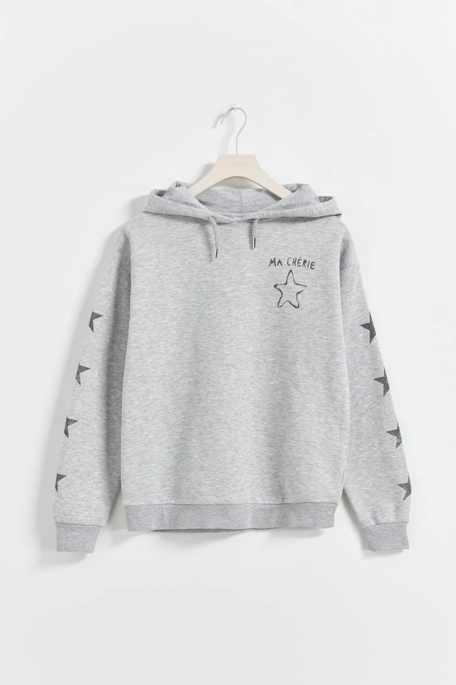 Hoodie aus weichem Trikot mit Sternen vorne und an den Ärmeln. Der Hoodie ist grau und hat eine Oversize-Passform. Er hat Druck auf der Rückseite und auf der Brust, Kapuze mit Kordelzug und Bündchen an den Ärmelenden und an der Unterkante.