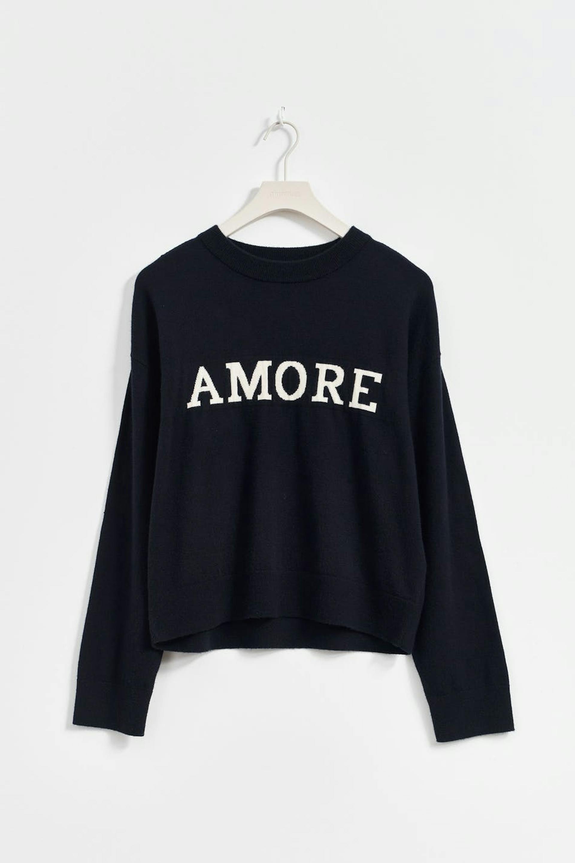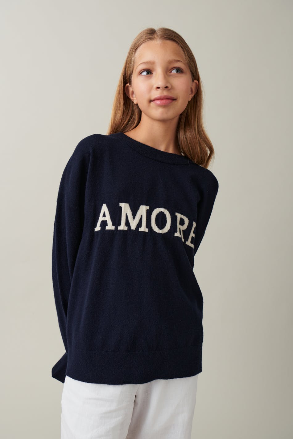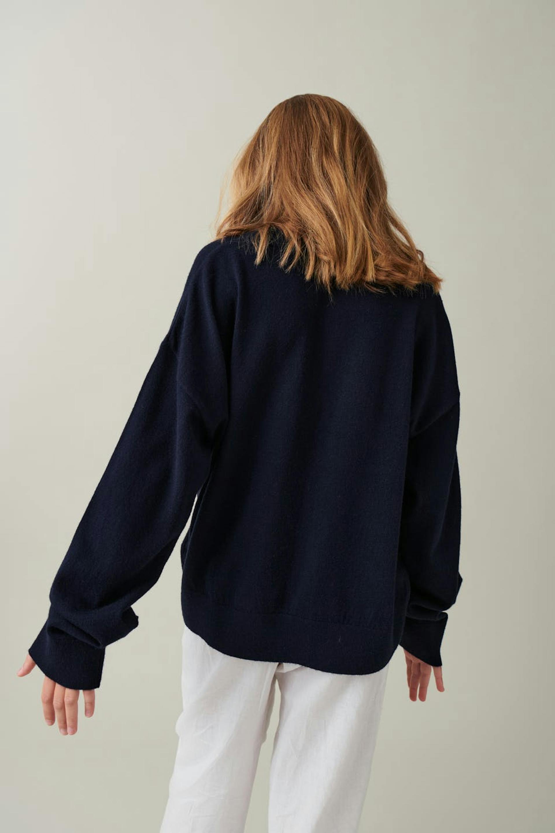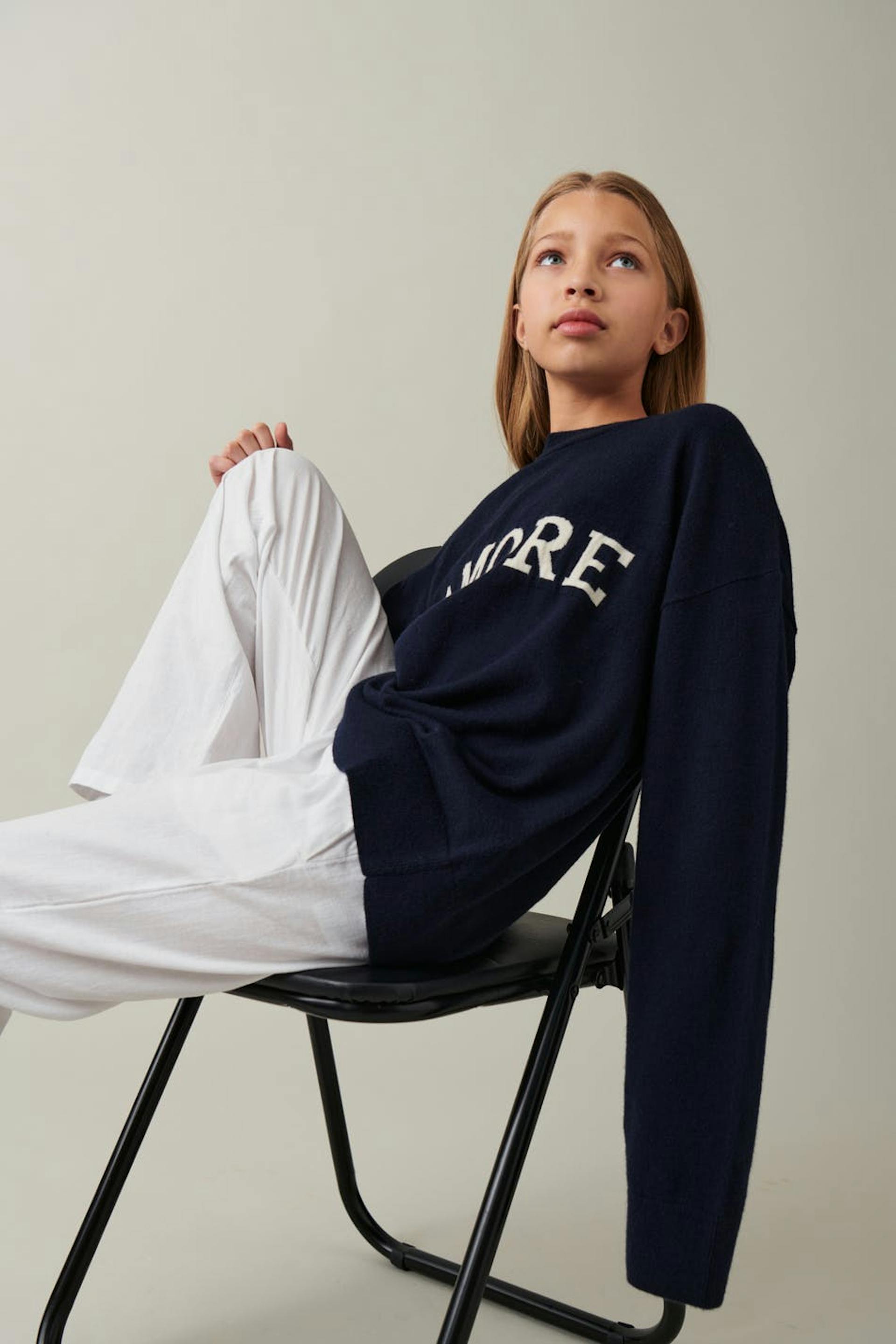 Strickpullover mit einer Oversize-Passform. Der Pullover ist marine und blau und hat gestickten Text vorne. Er hat eine normale Passform.