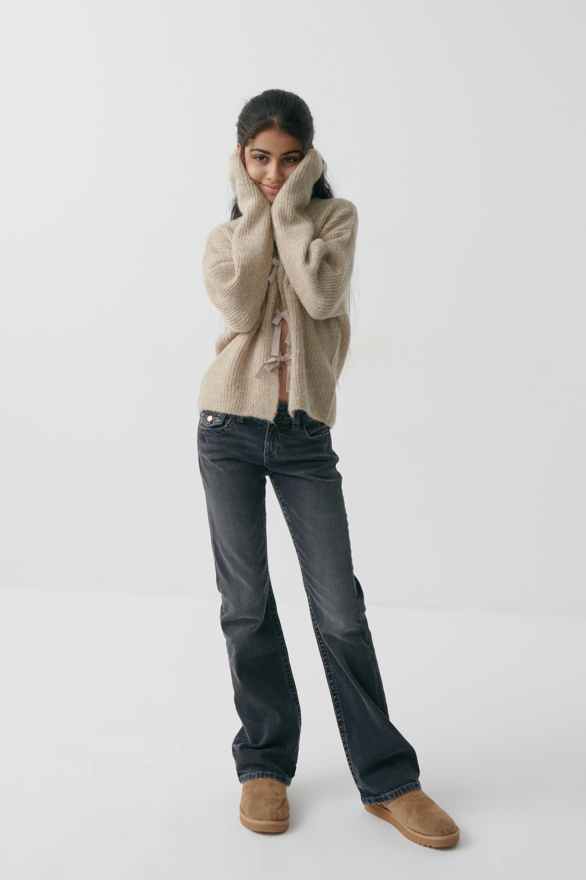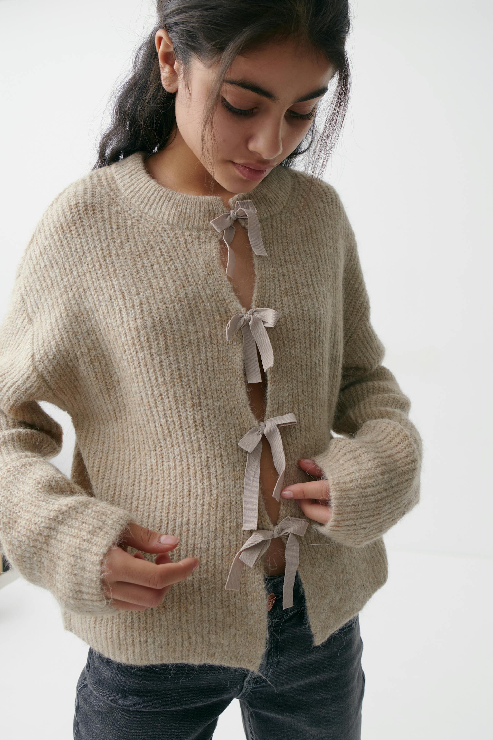 Strickjacke aus Wollmischung mit Rundhalsausschnitt. Der Cardigan ist beige und hat Schnürverschluss mit Bogen vorne. Er hat langen Ärmel und normale Passform.