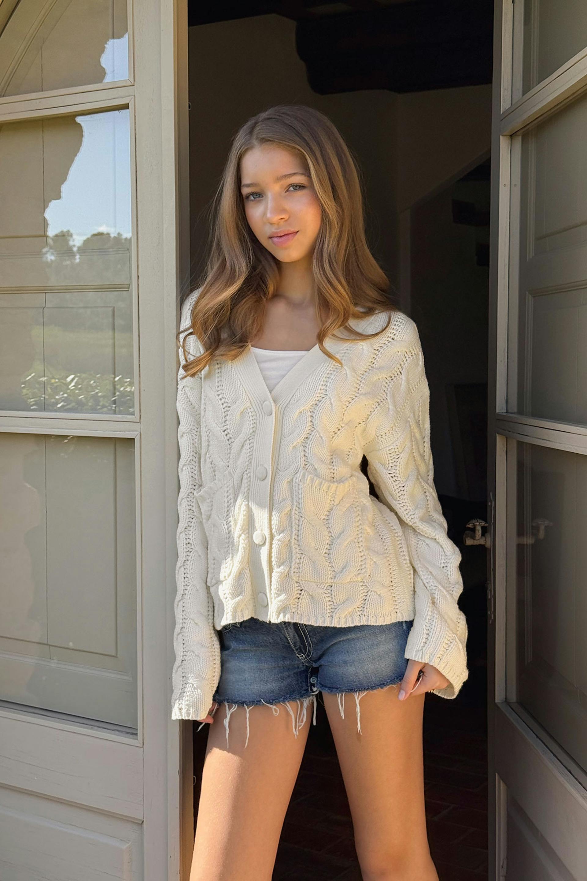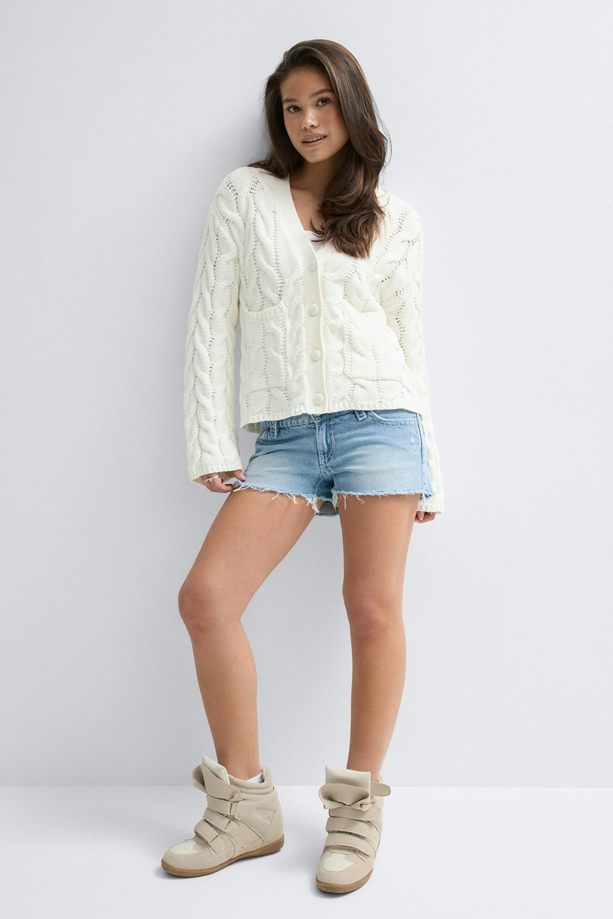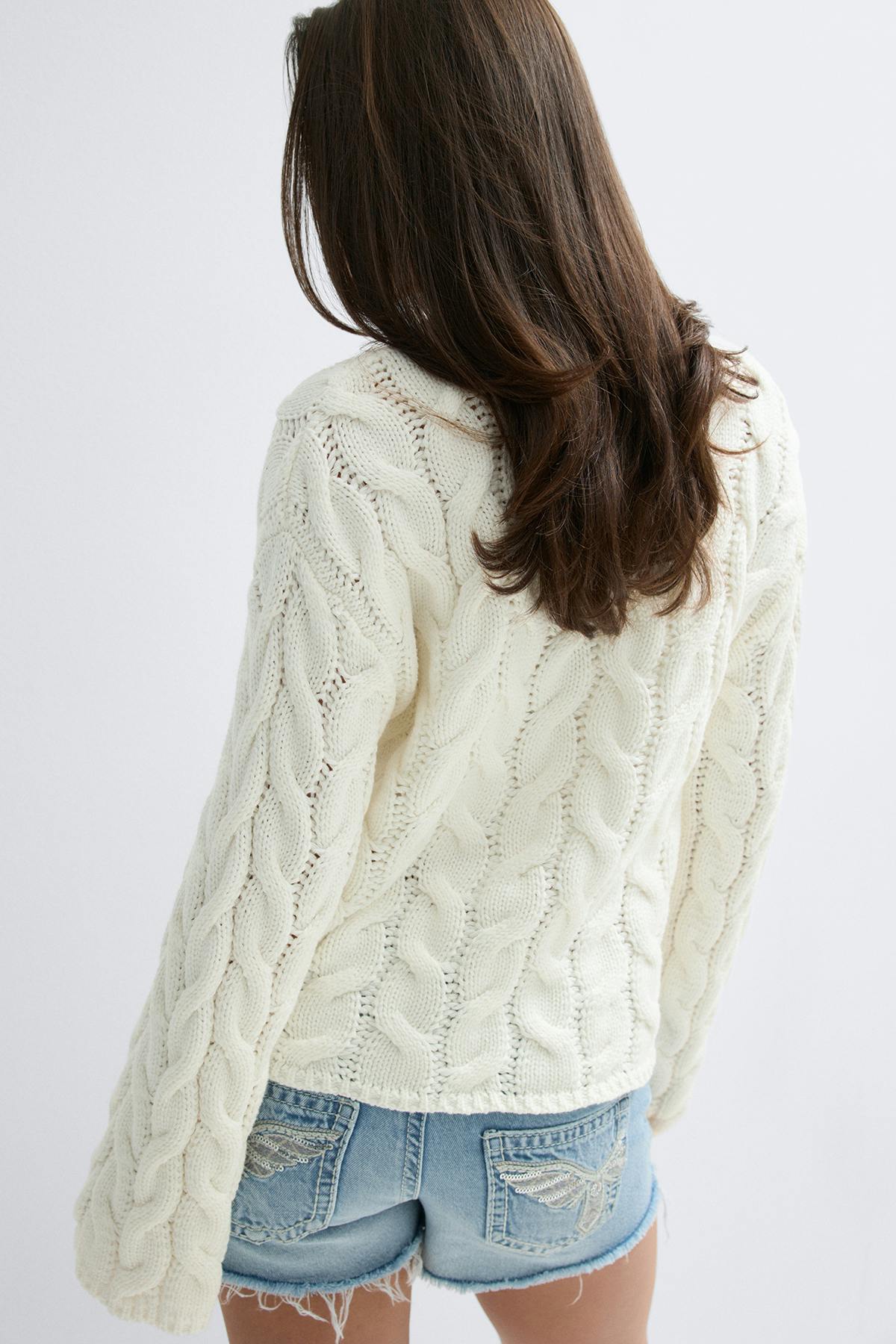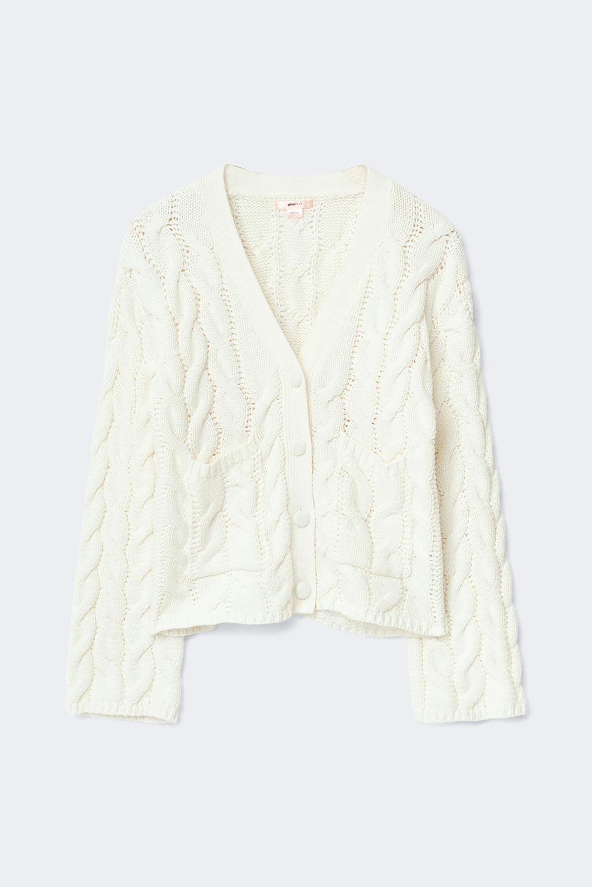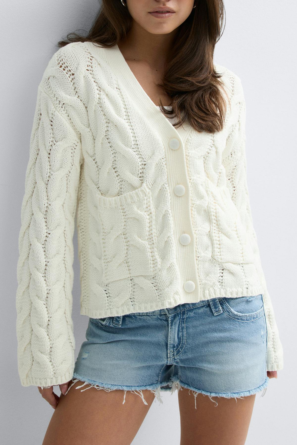 Im Zopfmuster gestrickte Strickjacke mit langen Ärmeln. Die Strickjacke ist weiβ und hat Knöpfung vorne. Sie hat V-Ausschnitt und normale Größe.