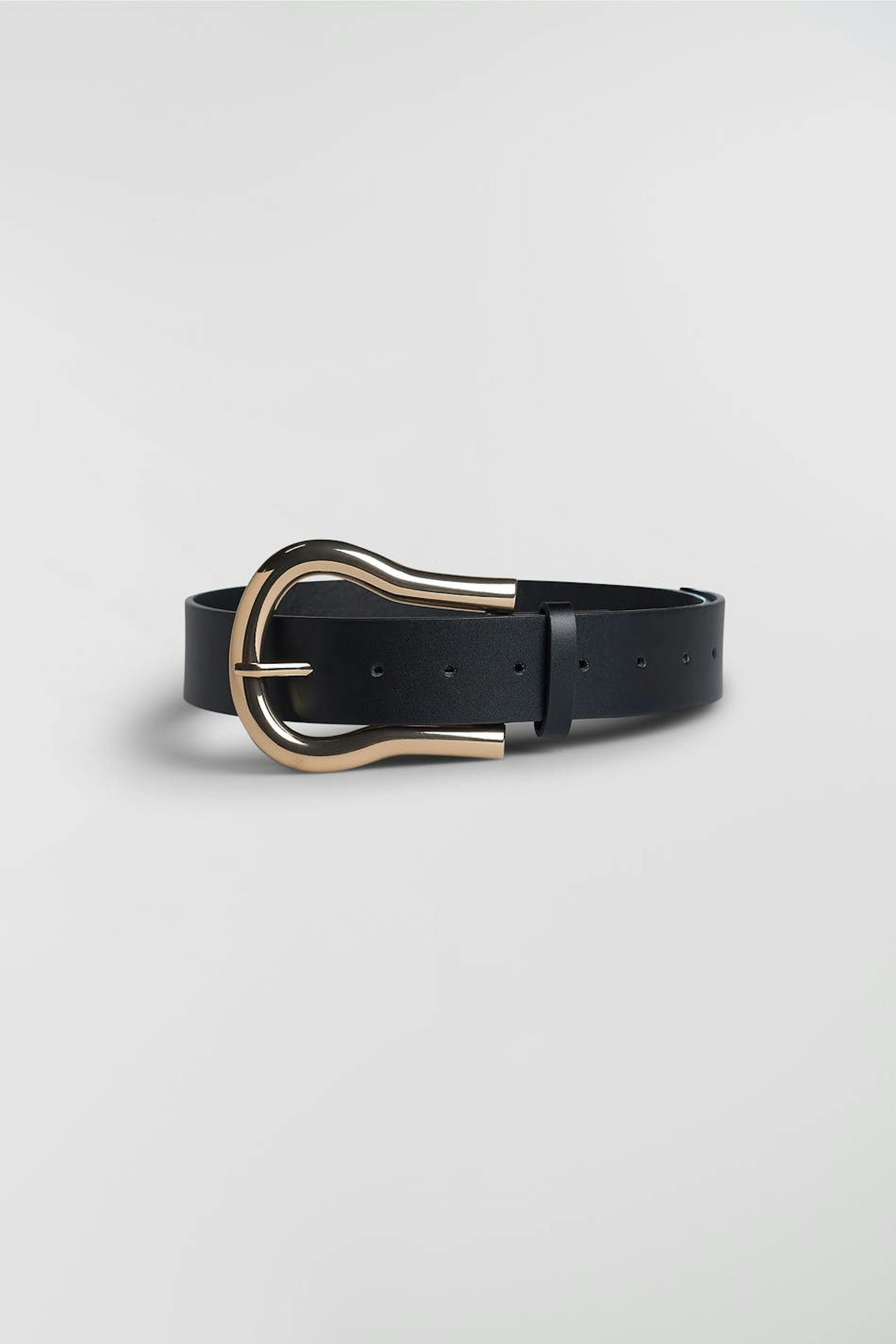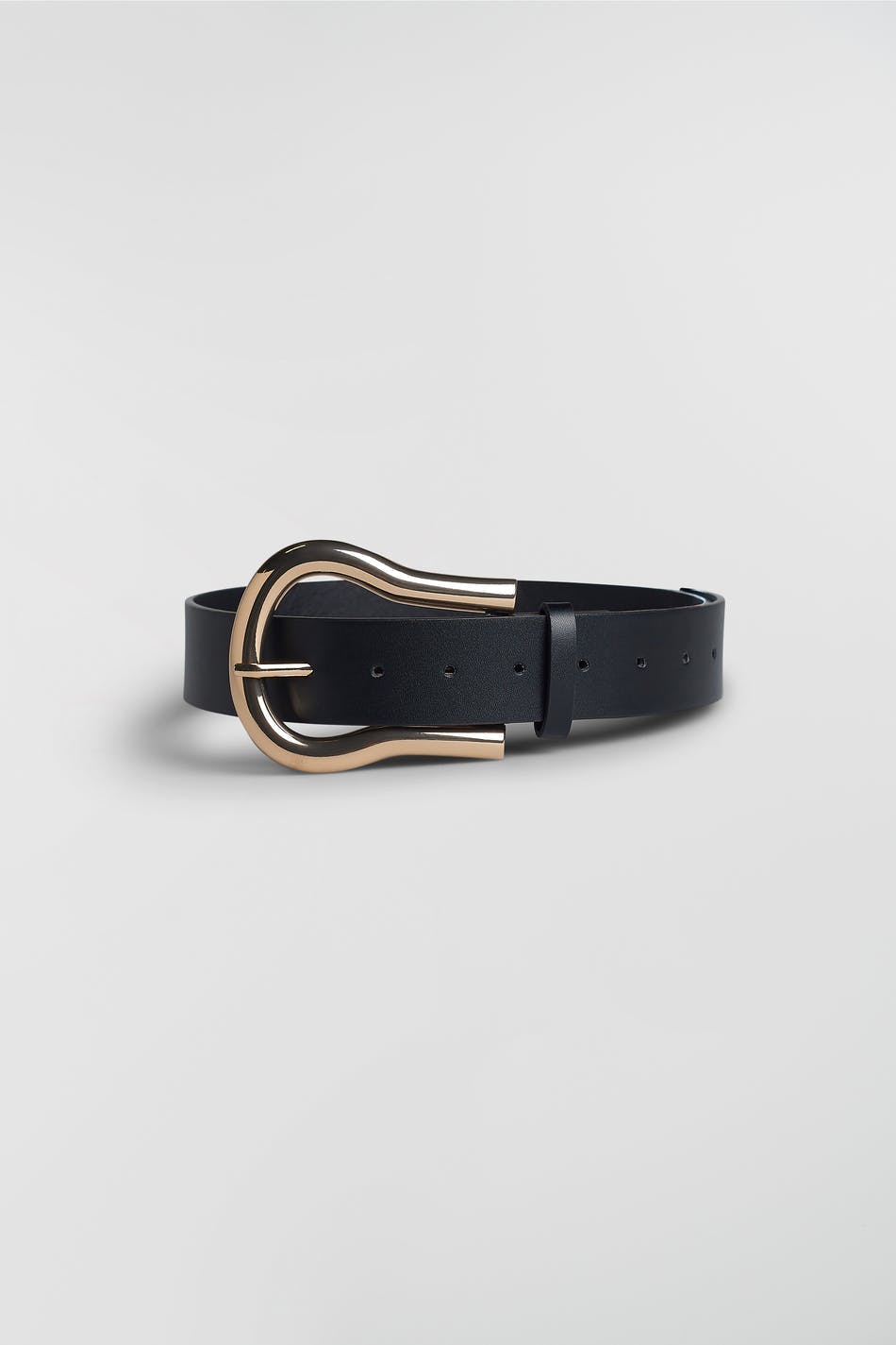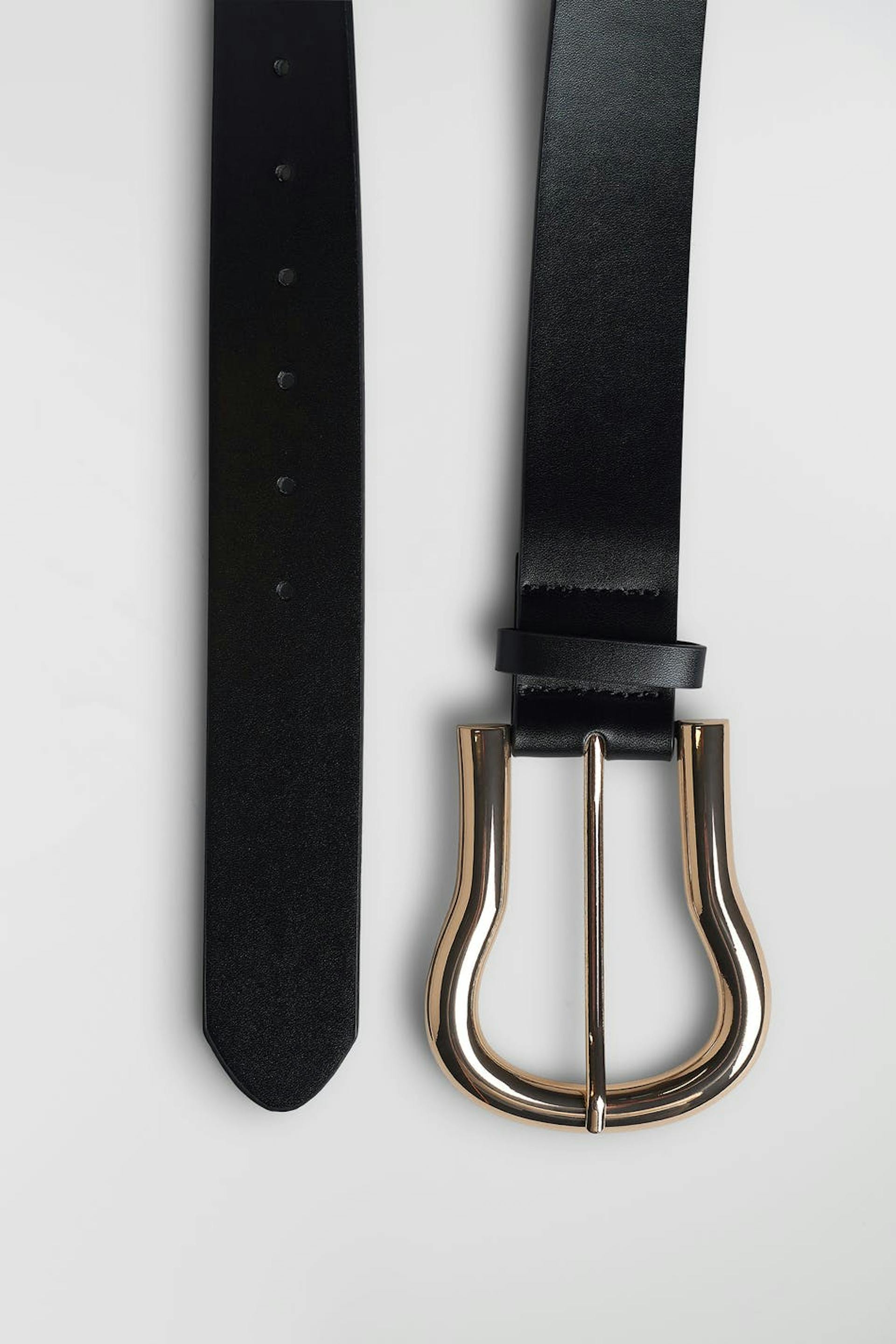 Taillengürtel mit einer goldfarbenen Schnalle. Der Gürtel ist schwarz. Er ist hergestellt aus PU.