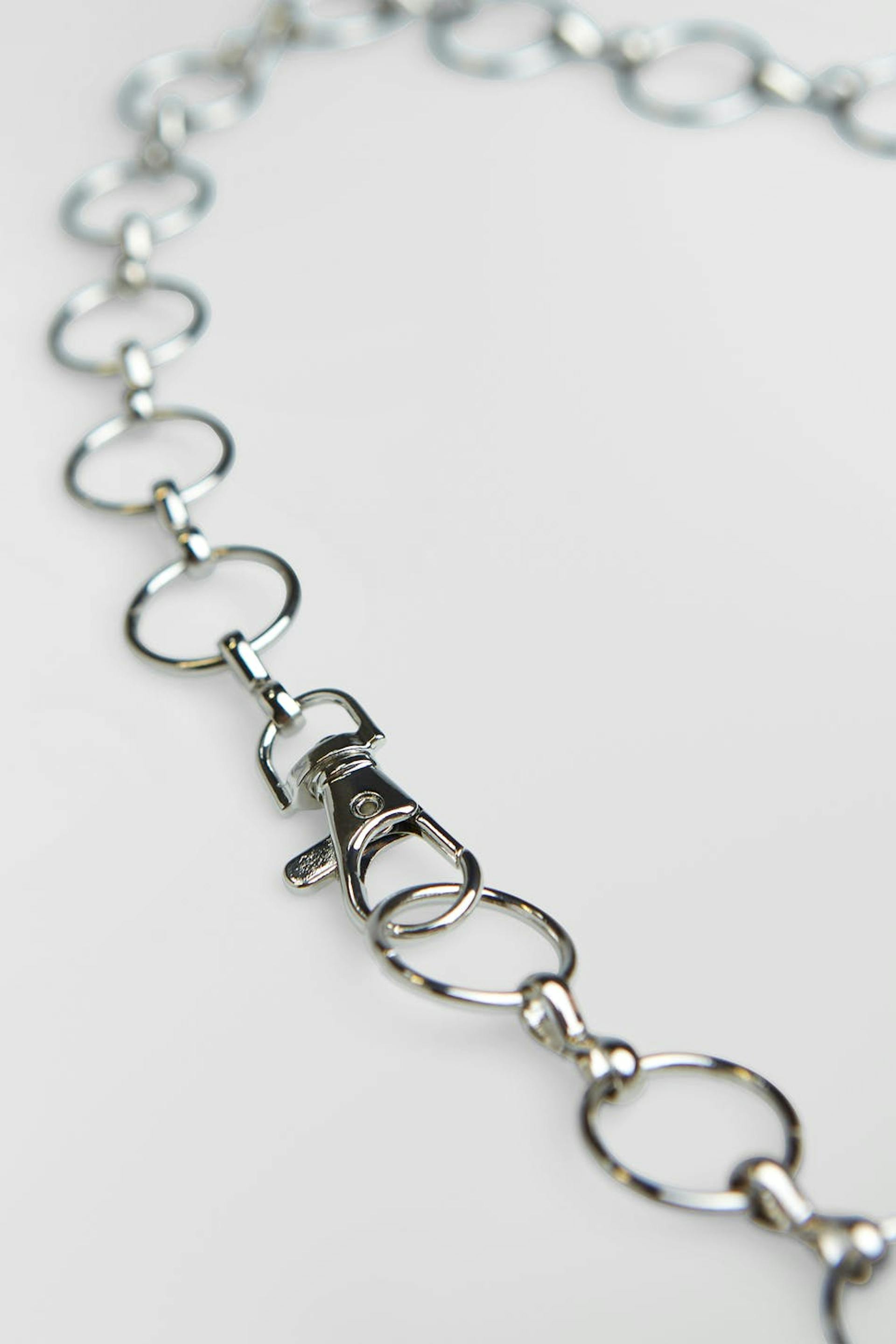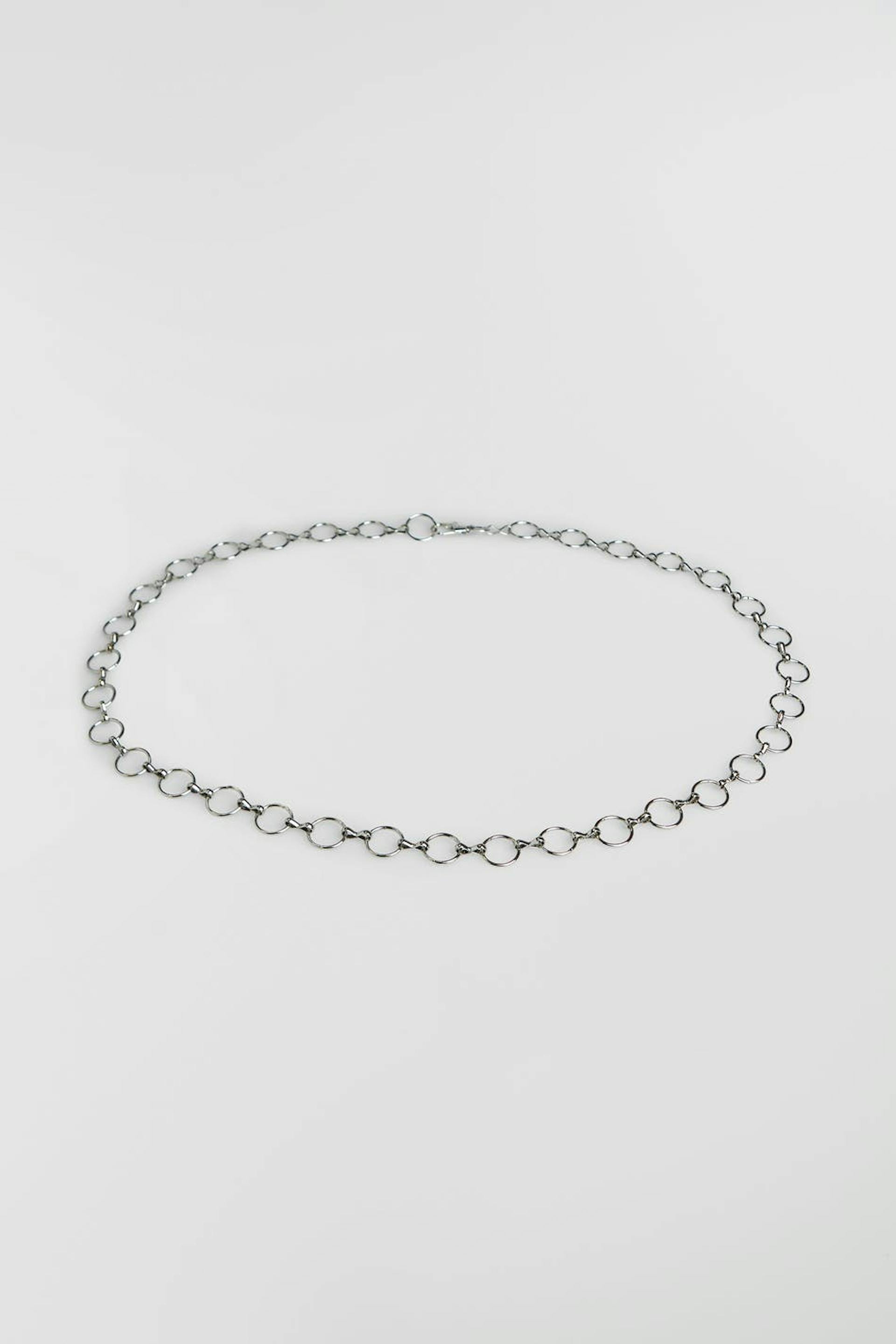 Gürtel mit einer Kette. Der Gürtel ist silbern.
