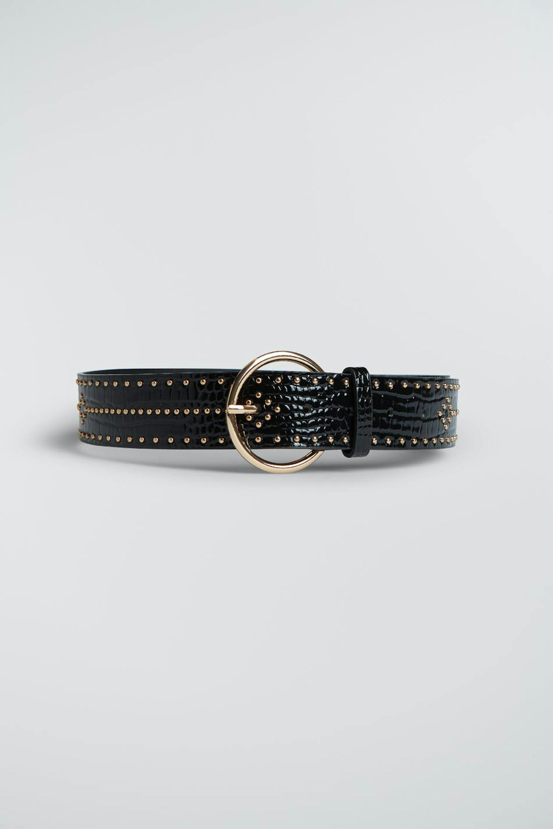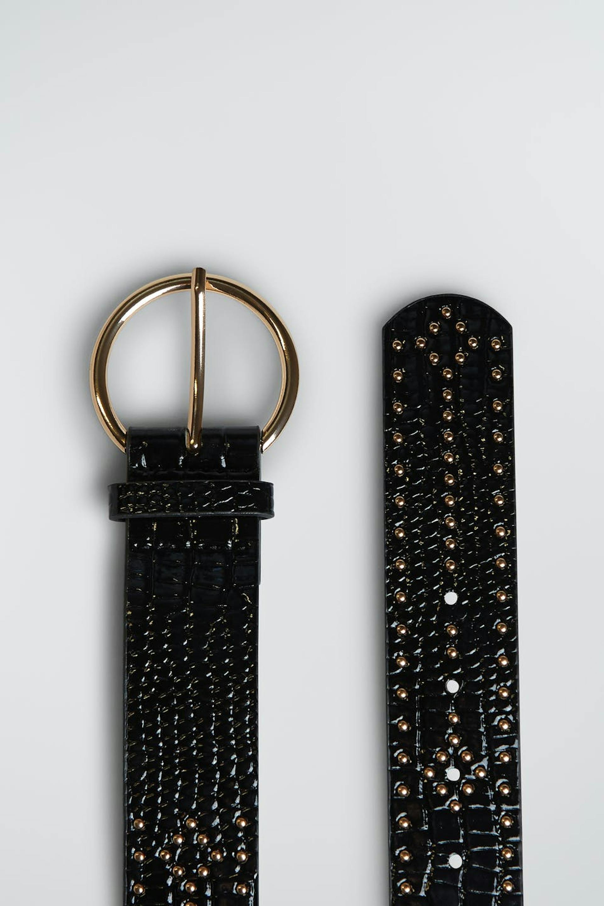Gürtel mit einer runden Schnalle. Der Gürtel ist schwarz und hat kleine, goldfarbene Stecker.