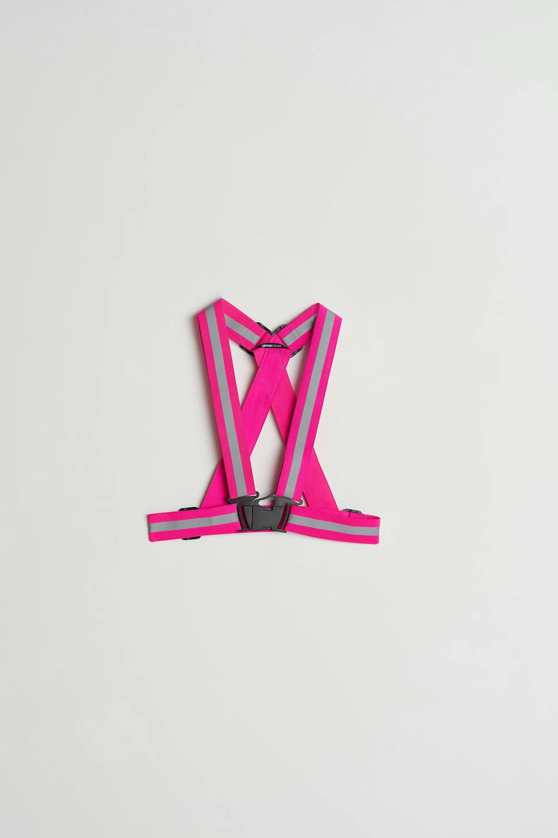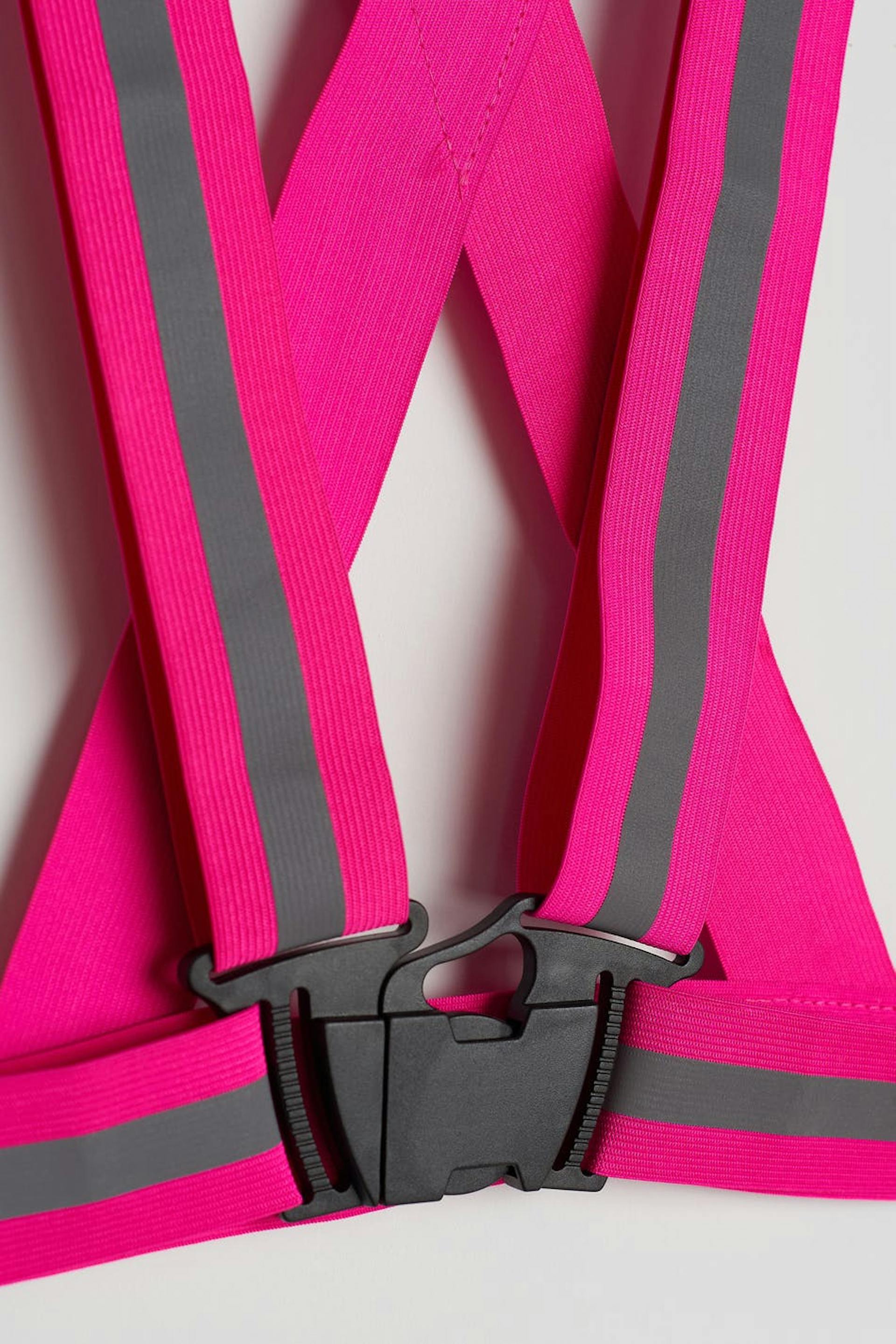 Gürtel mit reflektierenden Elementen. Der Gürtel ist rosa und hat eine Schnalle vorne. Er hat Träger in der Taille und Schulterträger am Rücken.