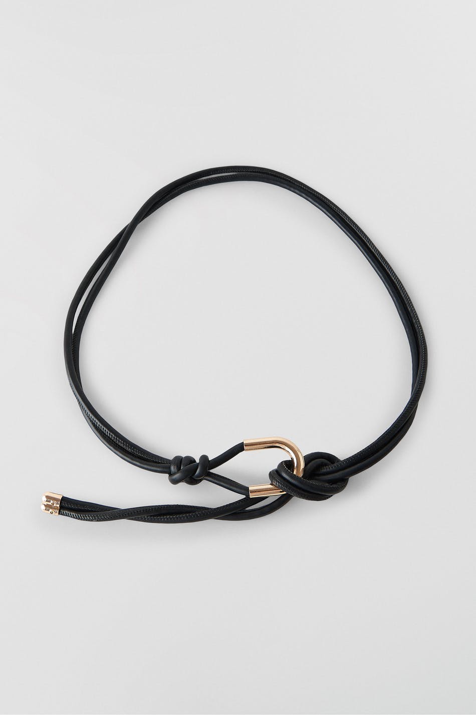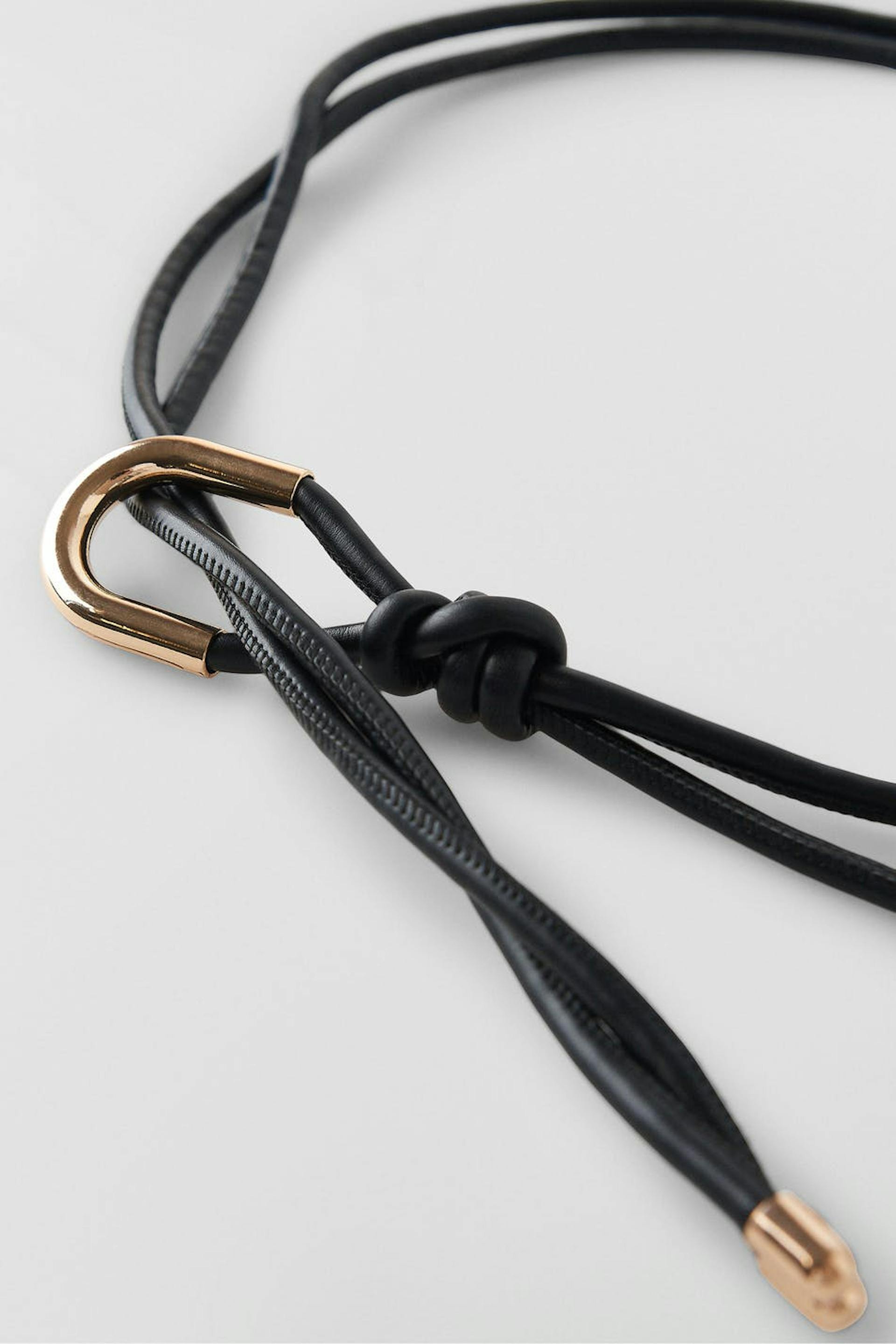 Gürtel mit einem goldfarbenen Metall-Detail. Der Gürtel ist schwarz und hat einen einstellbaren Träger.