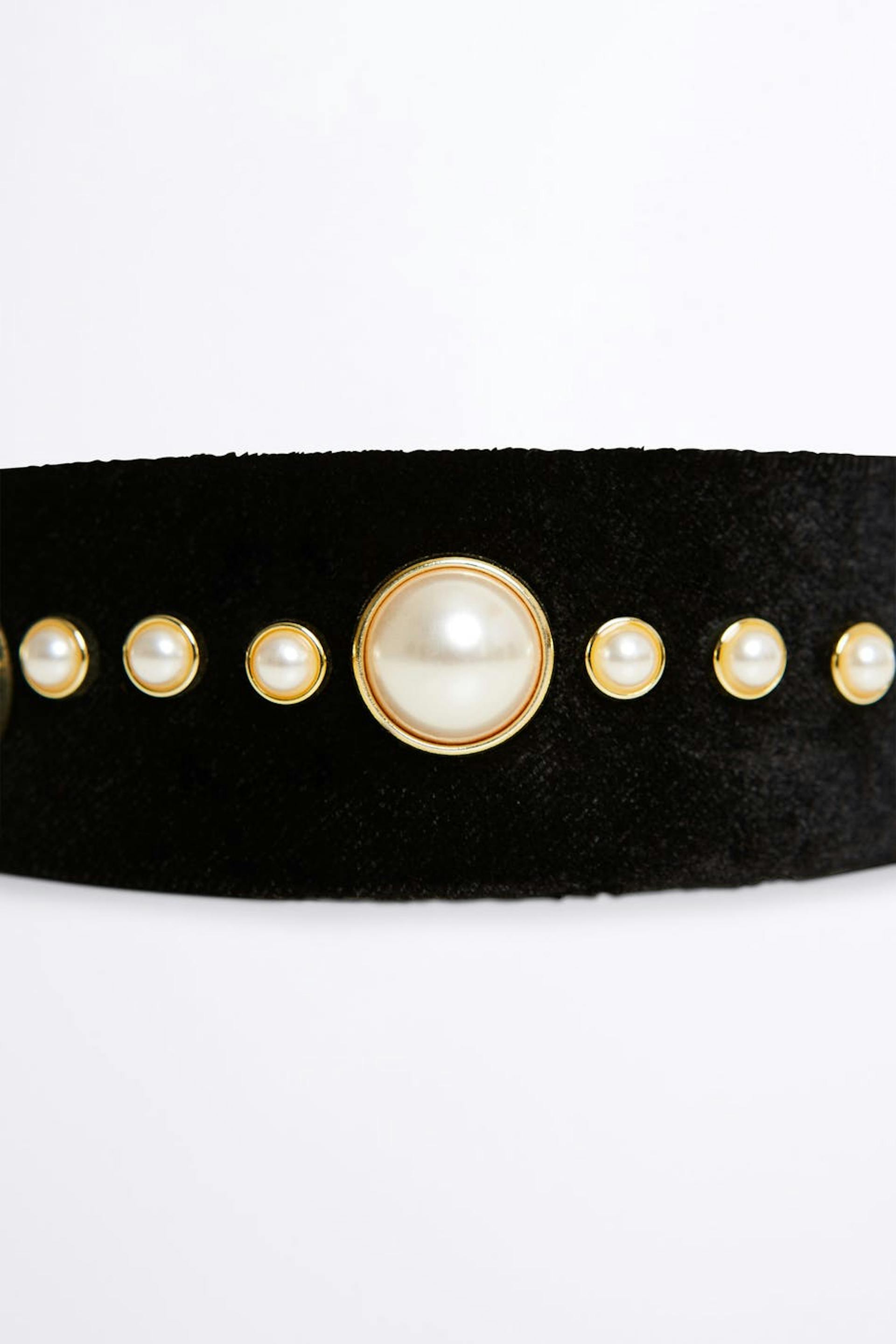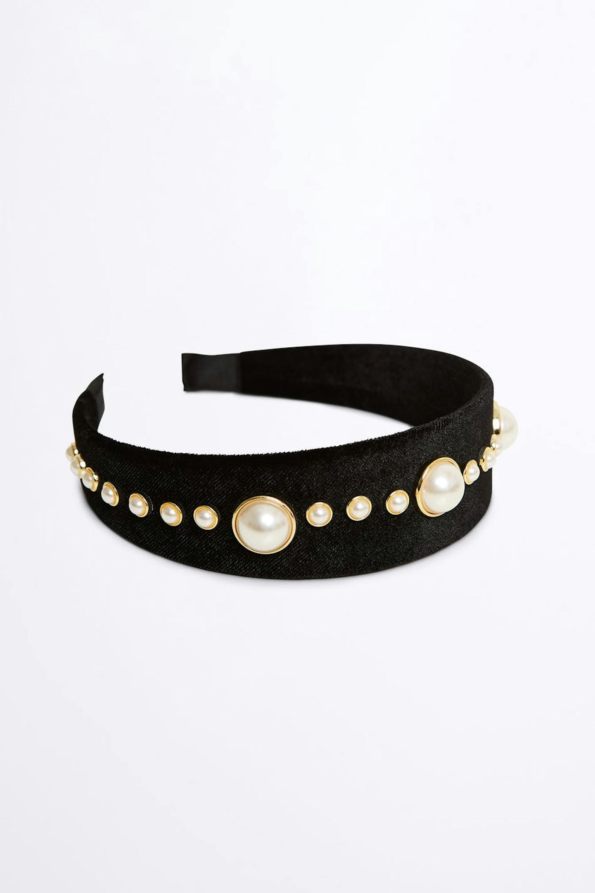 Glatter Haarreif mit Perlen-Details. Der Haarreif ist schwarz und breit.