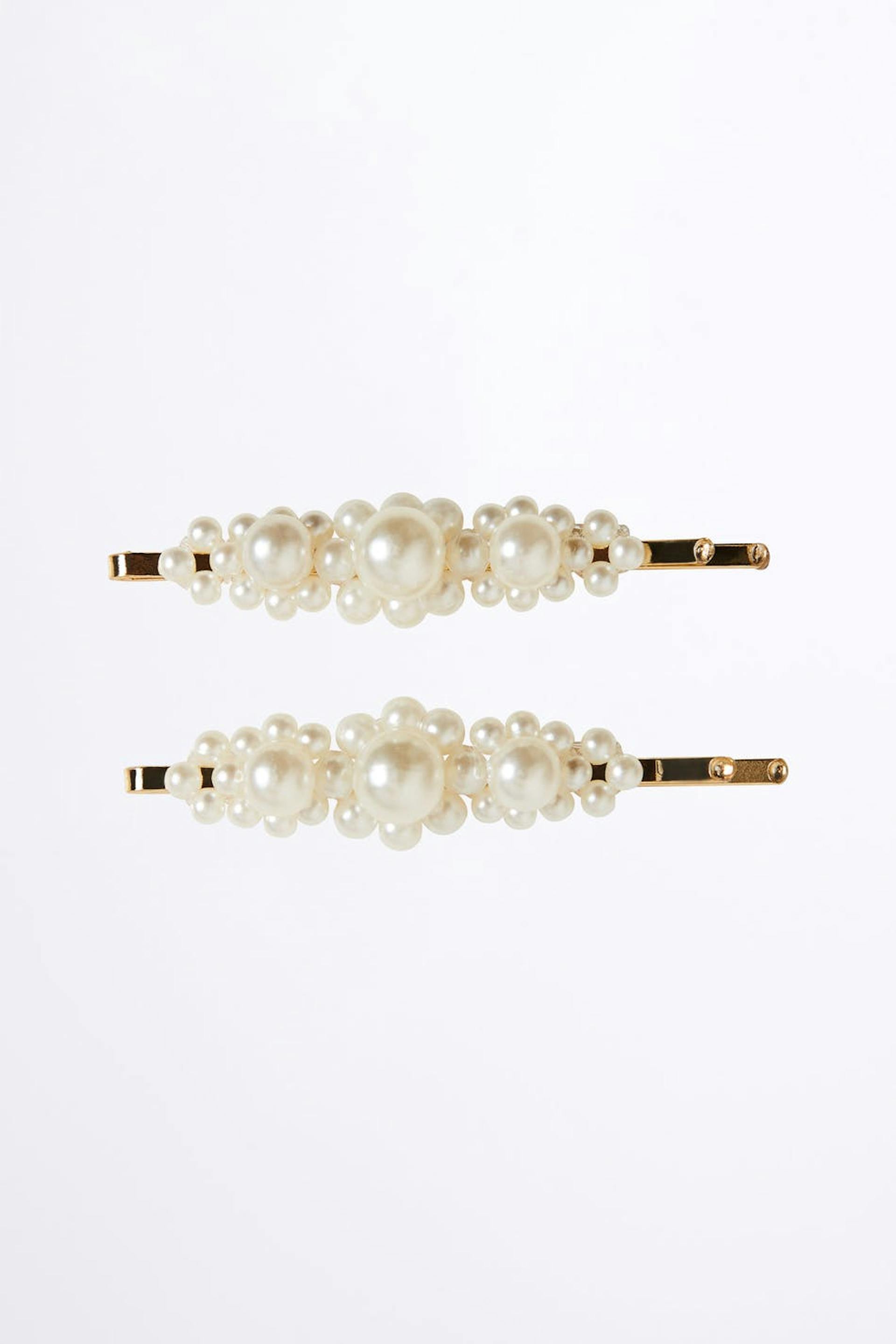 Haarnadel mit weiβen Perlen-Details oben. Das Accessoire ist goldfarben.