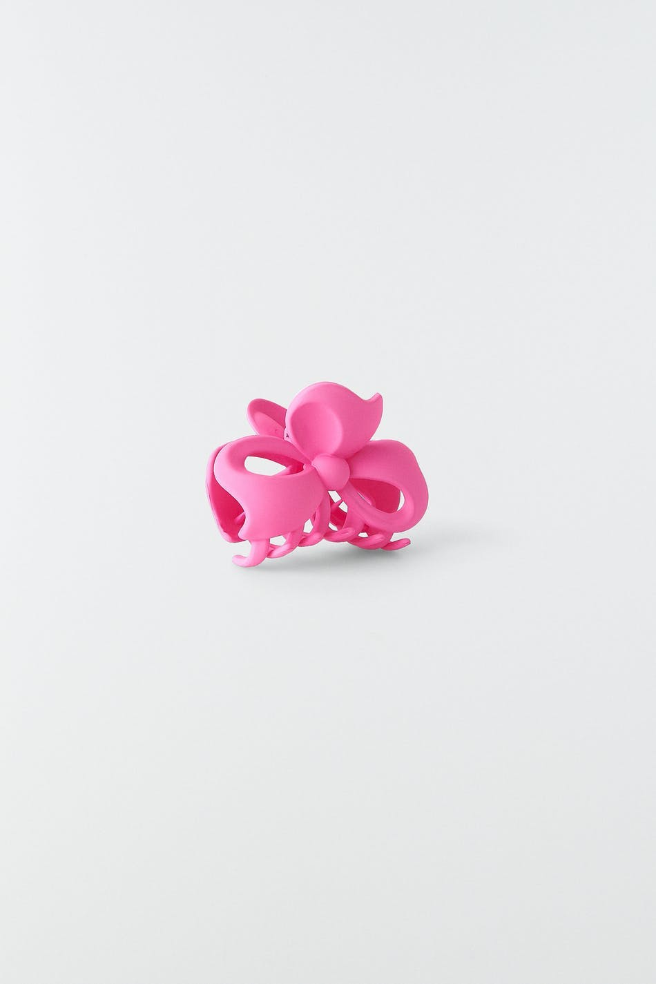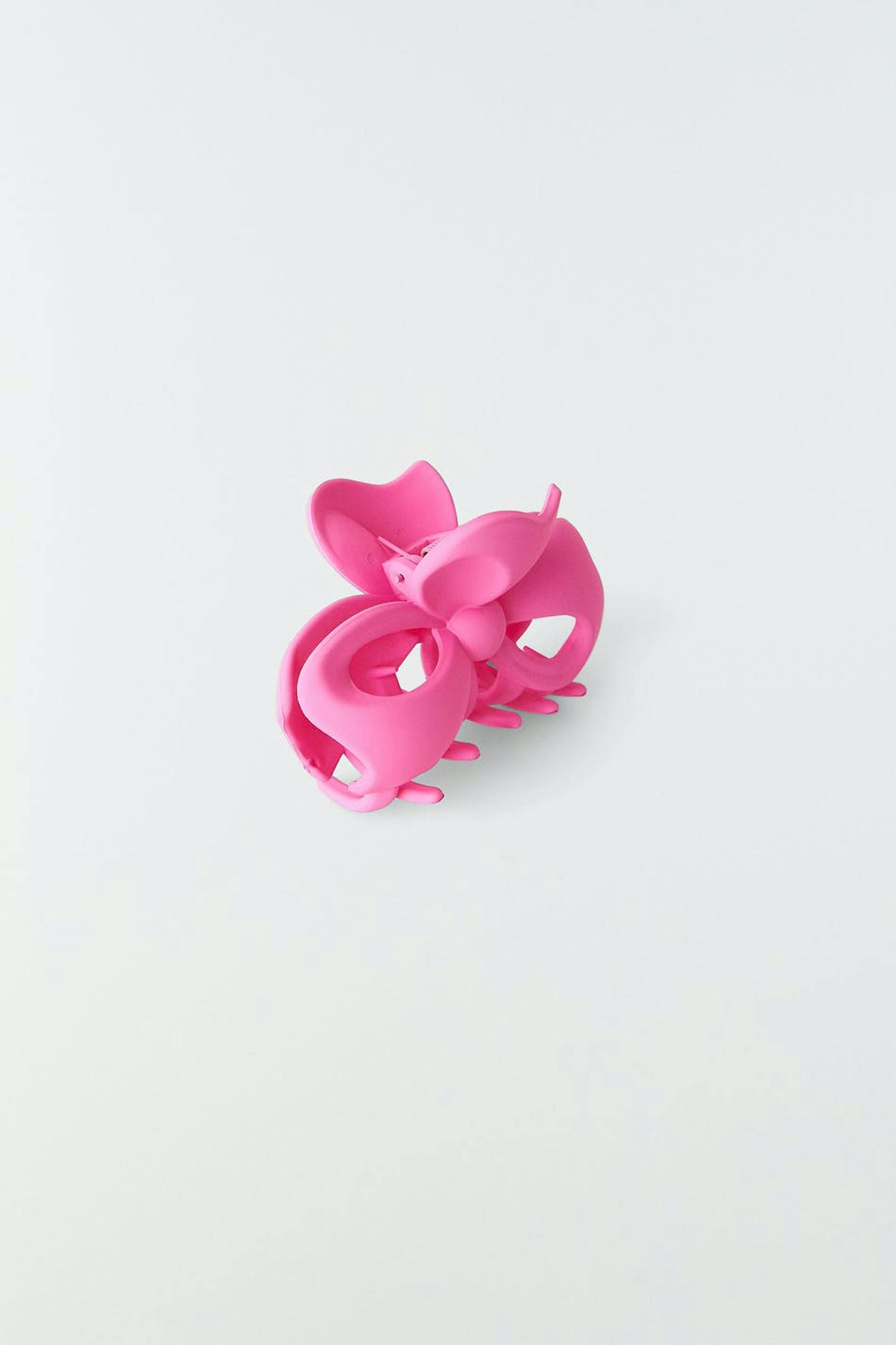 Schleifenförmiger Haargreifer. Die Haarklammer ist rosa.