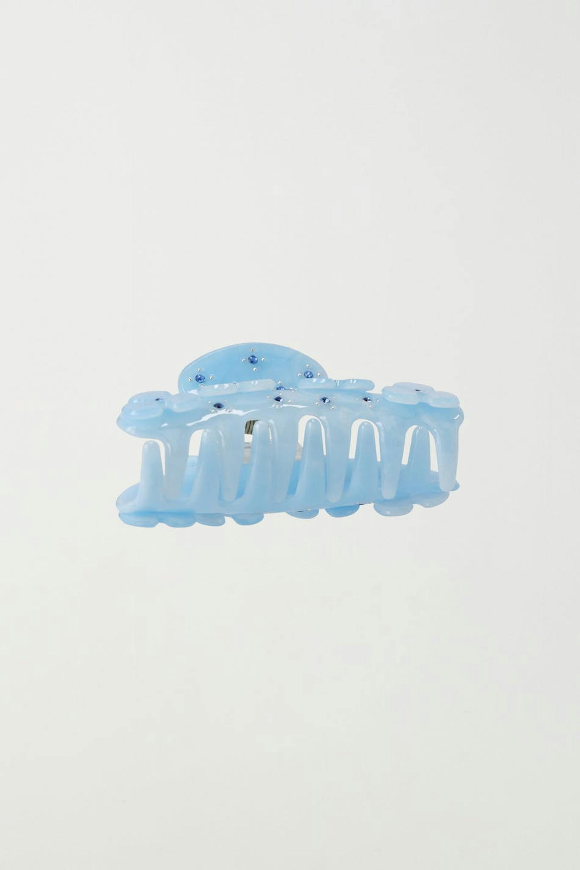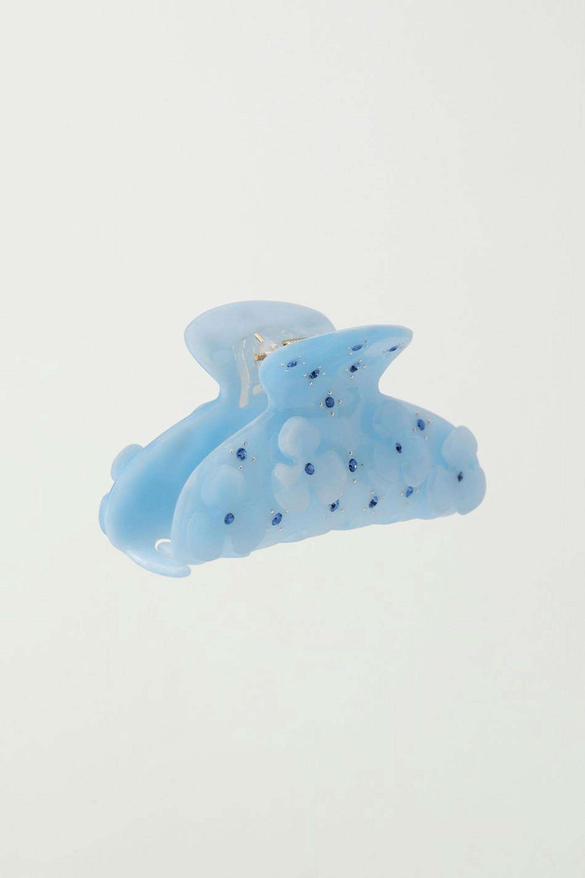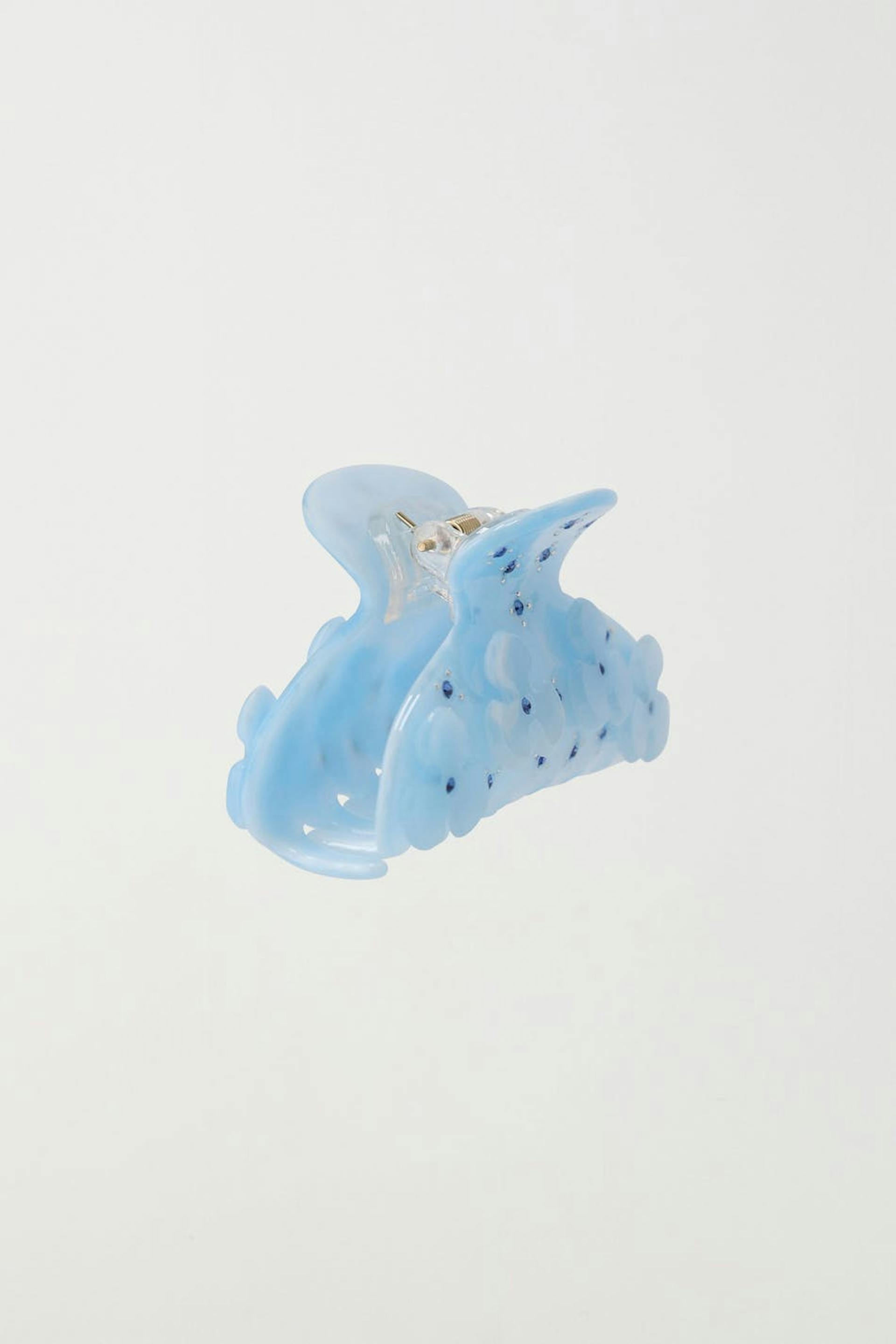 Haargreifer aus Plastik mit dekorativen Blumendetails. Die Haarklammer ist blau.