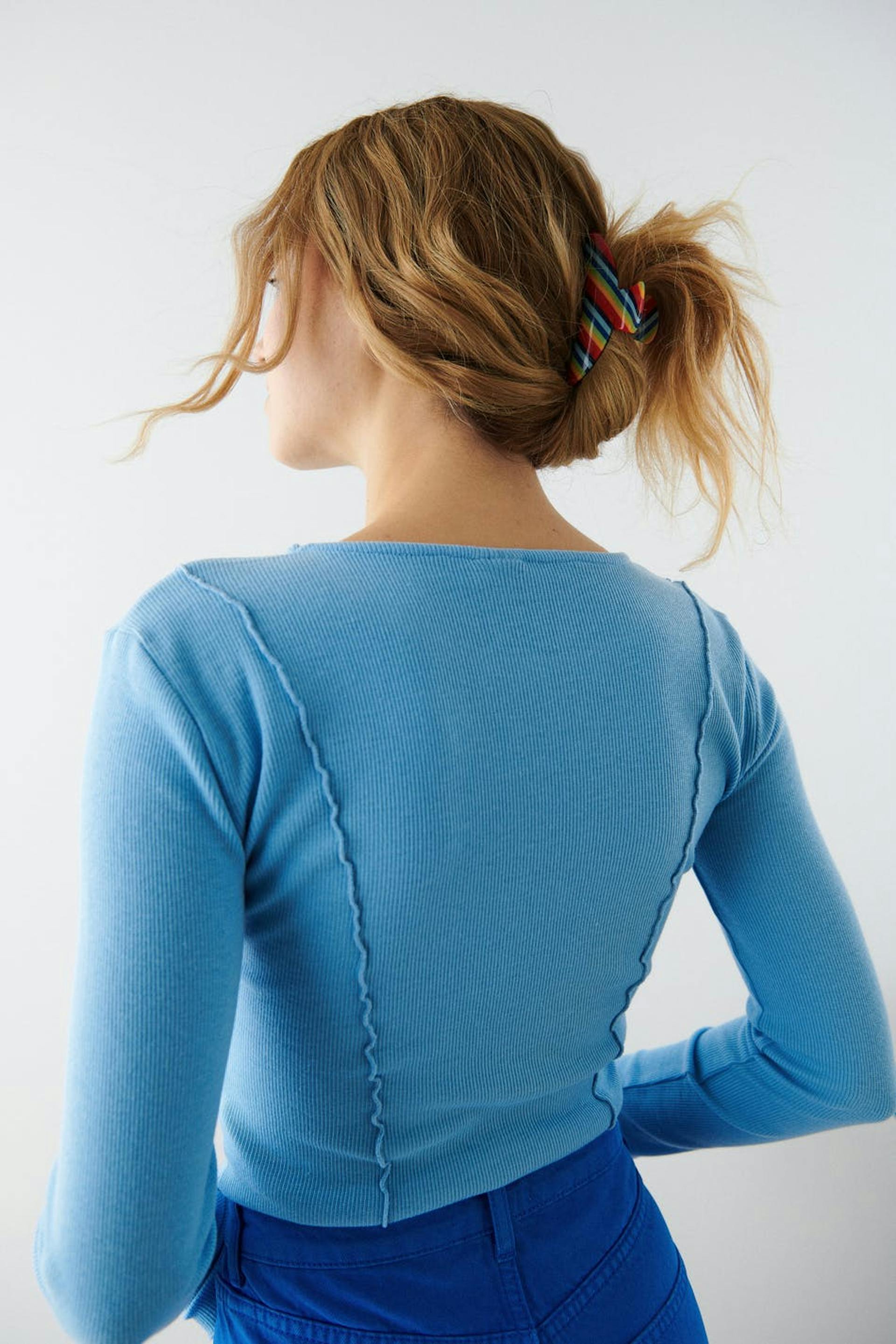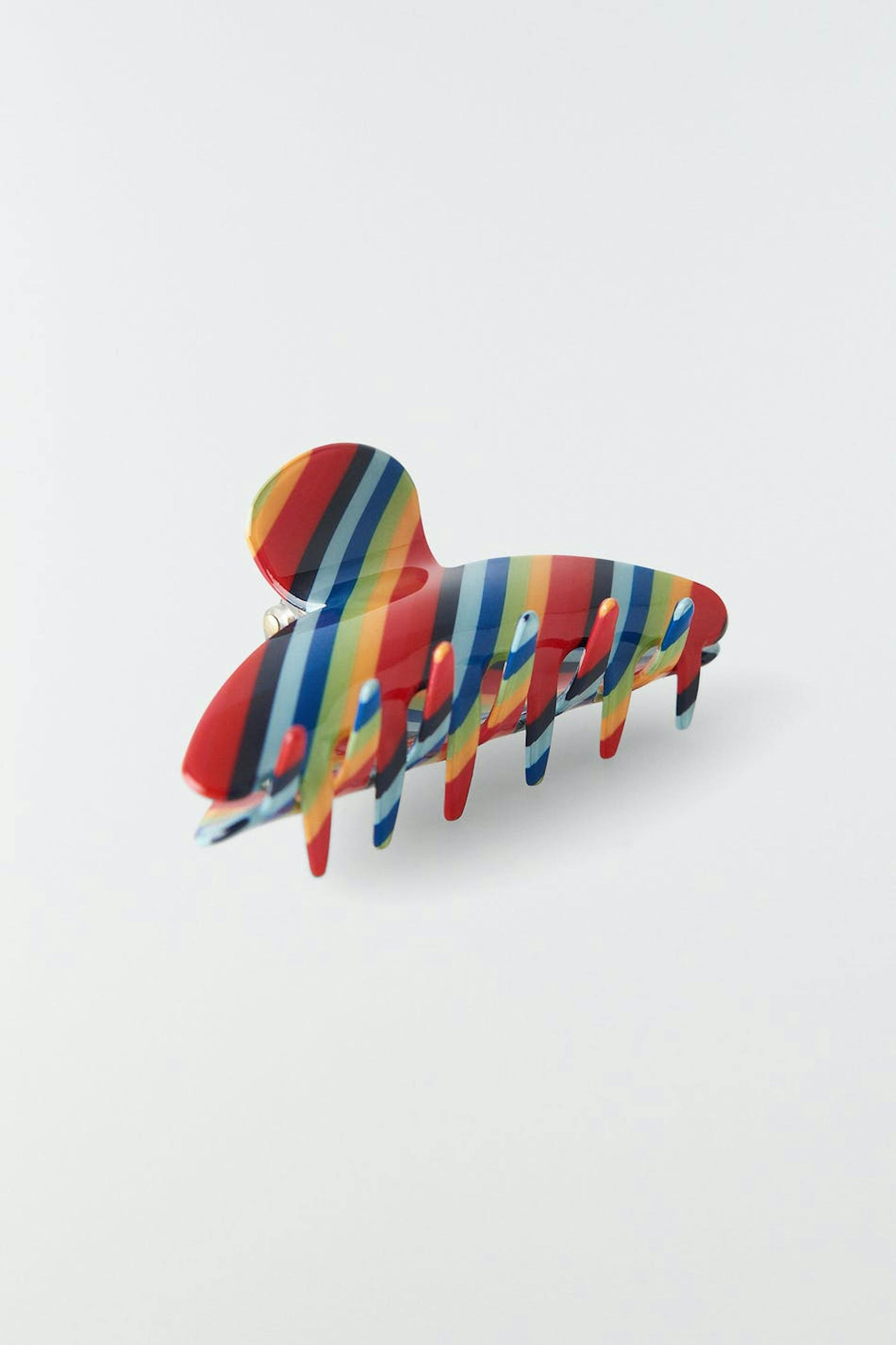 Großer Haargreifer mit gestreiftem Muster. Die Haarklammer ist rot, blau und gelb.