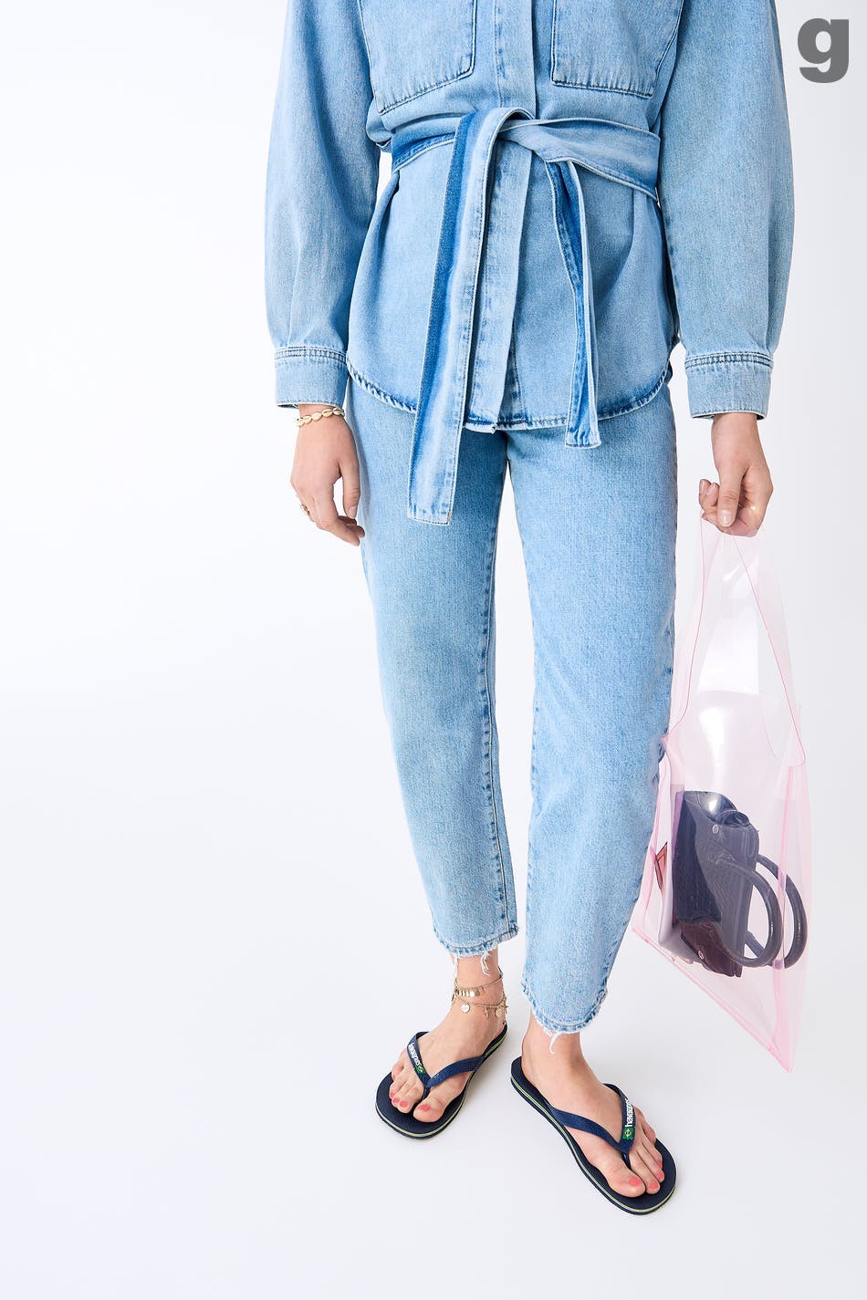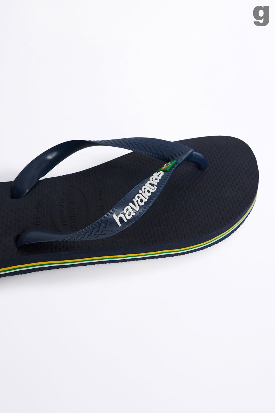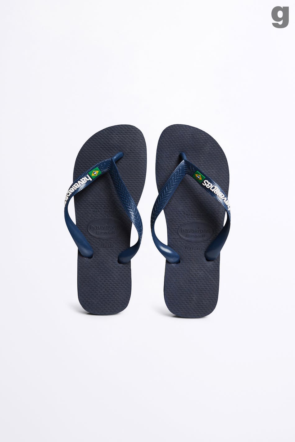 Flip-Flops von Havaianas mit dünnen Trägern mit einem Markenlogo. Die Sandalen sind marine.