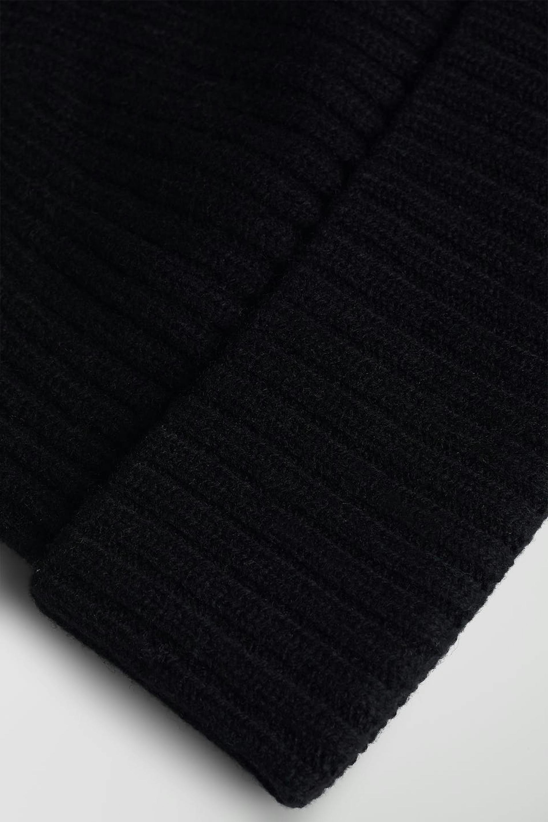 Beanie-Mütze mit einem Rippenstrick und einem gefalteten Saum. Die Beanie-Mütze ist schwarz.