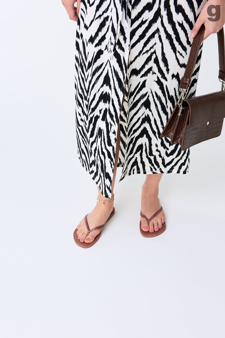 Flip-Flop mit dünnen Trägern. Die Sandale ist braun.