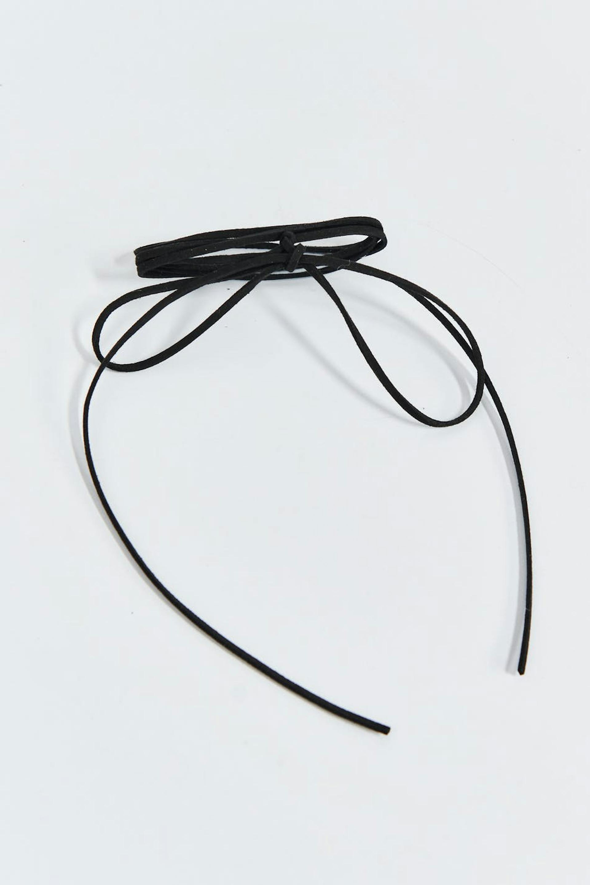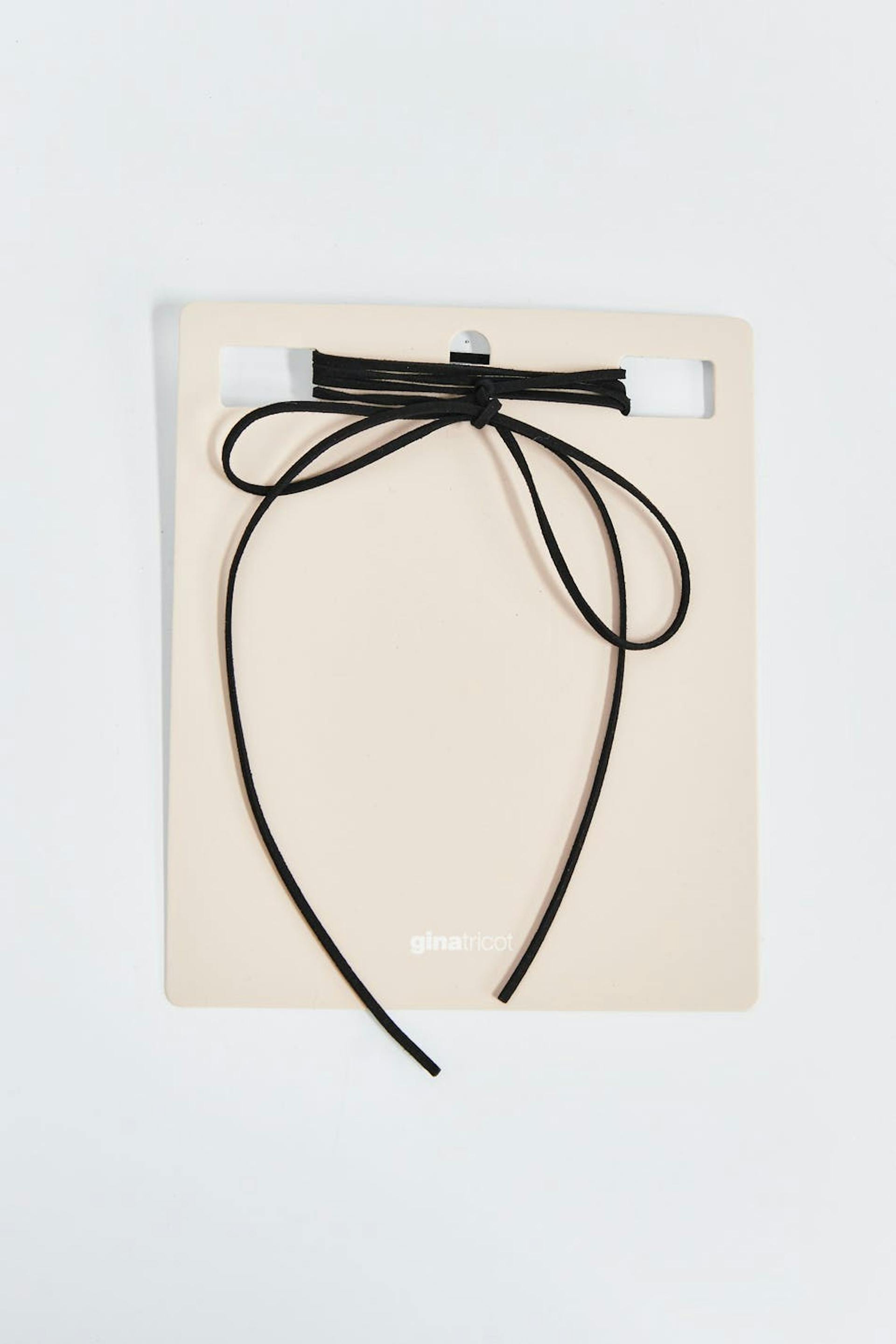 Dünne Halskette mit langen Bändern. Der Schmuck ist schwarz.