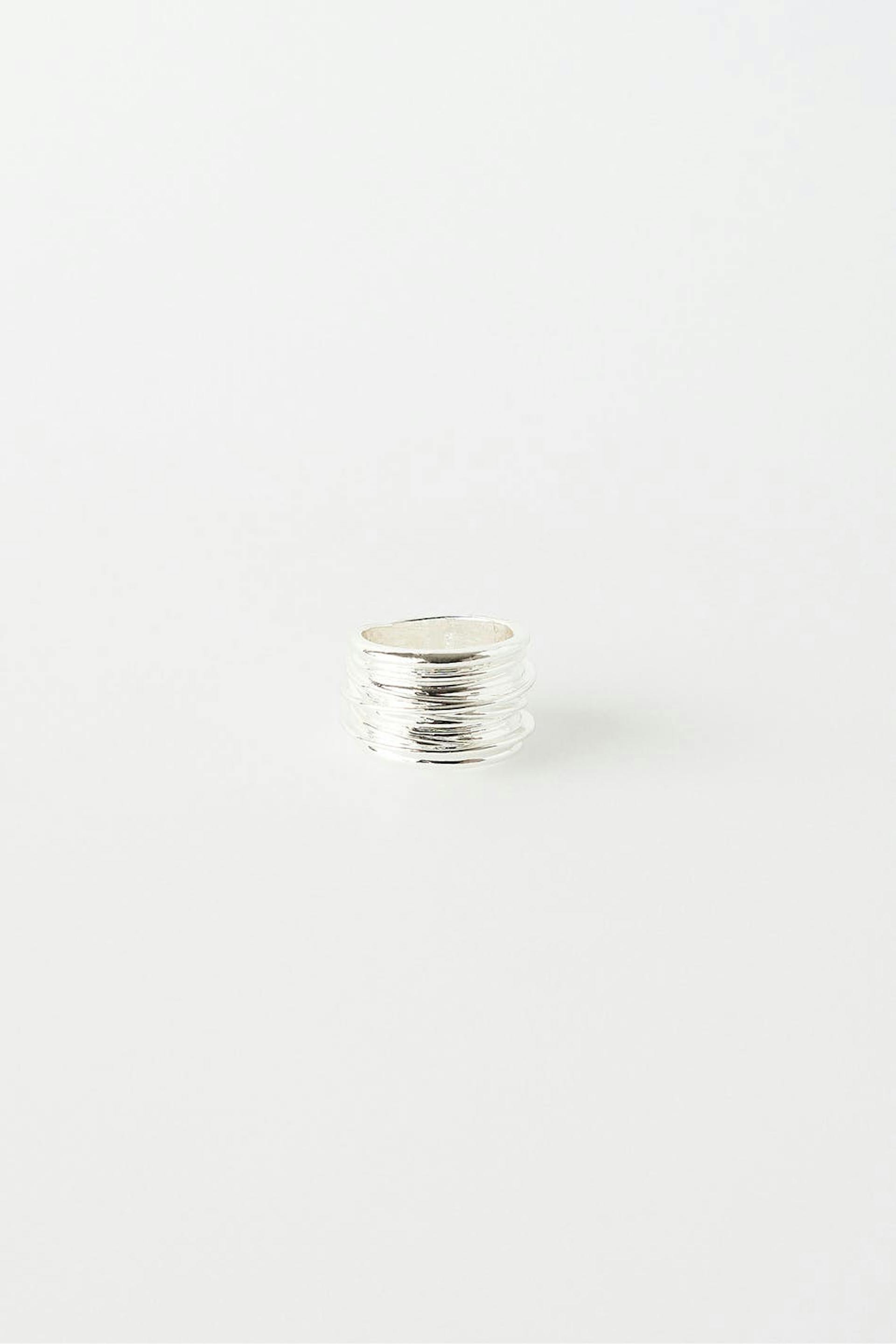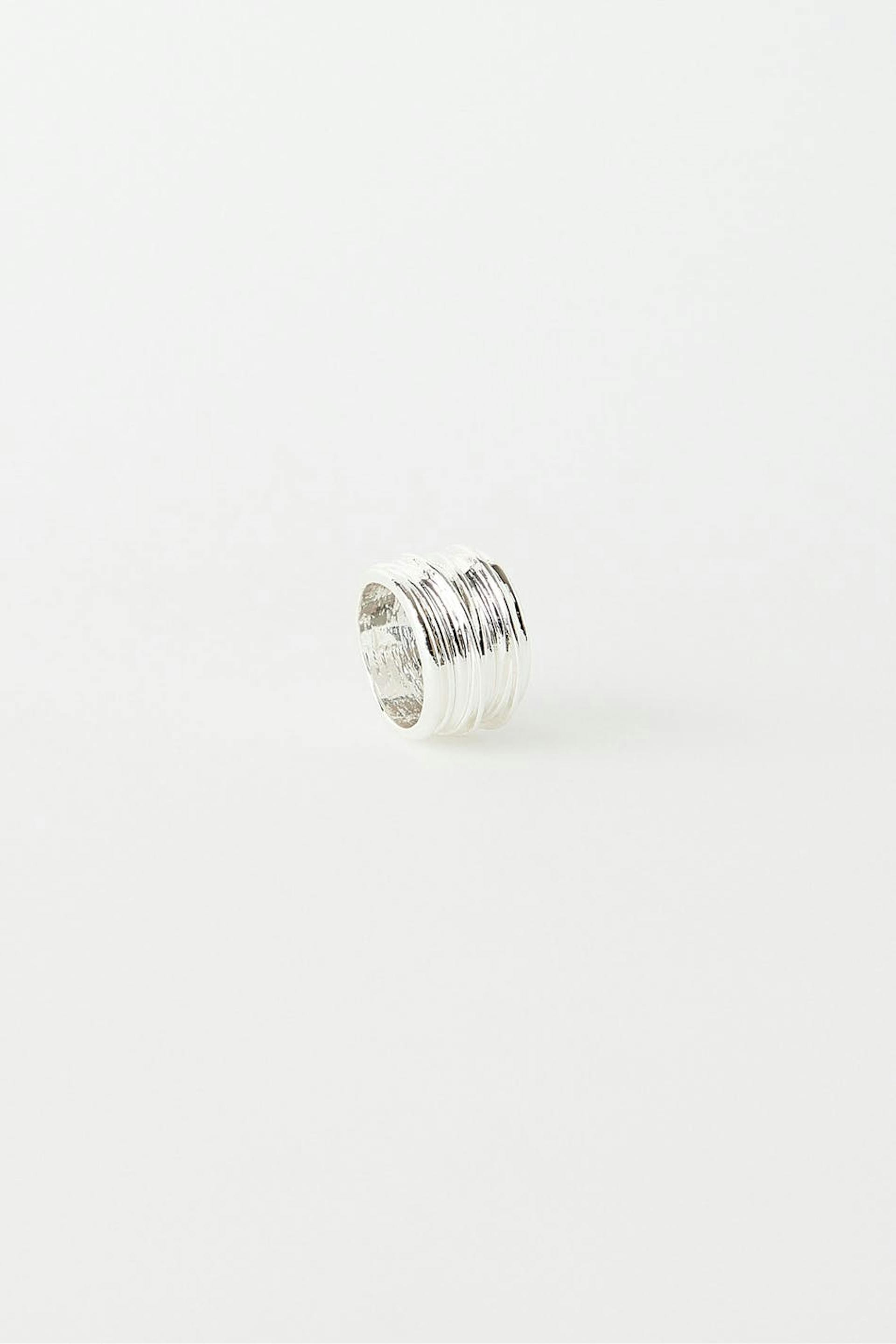 Ring mit einem gerippten Design. Der Ring ist silbern und hat eine strukturierte Oberfläsche.