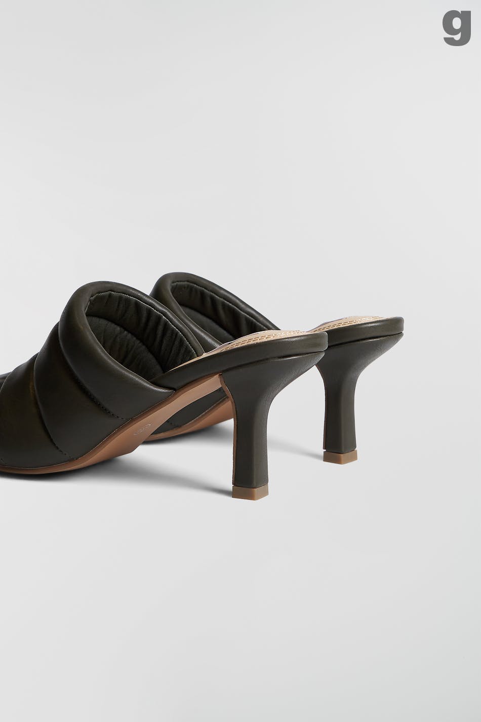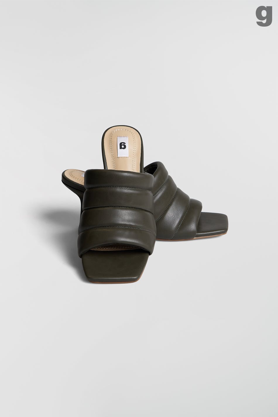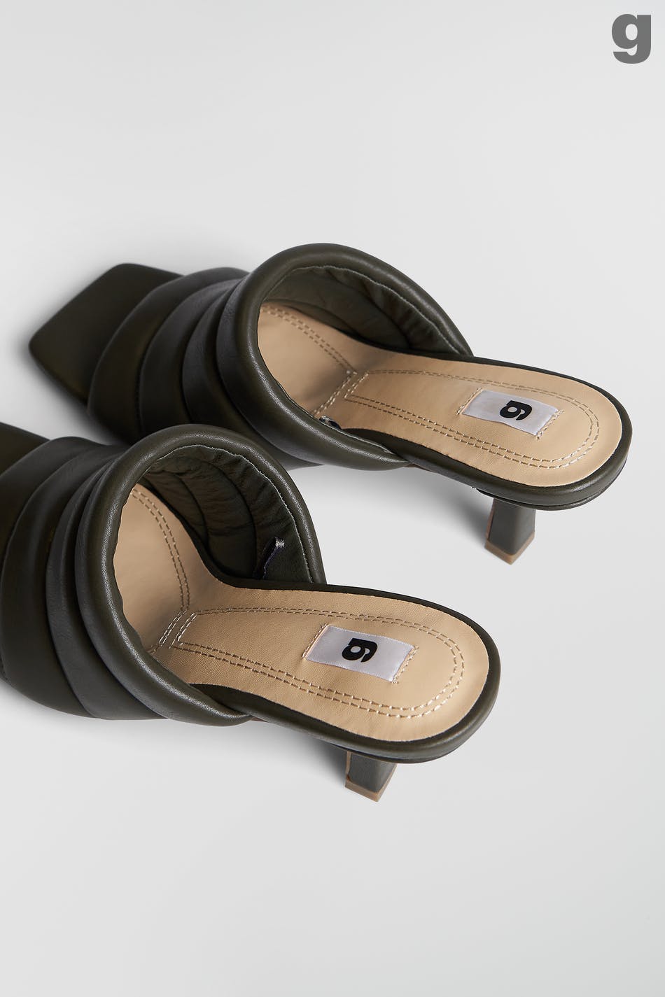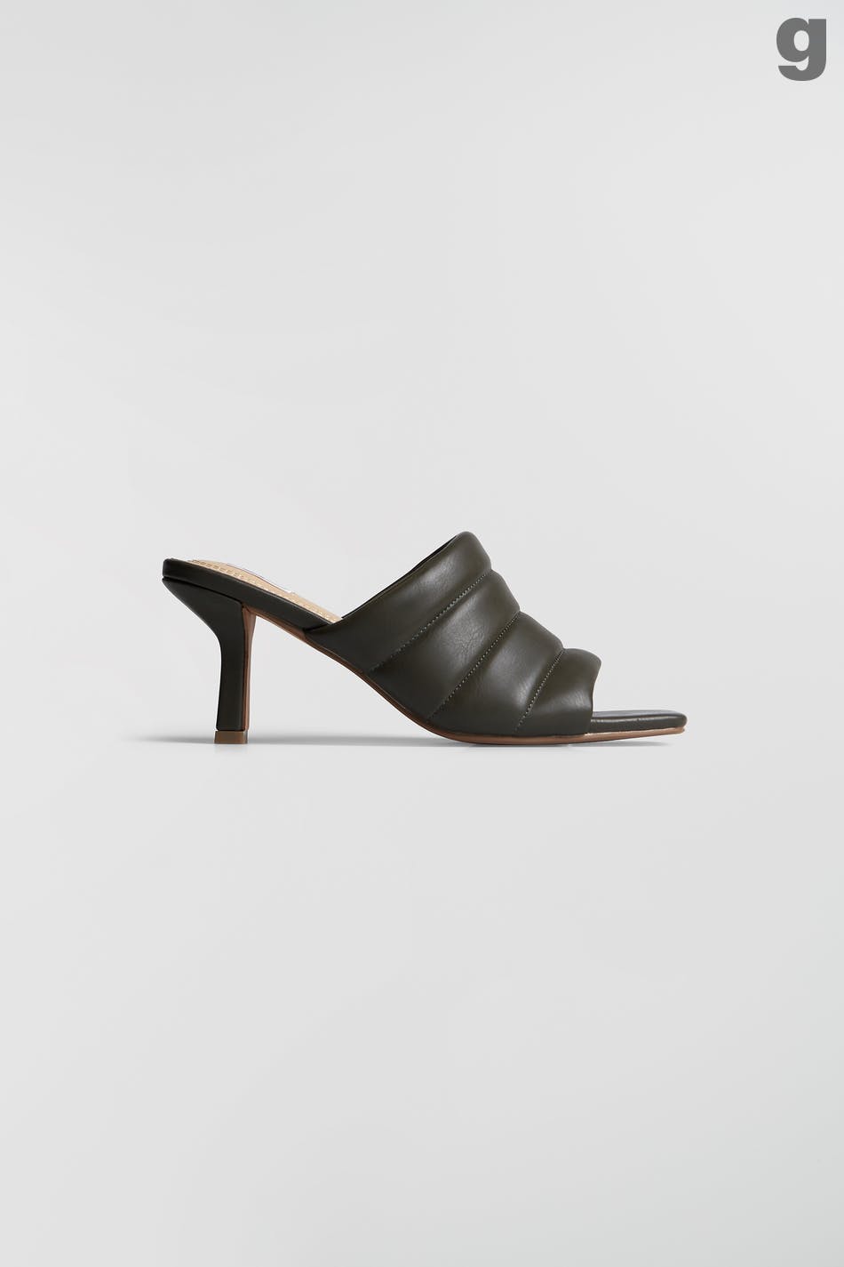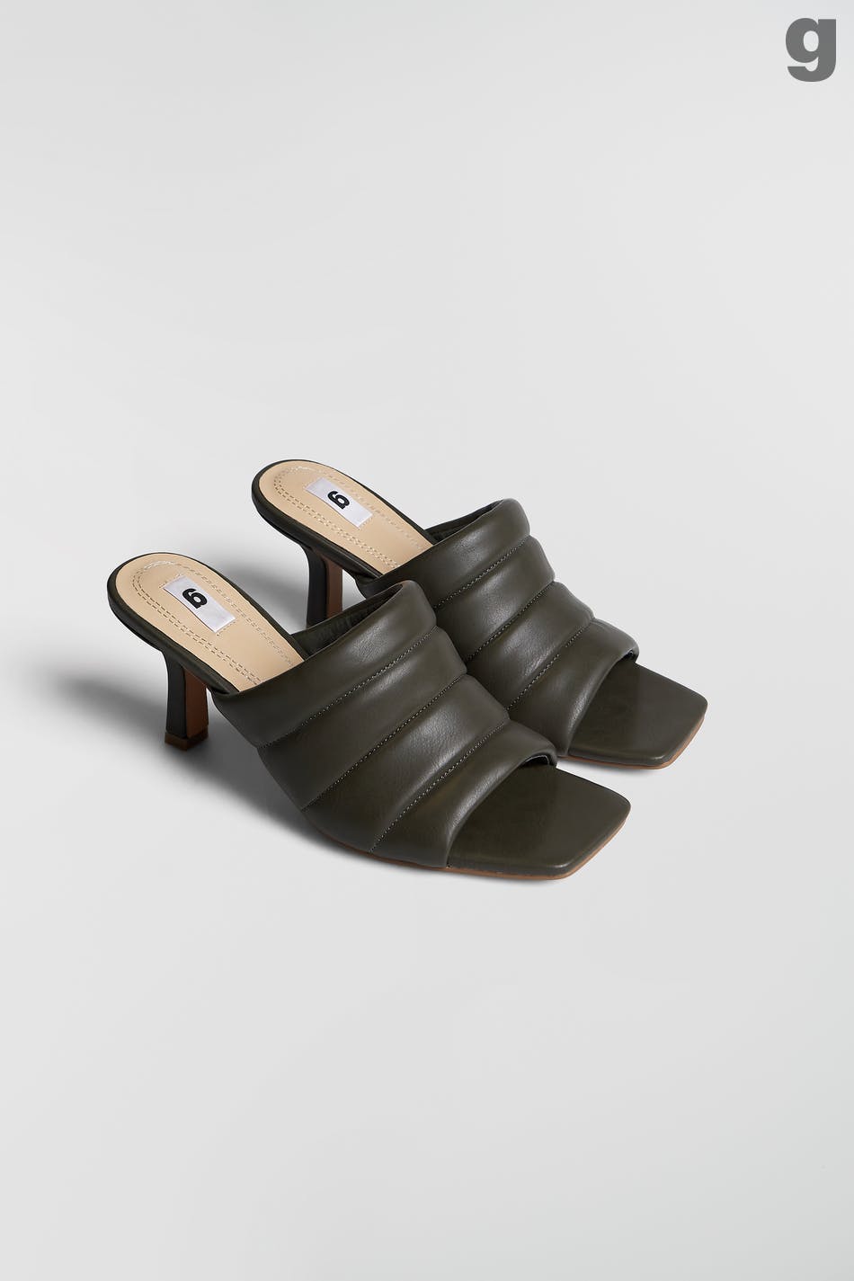 Sandaletten mit Slip-In-Design. Die Sandalen sind dunkelgrün und haben eine Peep-Toe. Sie haben schmale Absätze und einen gepolsterten oberen Teil in Kunstleder.