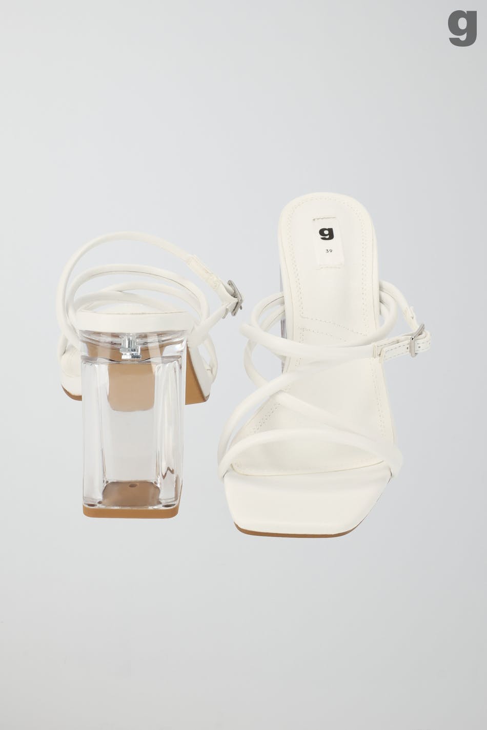 Sandalen mit einem hohen Absatz und schmalen Trägern. Die Sandalen sind weiβ und haben Vorderkappe mit quadratischer Spitze. Sie haben lichtdurchlässigen Blockabsatz und schmalen, verstellbaren Rückengurt.