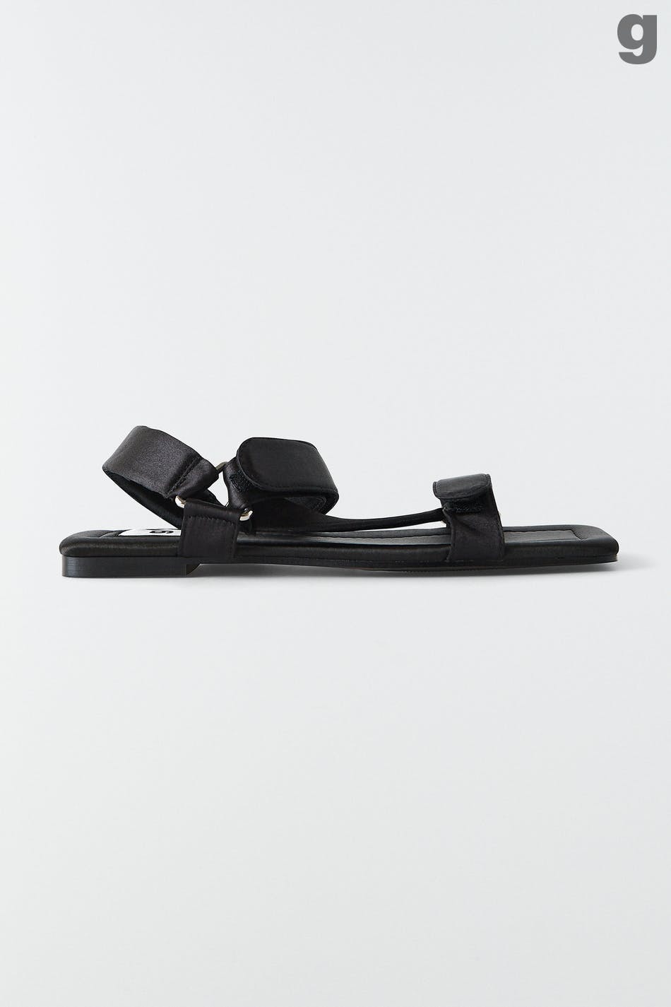 Sportliche Sandale mit gepolsterten Trägern aus Satin. Die Sandale ist schwarz.
