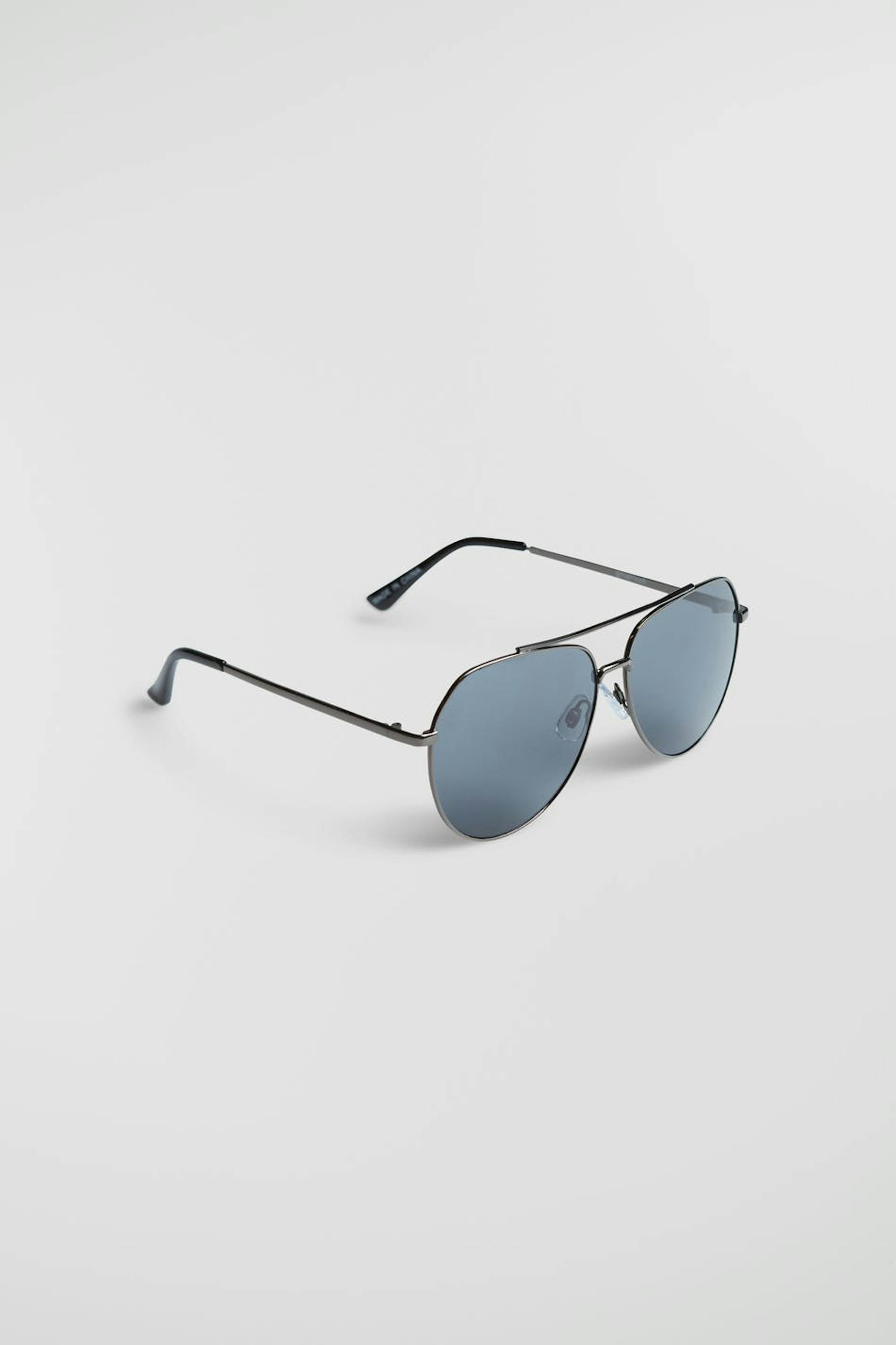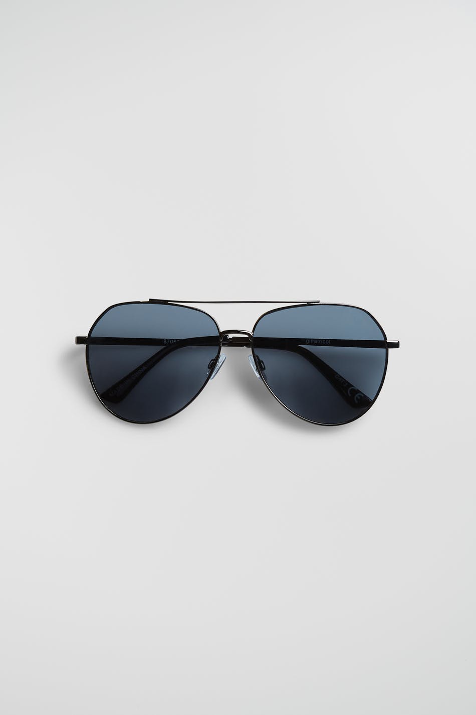 Sonnenbrillen mit einem Piloten-Design. Die Sonnenbrillen sind schwarz und haben glattes Glas.