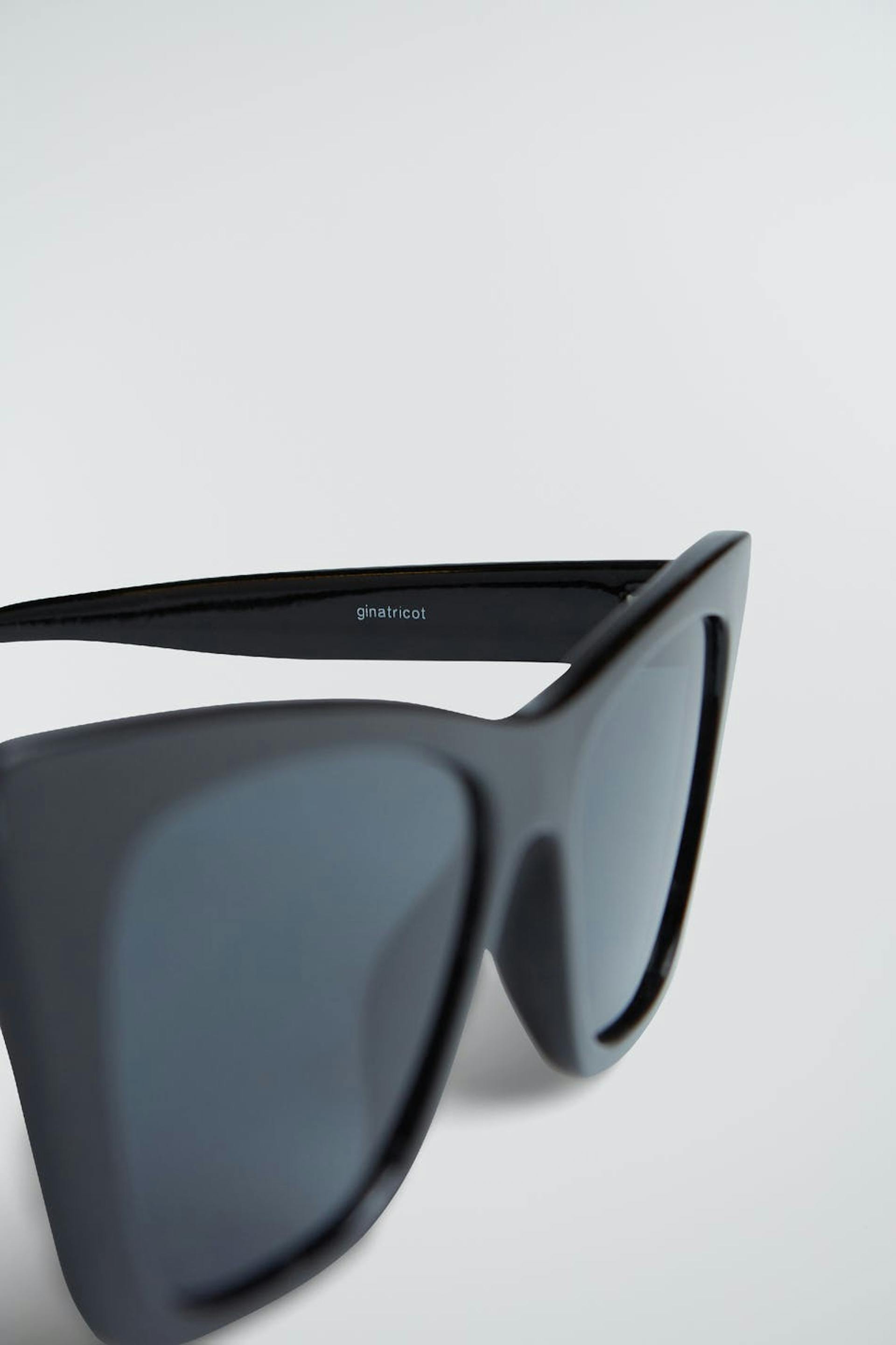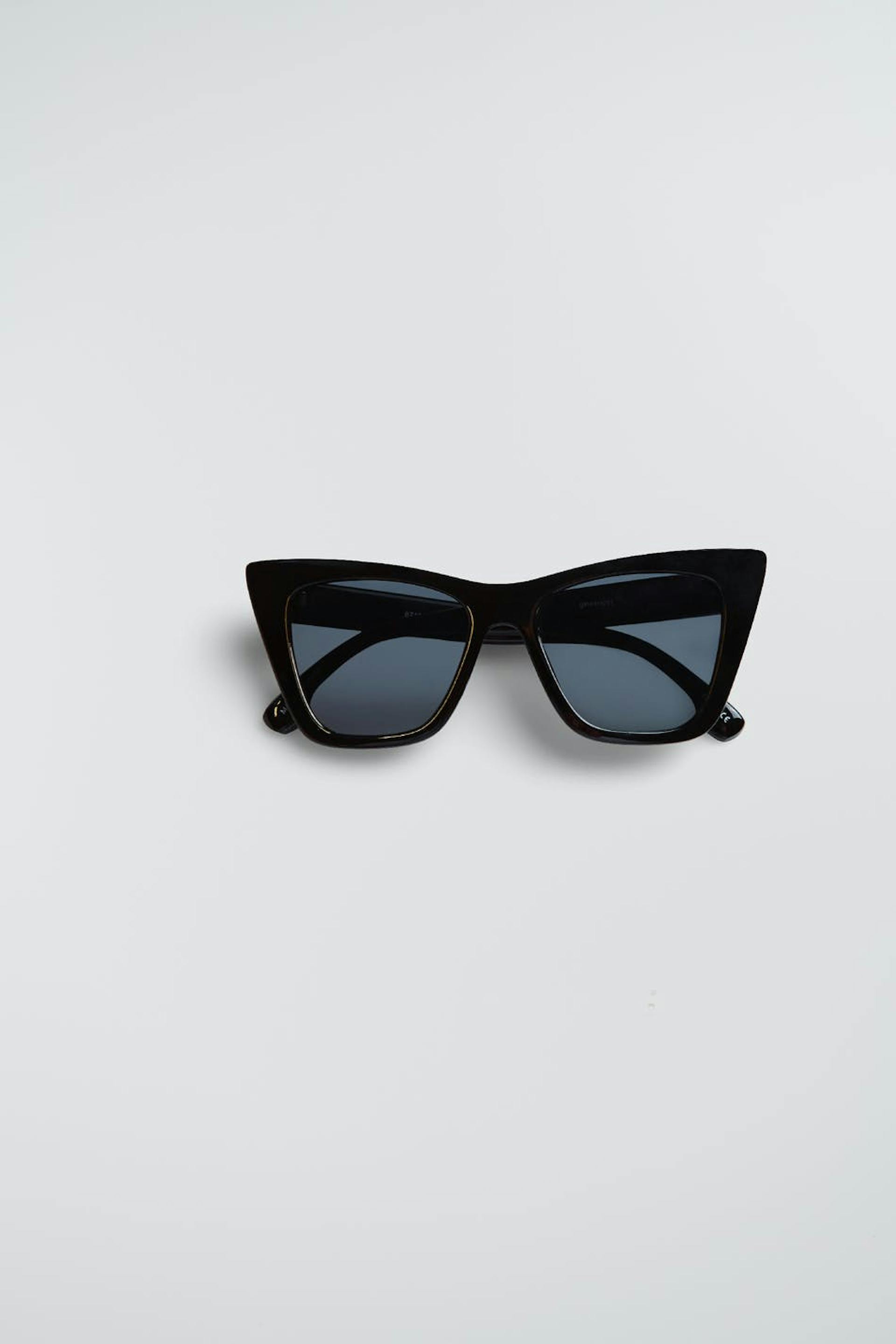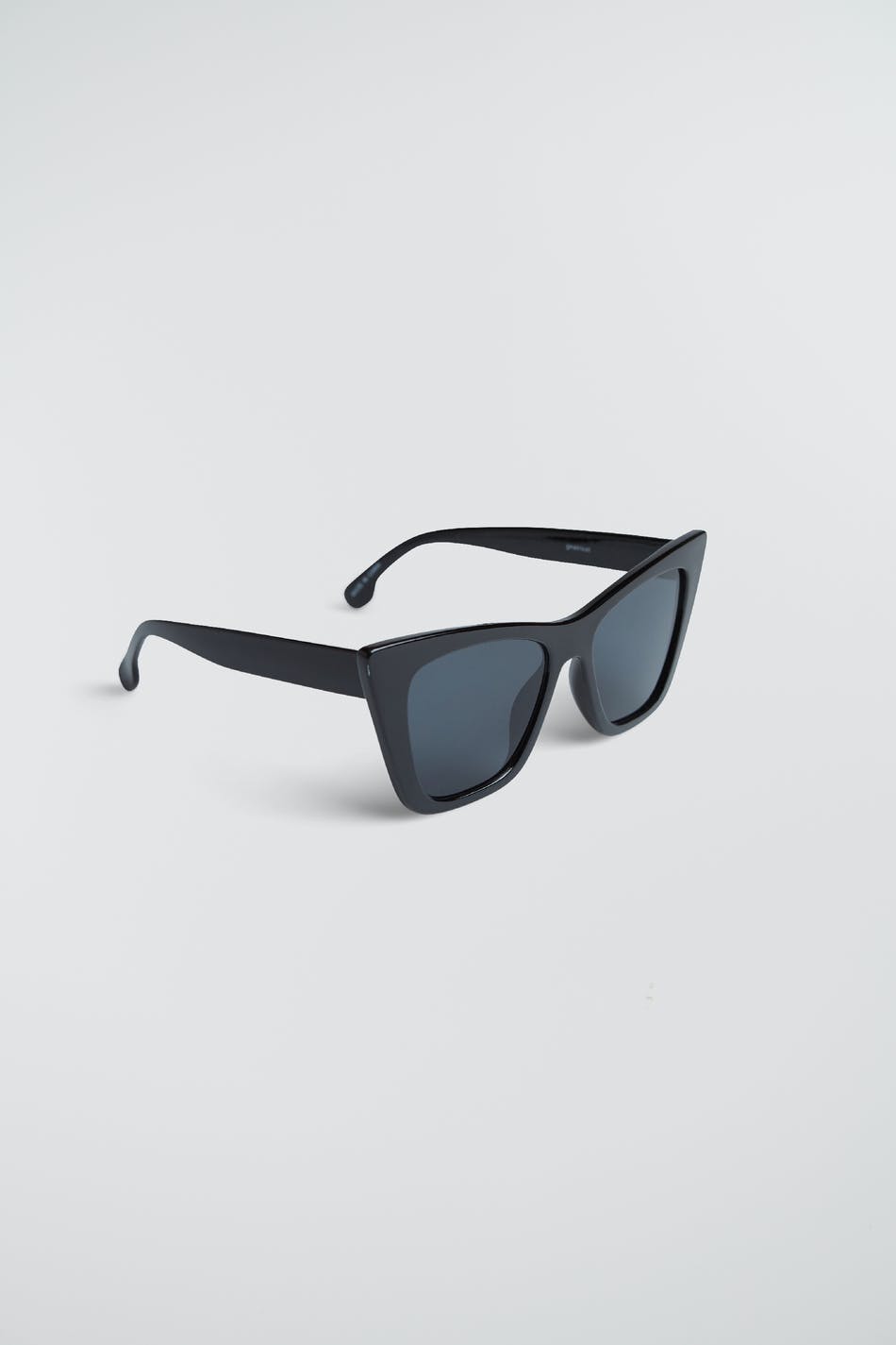Eckige Sonnenbrillen mit einem Kunststoffrahmen. Die Sonnenbrillen sind schwarz.