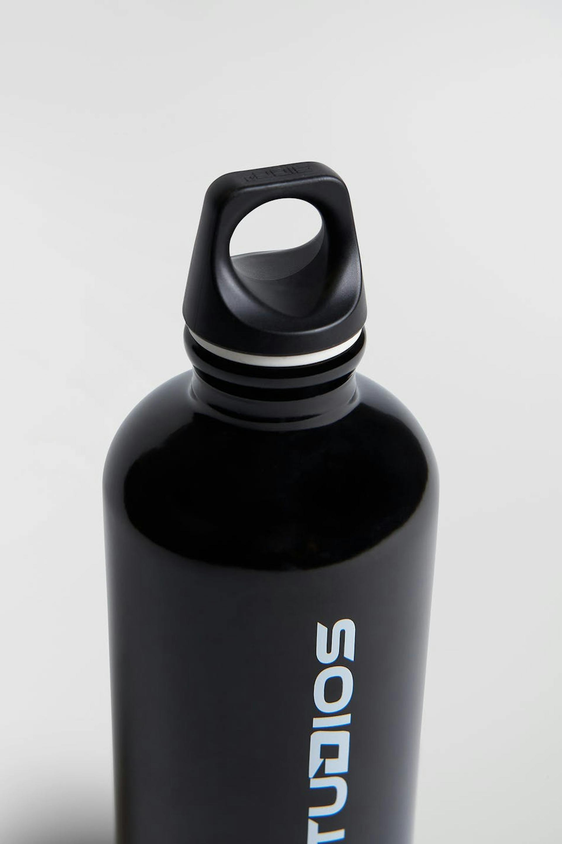 Nicki Studios X Gina Tricot. Doppelwändige Wasserflasche mit Deckel. Die Wasserflasche ist schwarz und hat ein lasergedrucktes Markenlogo vorne. Sie ist hergestellt aus Edelstahl. 350ml.