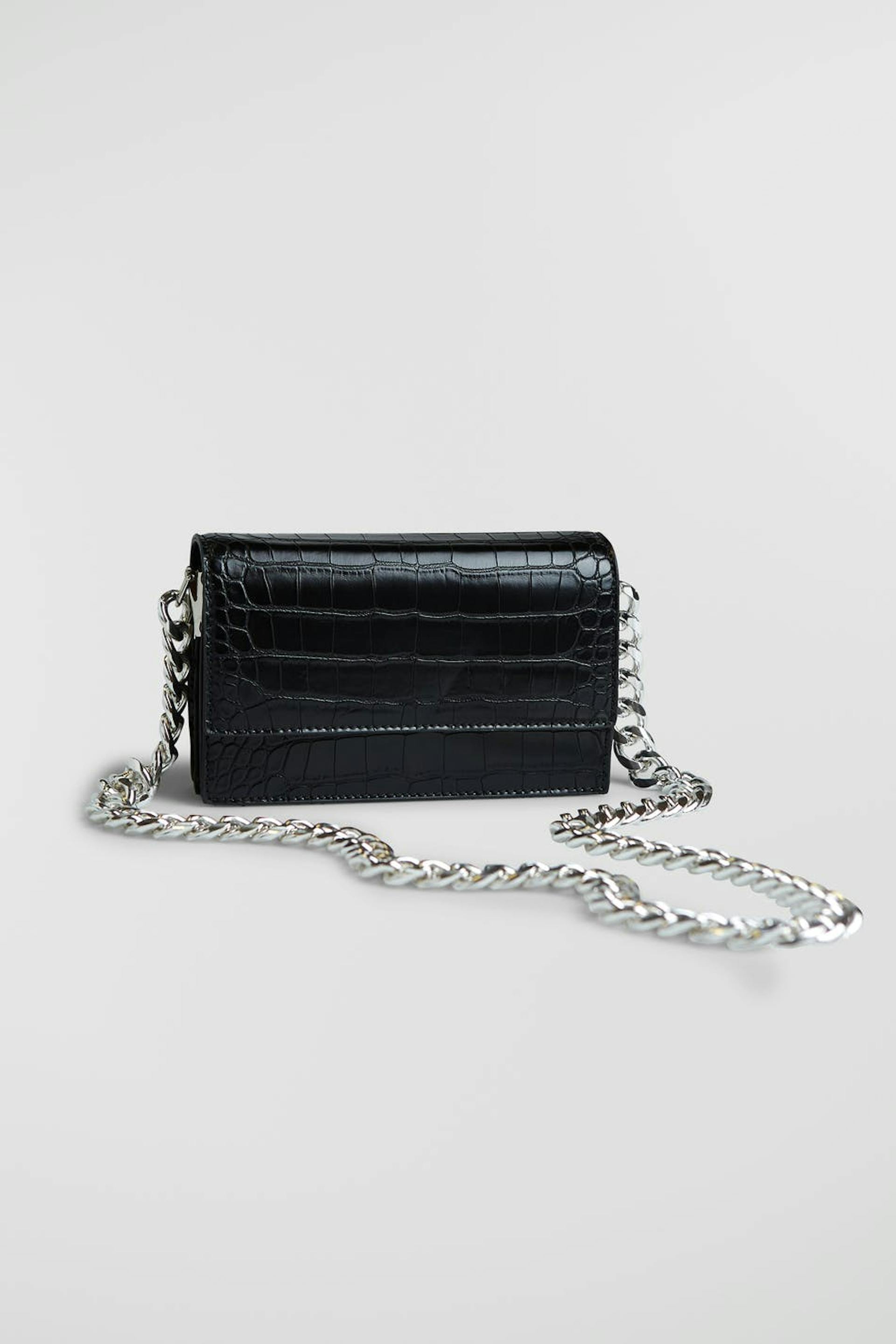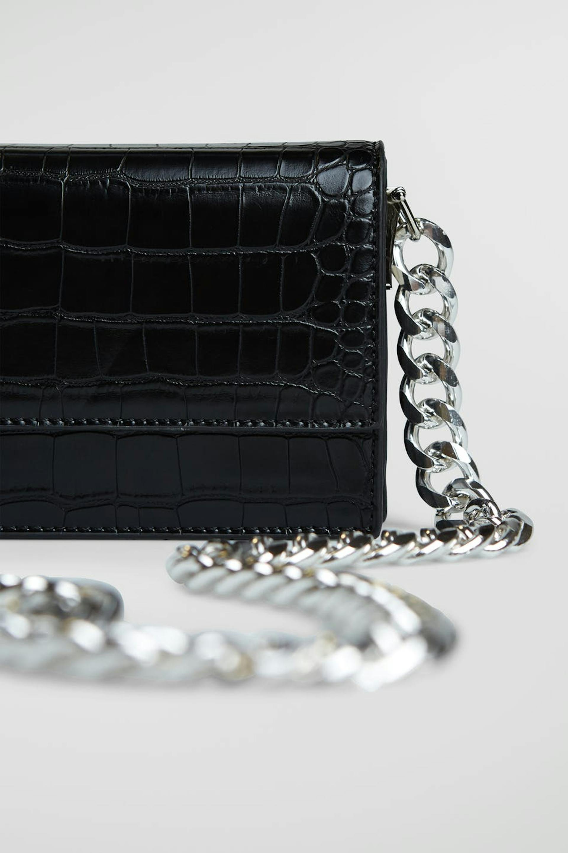 Kleine Tasche mit gefälschtem Krokodilmaterial. Die Tasche ist schwarz und hat eine klobige, silberne Kette.