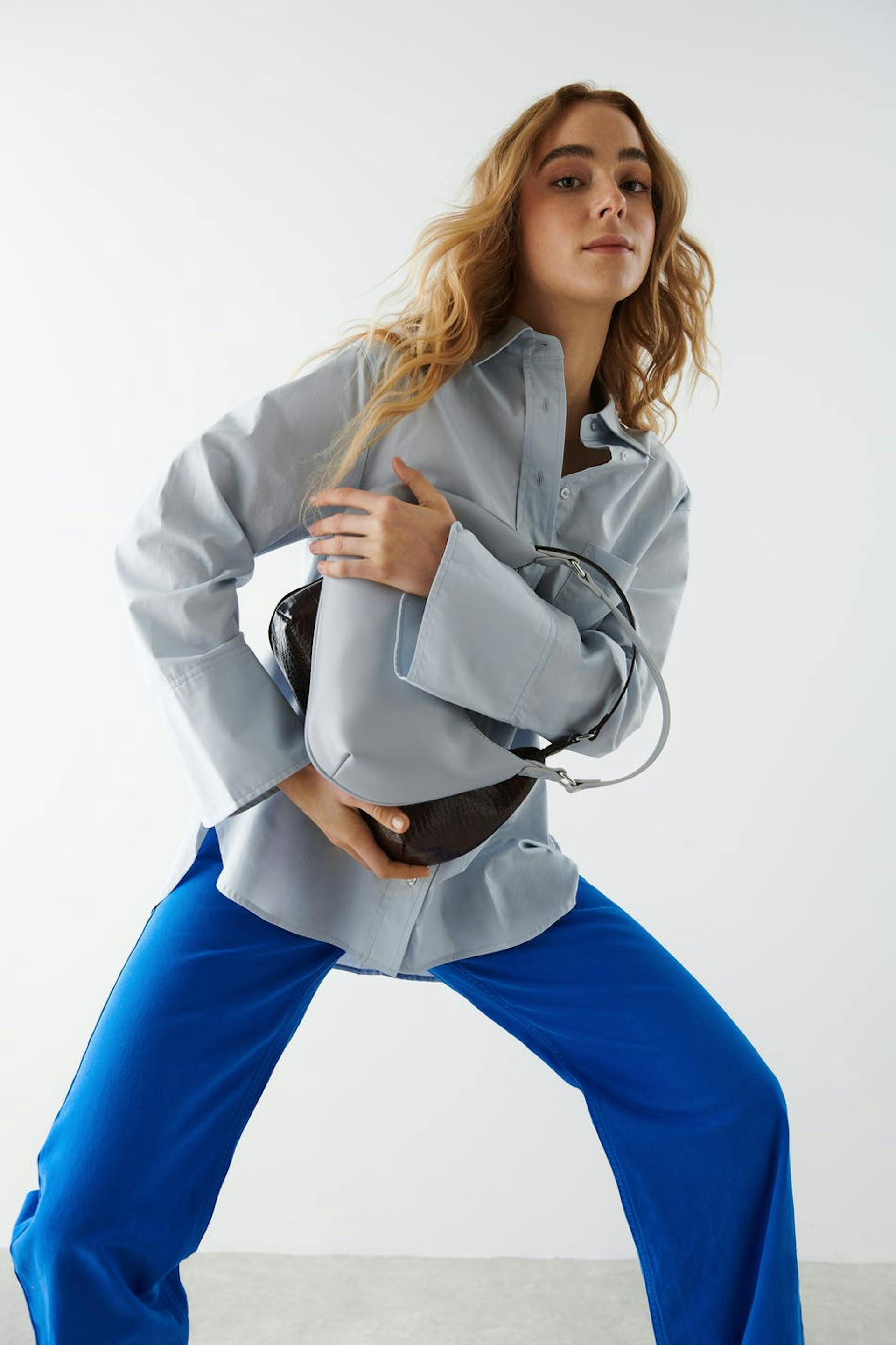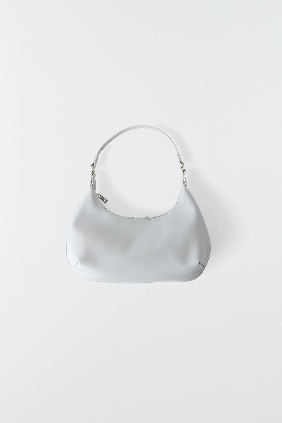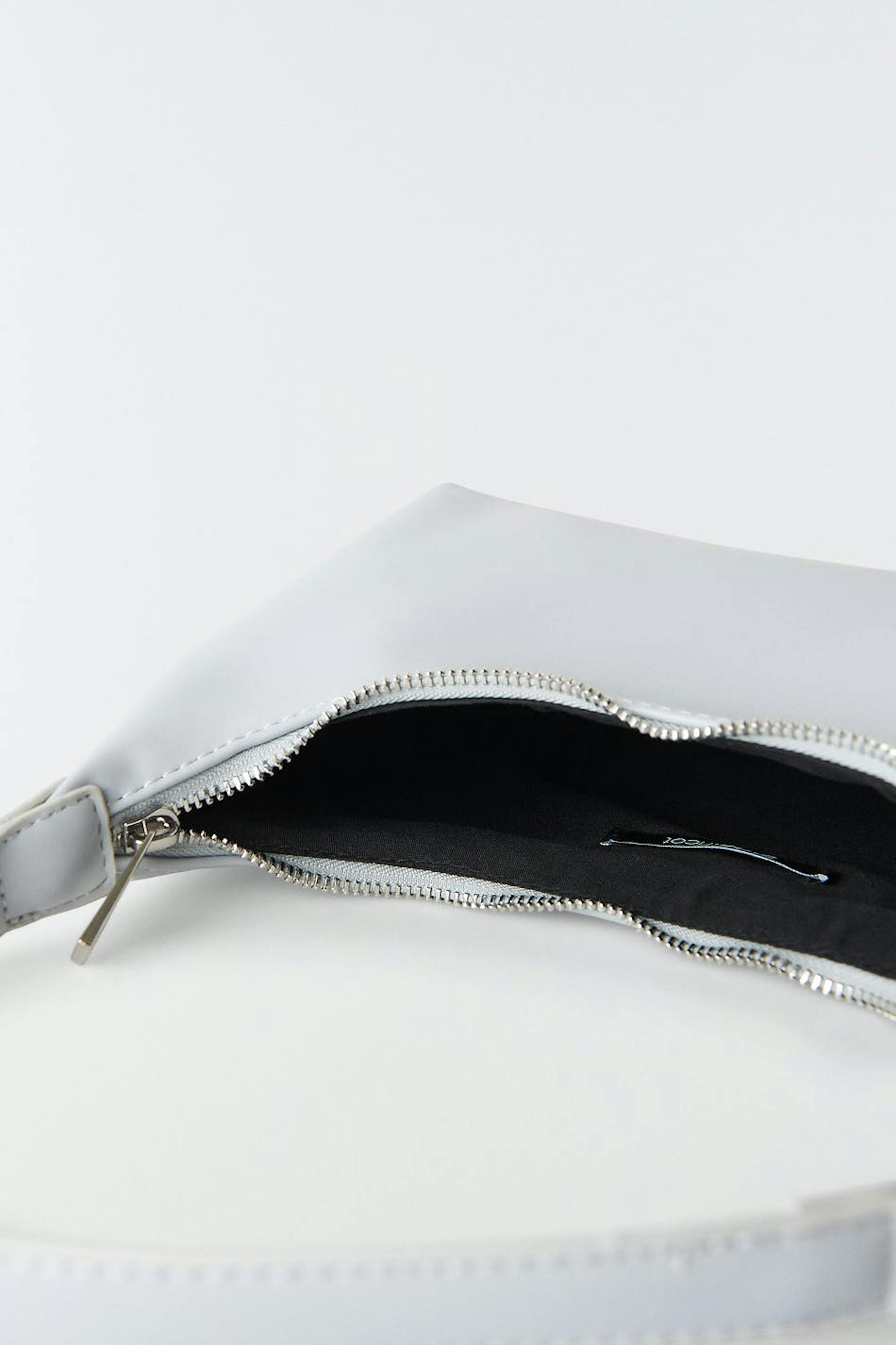 Tasche mit einem Kunstleder-Material. Die Tasche ist blau und hat einen kurzen Schulterriemen. Sie hat einen Reißverschluss oben.