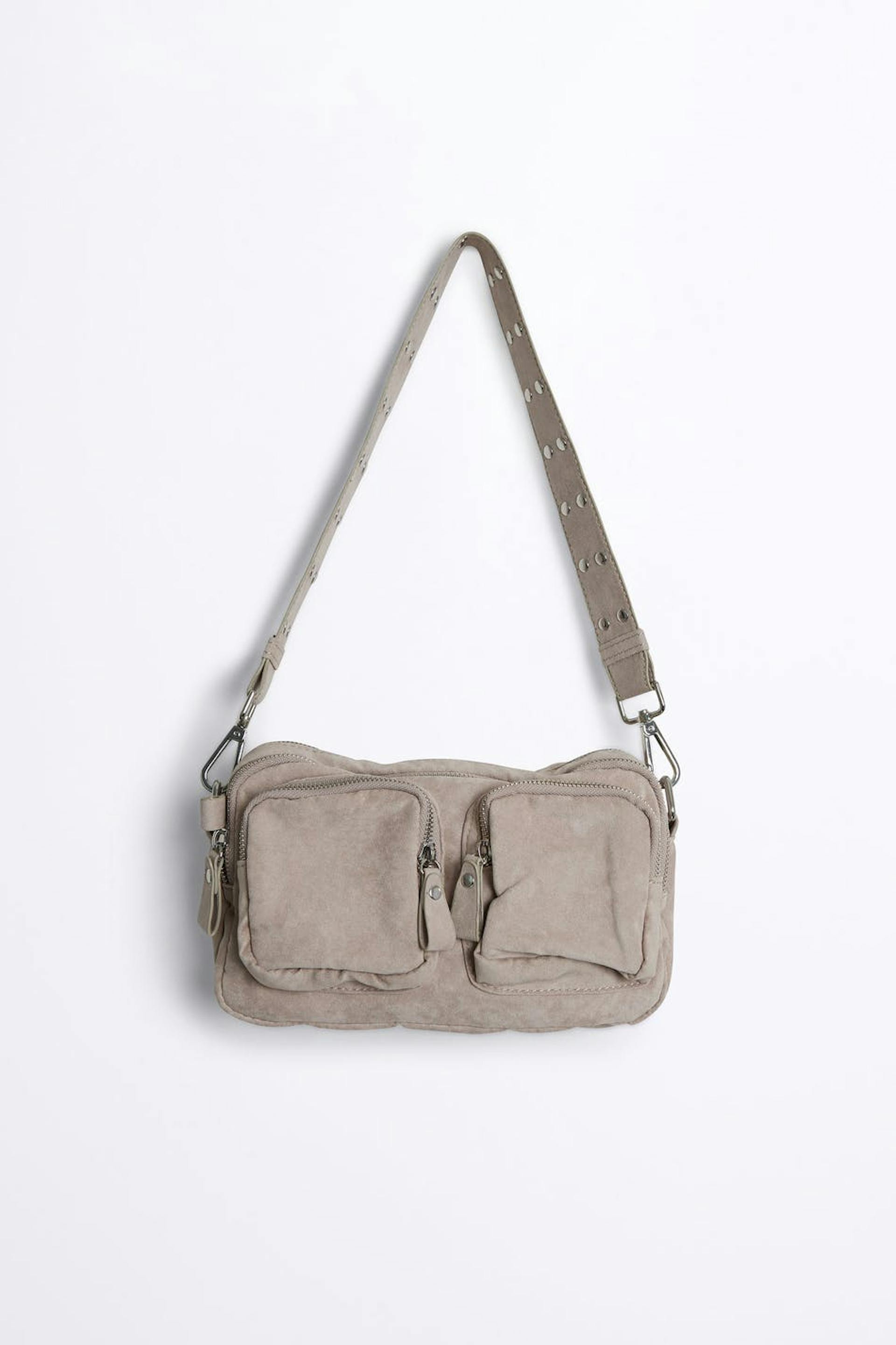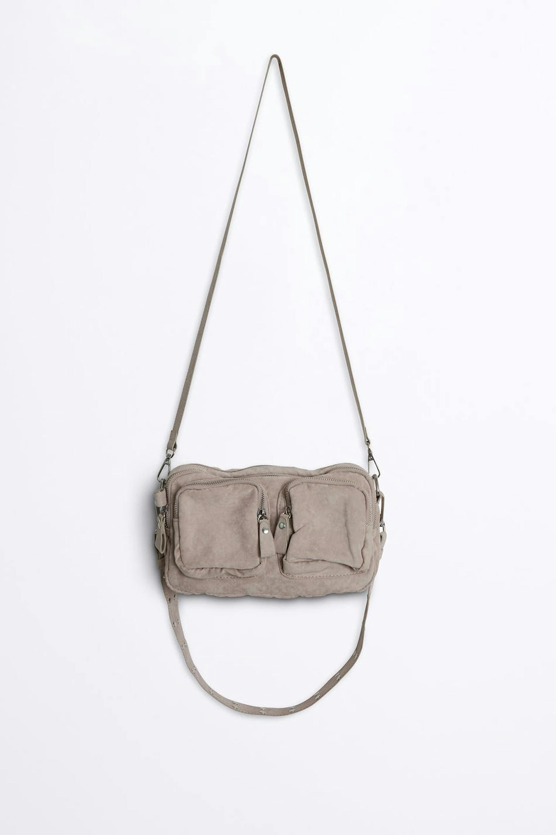 Tasche von der Straße inspiriert mit robusten Reißverschlüssen. Die Tasche ist grau und hat zwei Schulterriemen mit einer unterschiedlicher Länge. Sie hat mehrere Fächer.