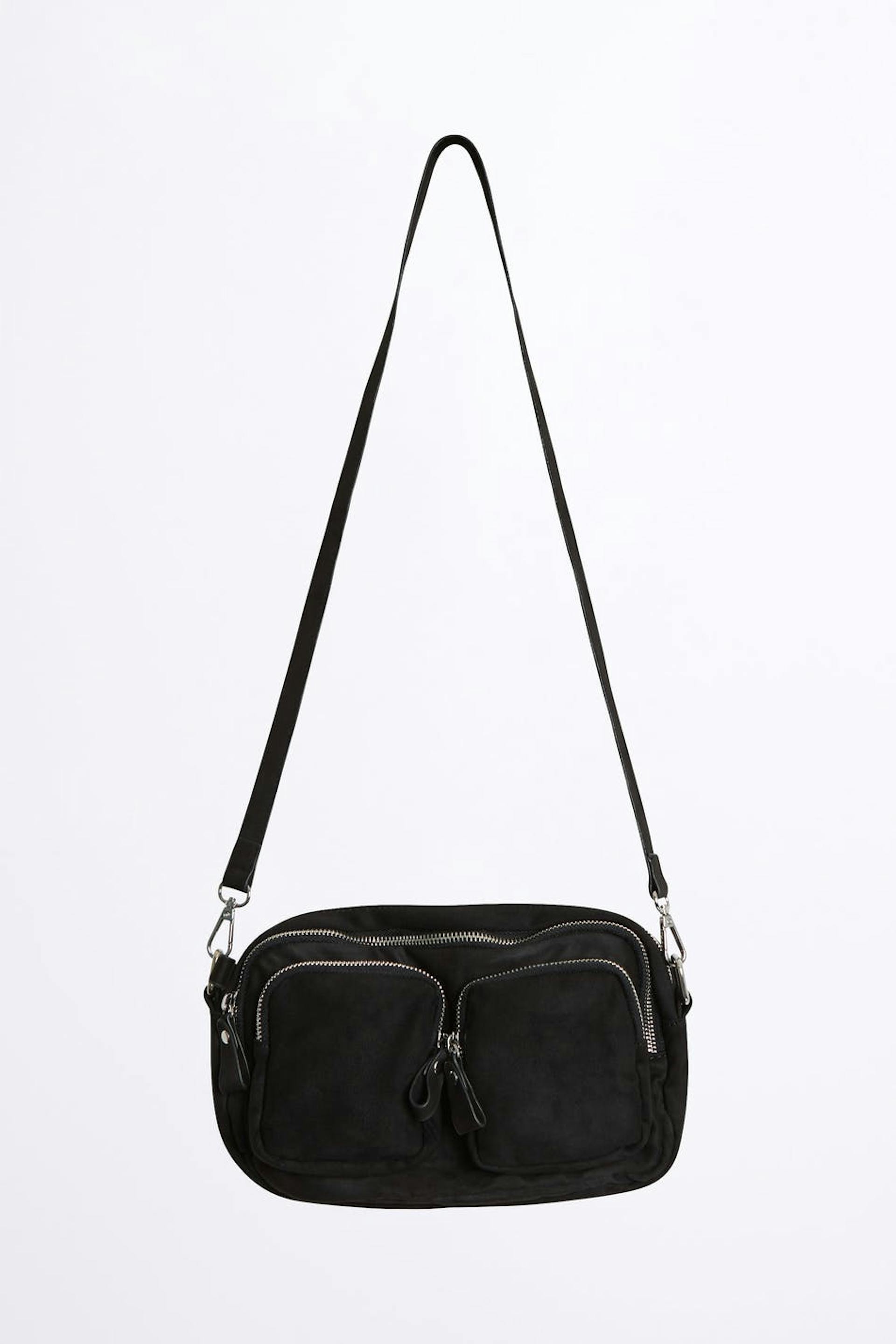 Tasche von der Straße inspiriert mit robusten Reißverschlüssen. Die Tasche ist schwarz und hat zwei Schulterriemen mit einer unterschiedlicher Länge. Sie hat mehrere Fächer.