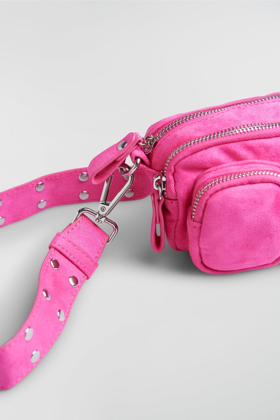 Weiche Tasche mit robusten Reißverschlüssen. Die Tasche ist rosa, von der Straße inspiriert und klein. Sie hat ein wildlederartiges Material, zwei Schulterriemen mit unterschiedlicher Länge und mehrere Fächer.