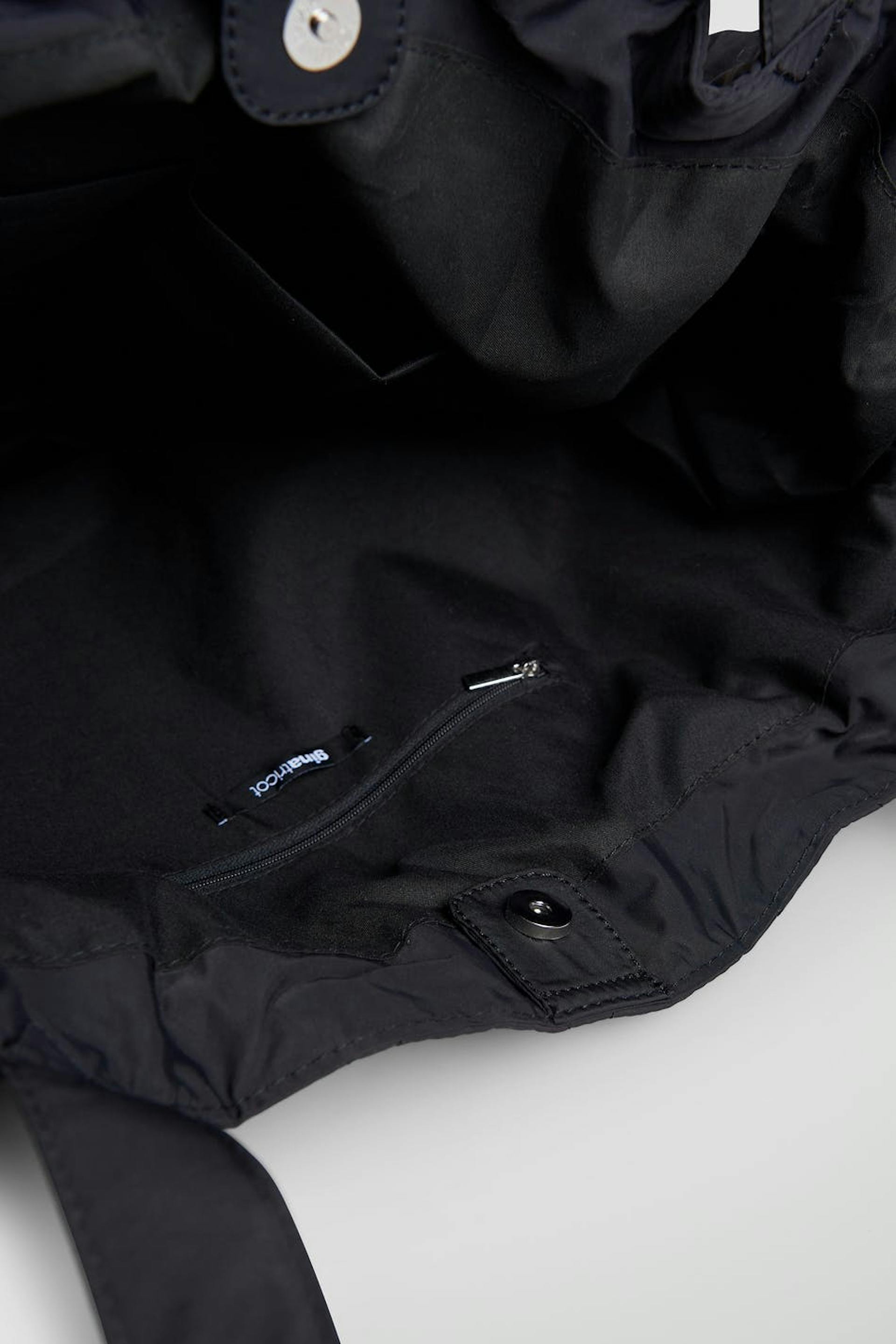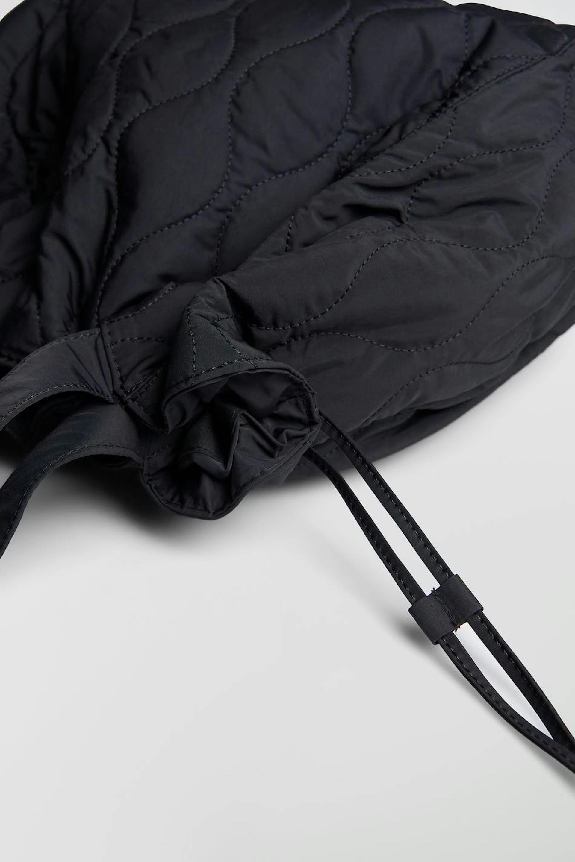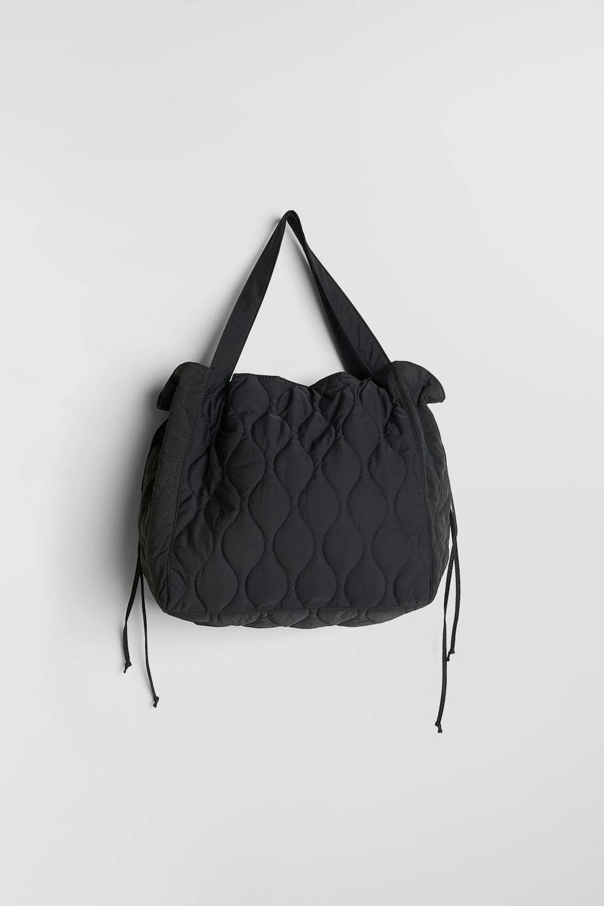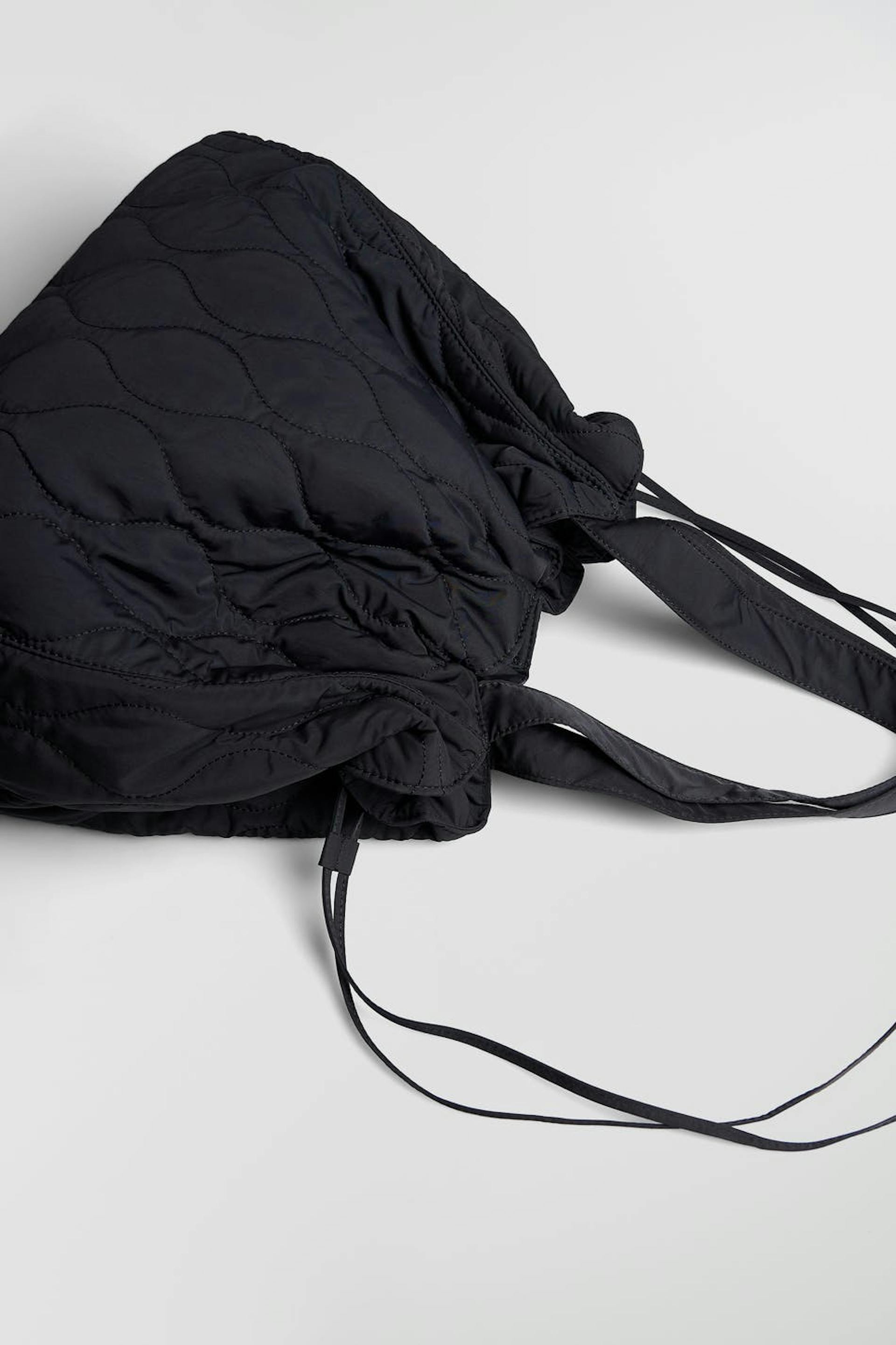 Gesteppte Tasche mit großem Hauptfach. Die Tasche ist schwarz und hat zwei Griffe. Sie hat ein Innenfach, Verschluss mit metallischem Knopf und einen einstellbaren Kordelzug mit Schnürungen auf den Seiten.