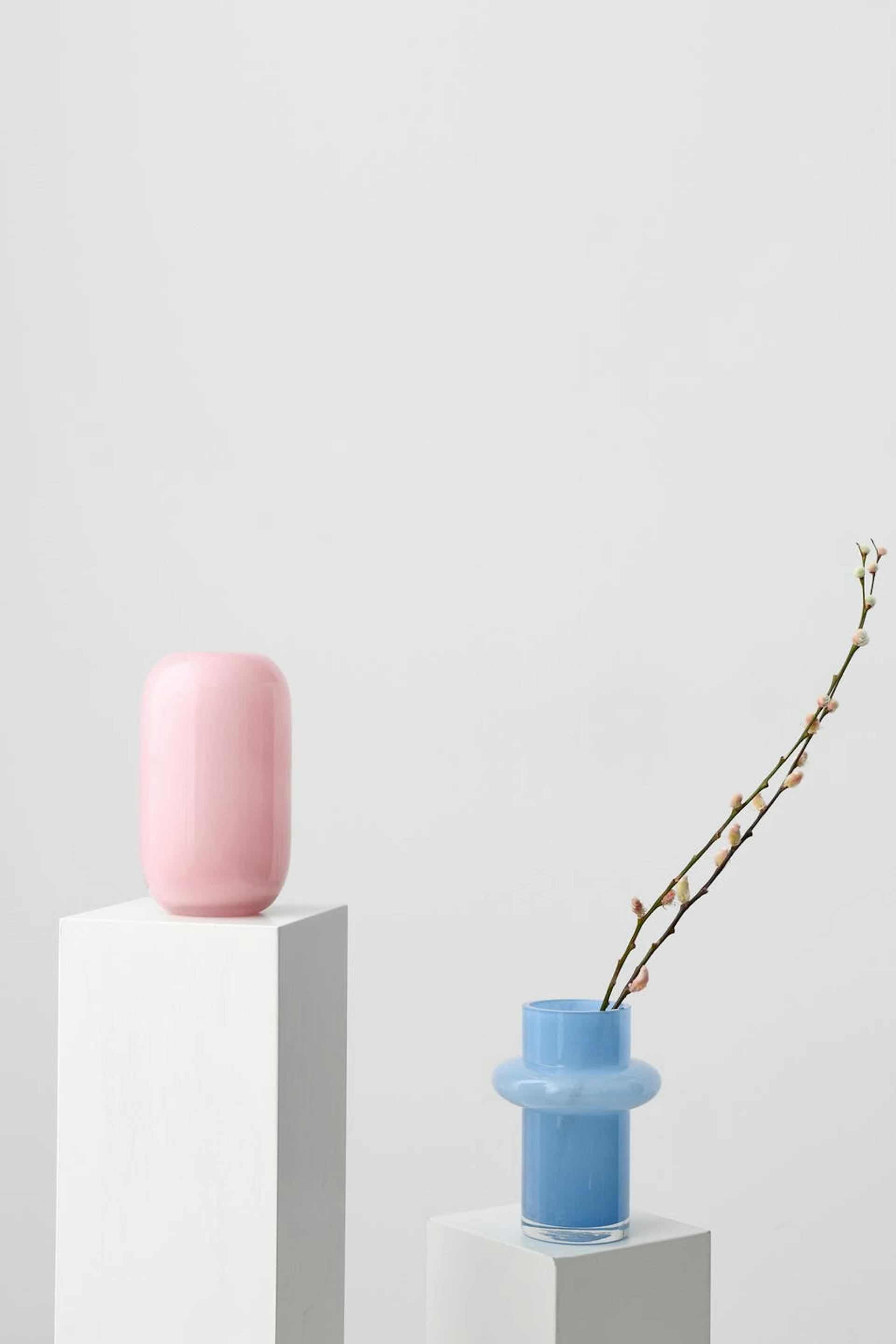 Runde Vase aus Glas mit glänzendem Ende. Die Vase ist rosa.