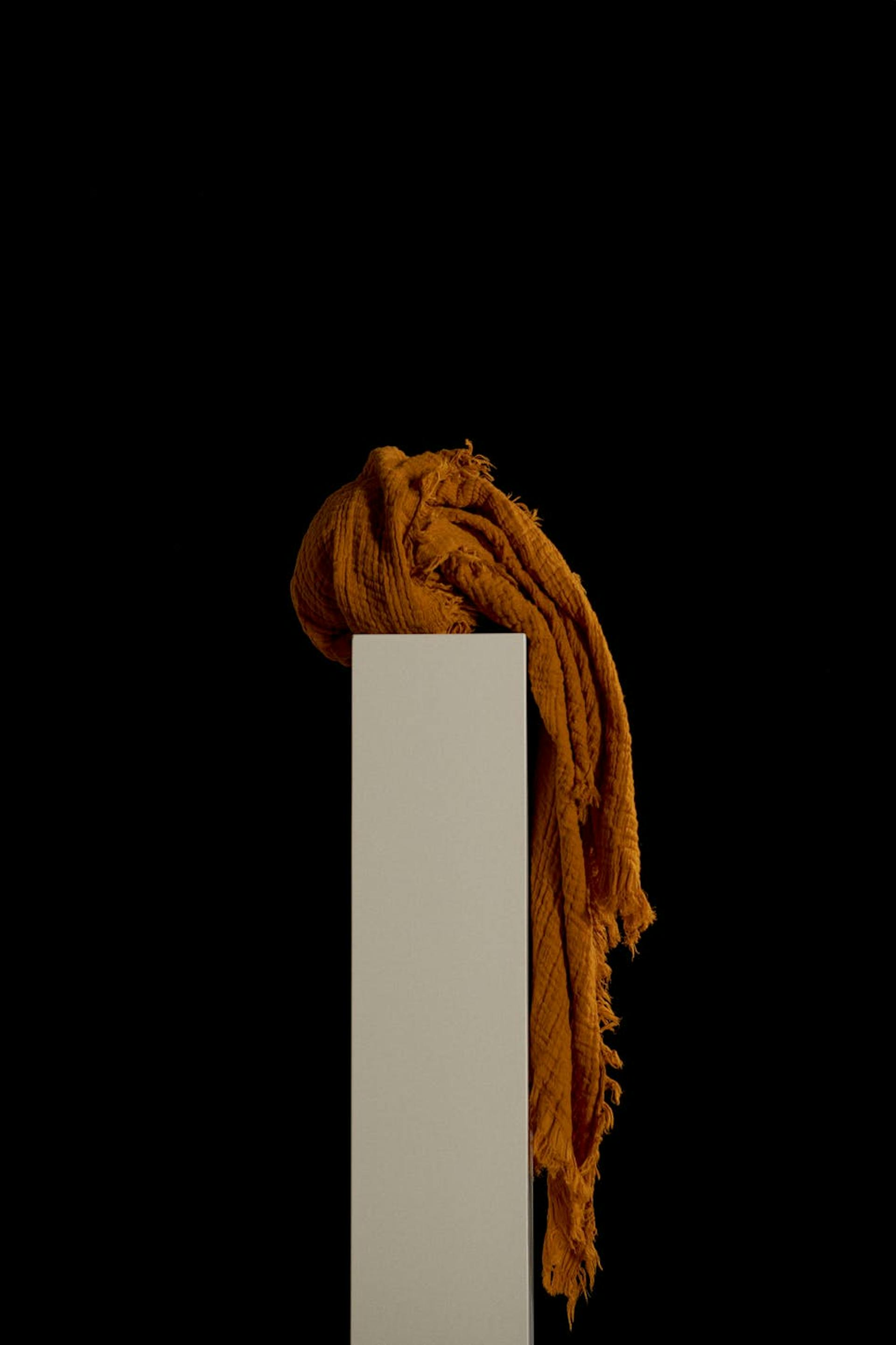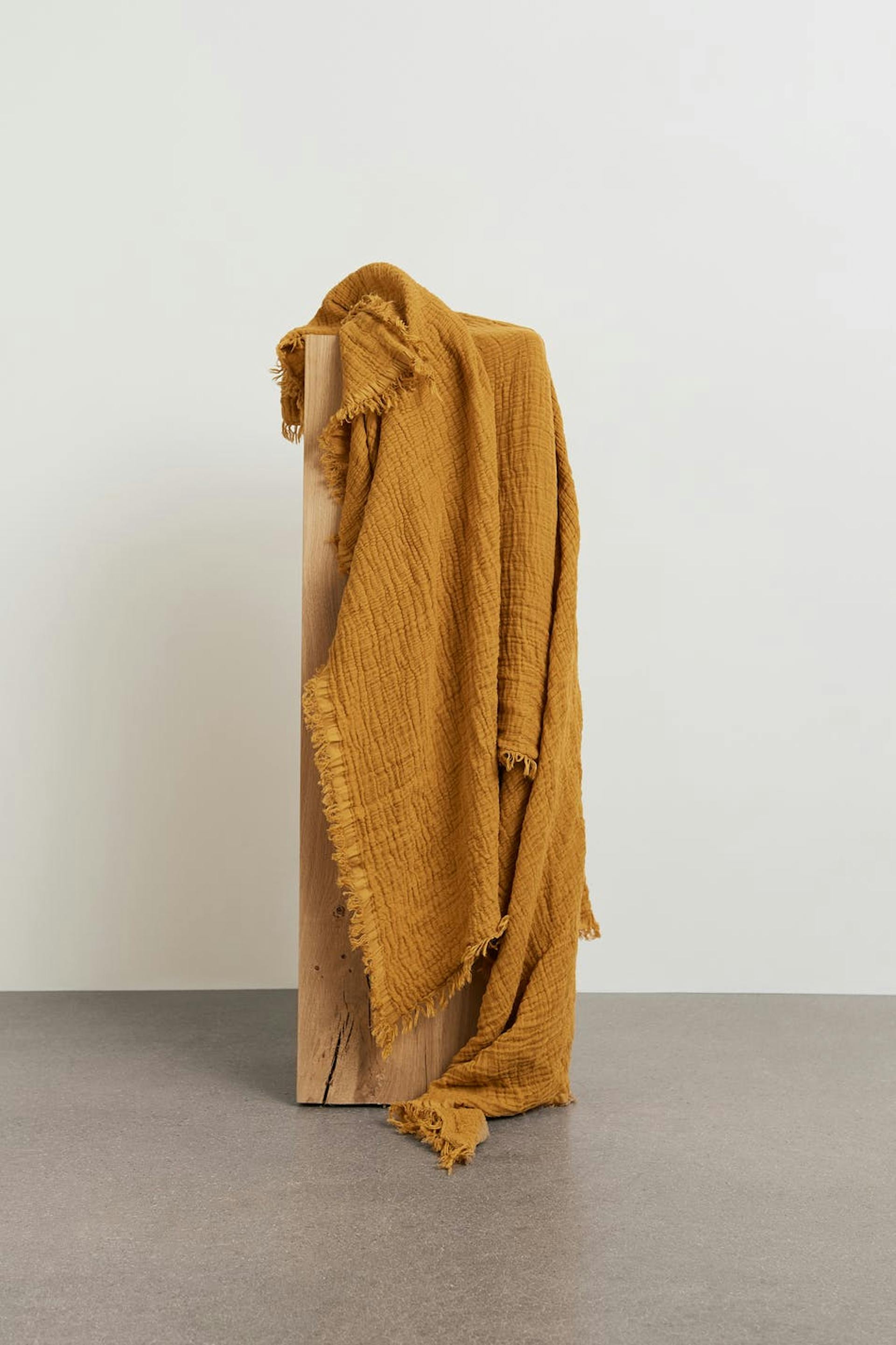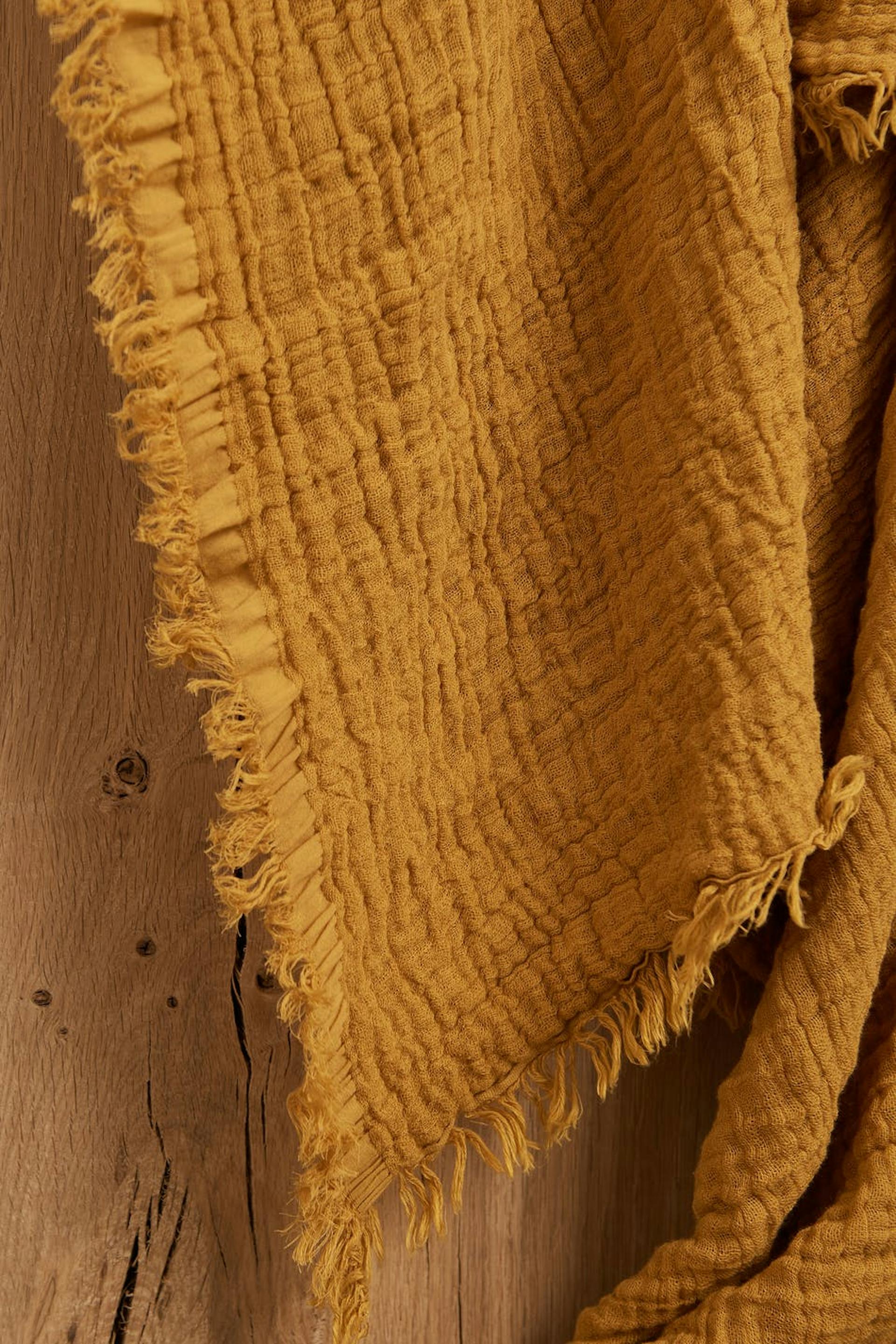Leicht gekräuselte Decke mit Fransen an den Enden. Die Decke ist orange.