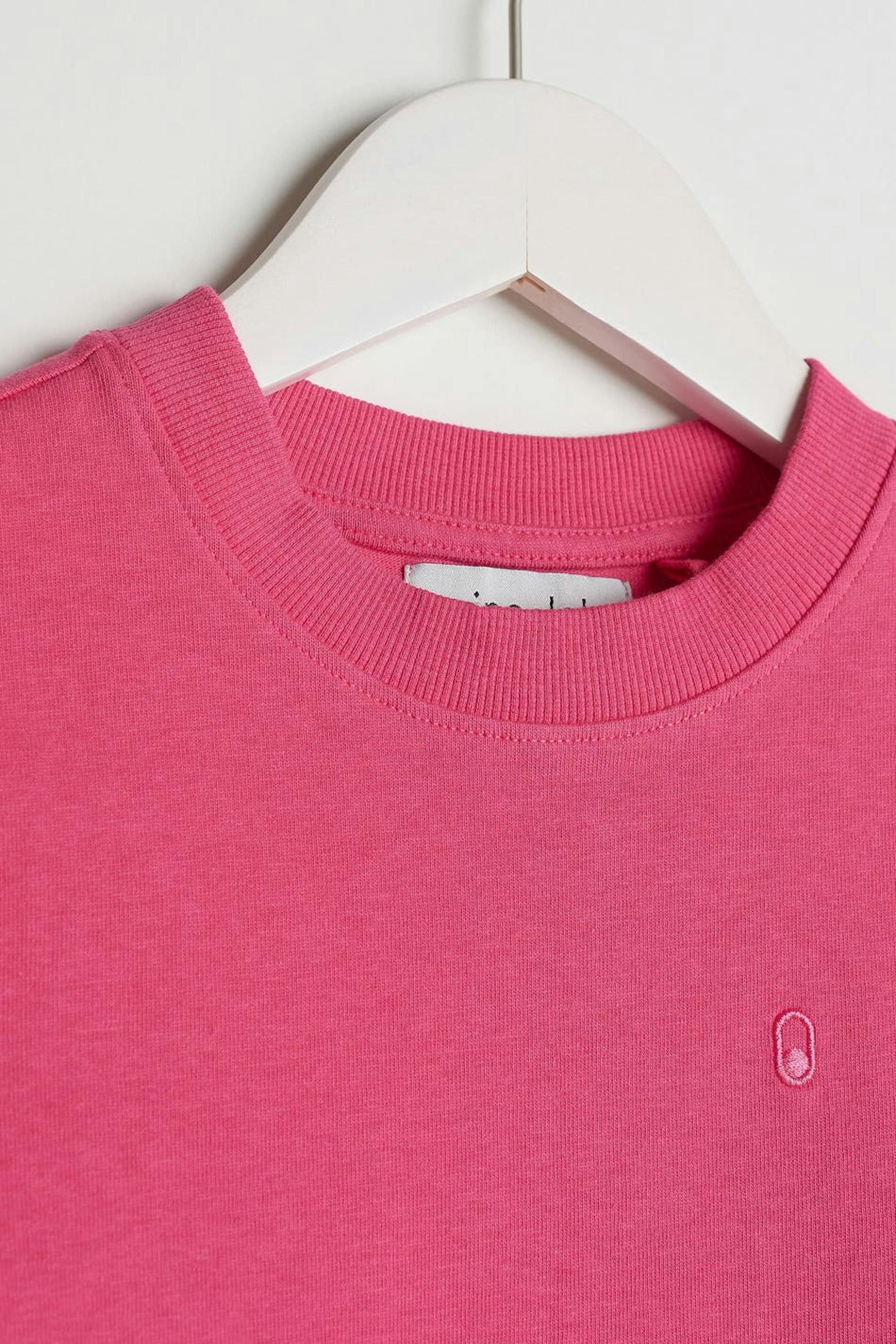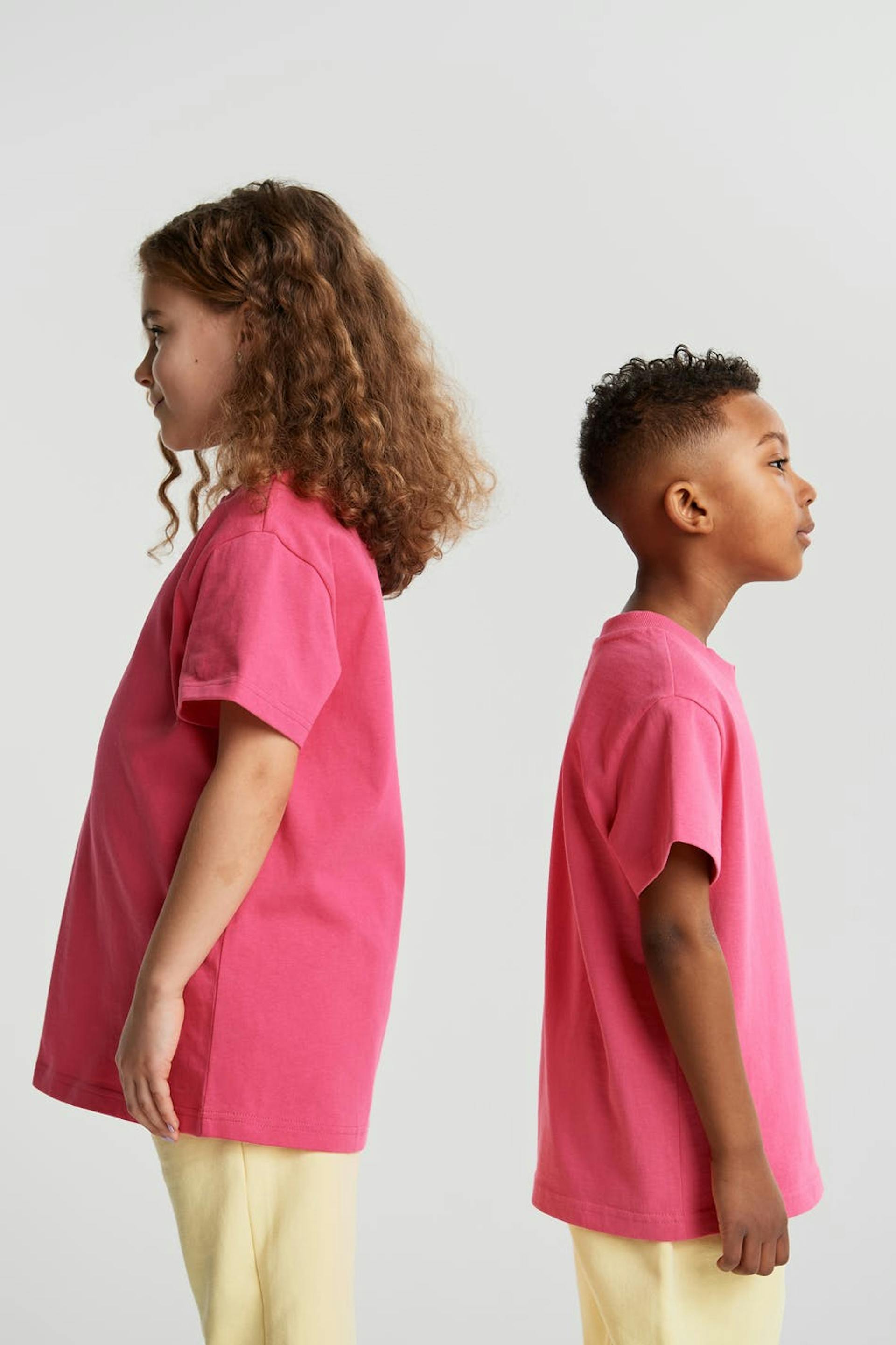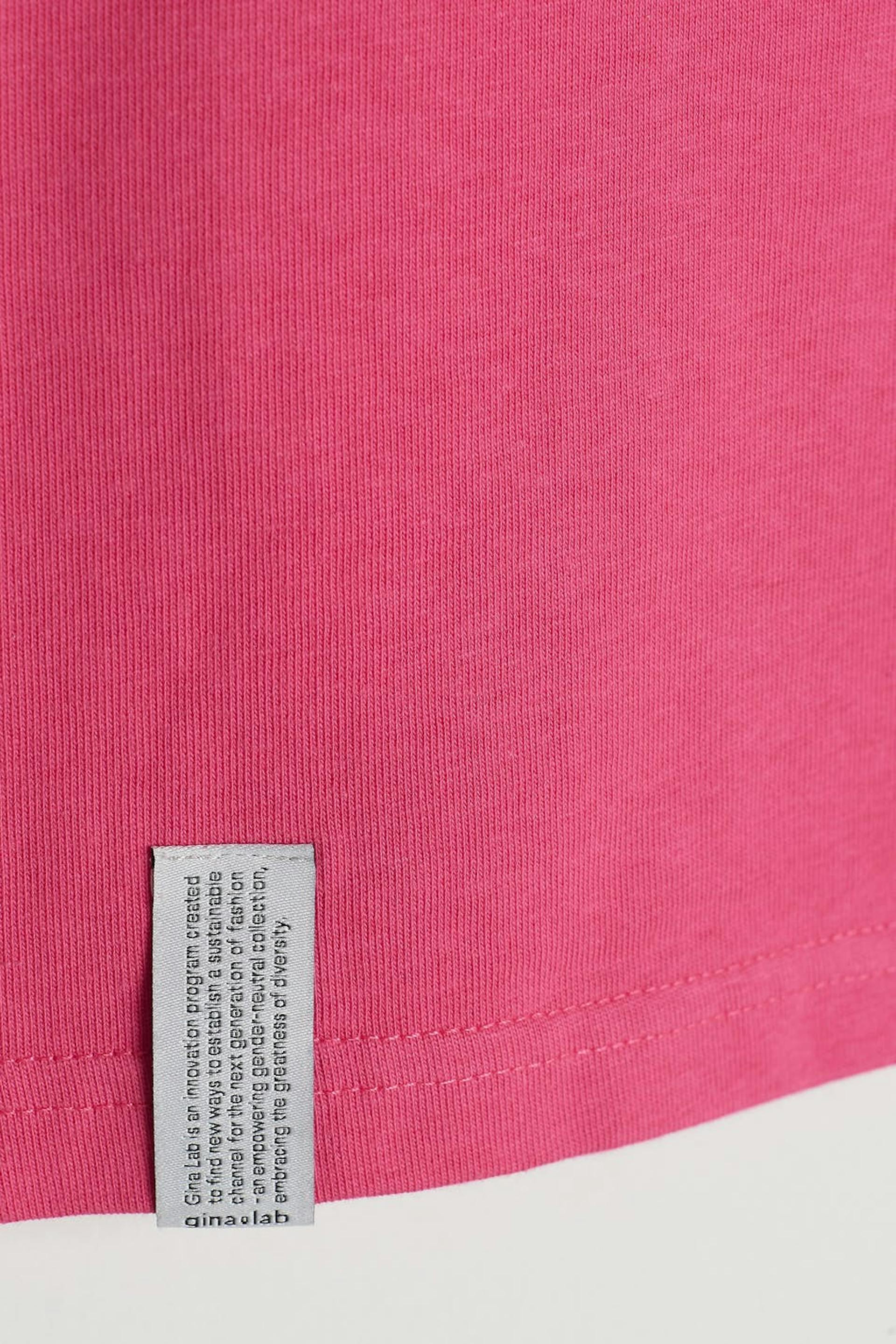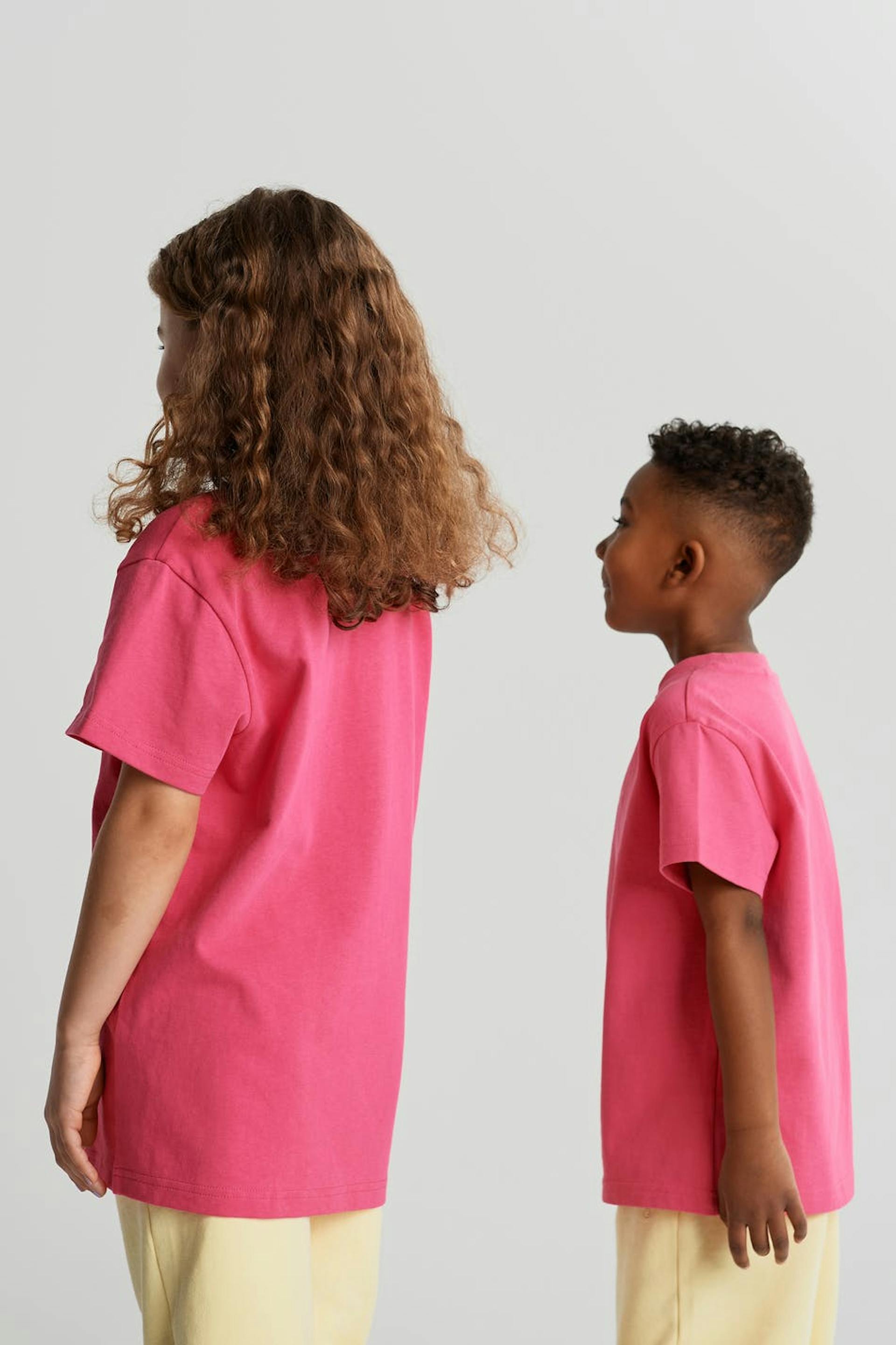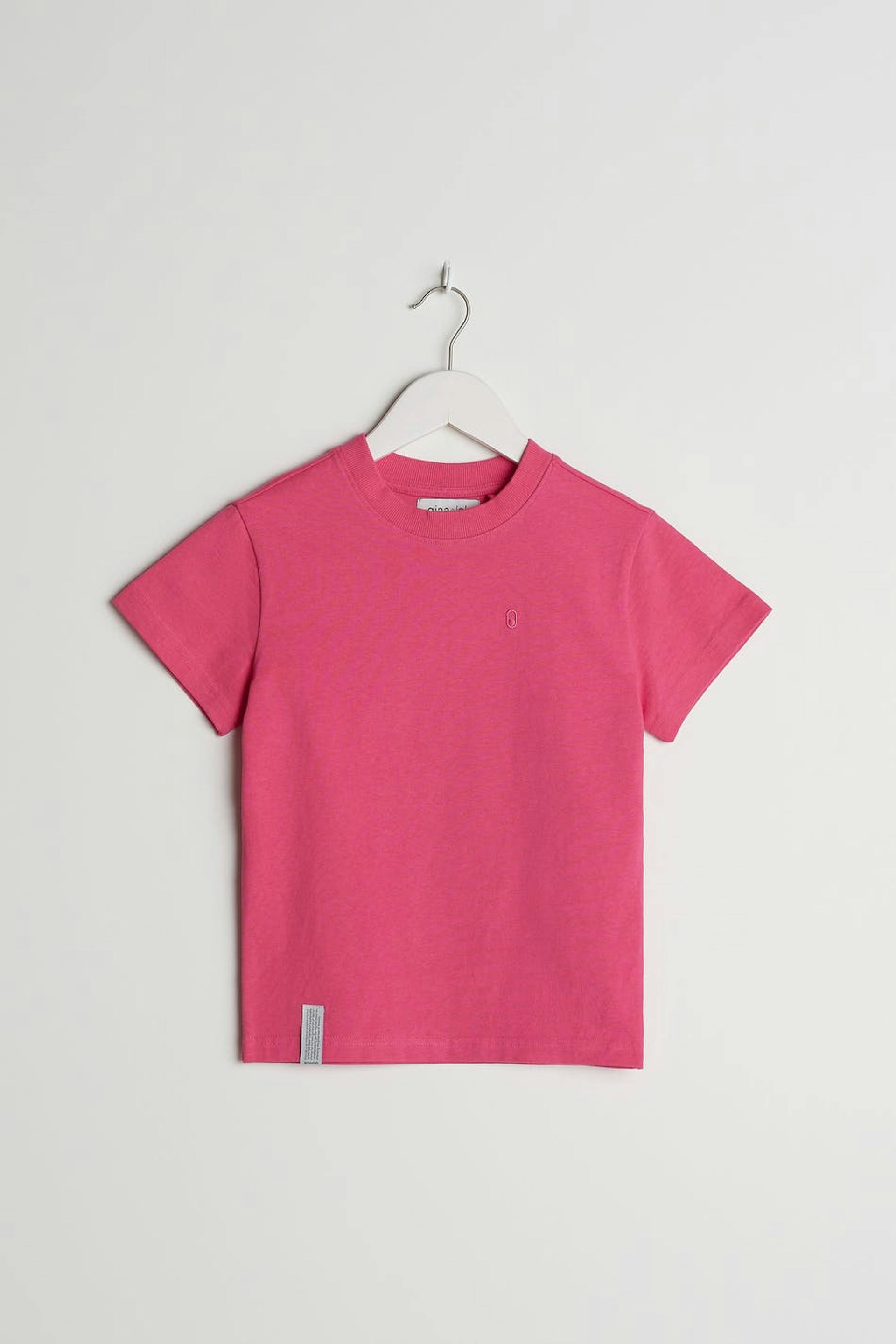 Unisexes T-Shirt von Gina Lab für Kinder mit einer Oversize-Passform. Das T-Shirt ist rosa und gender-neutral und hat eine gerippte Manschette am Ausschnitt. Es hat ein kleines, gesticktes Logo auf der Brust.