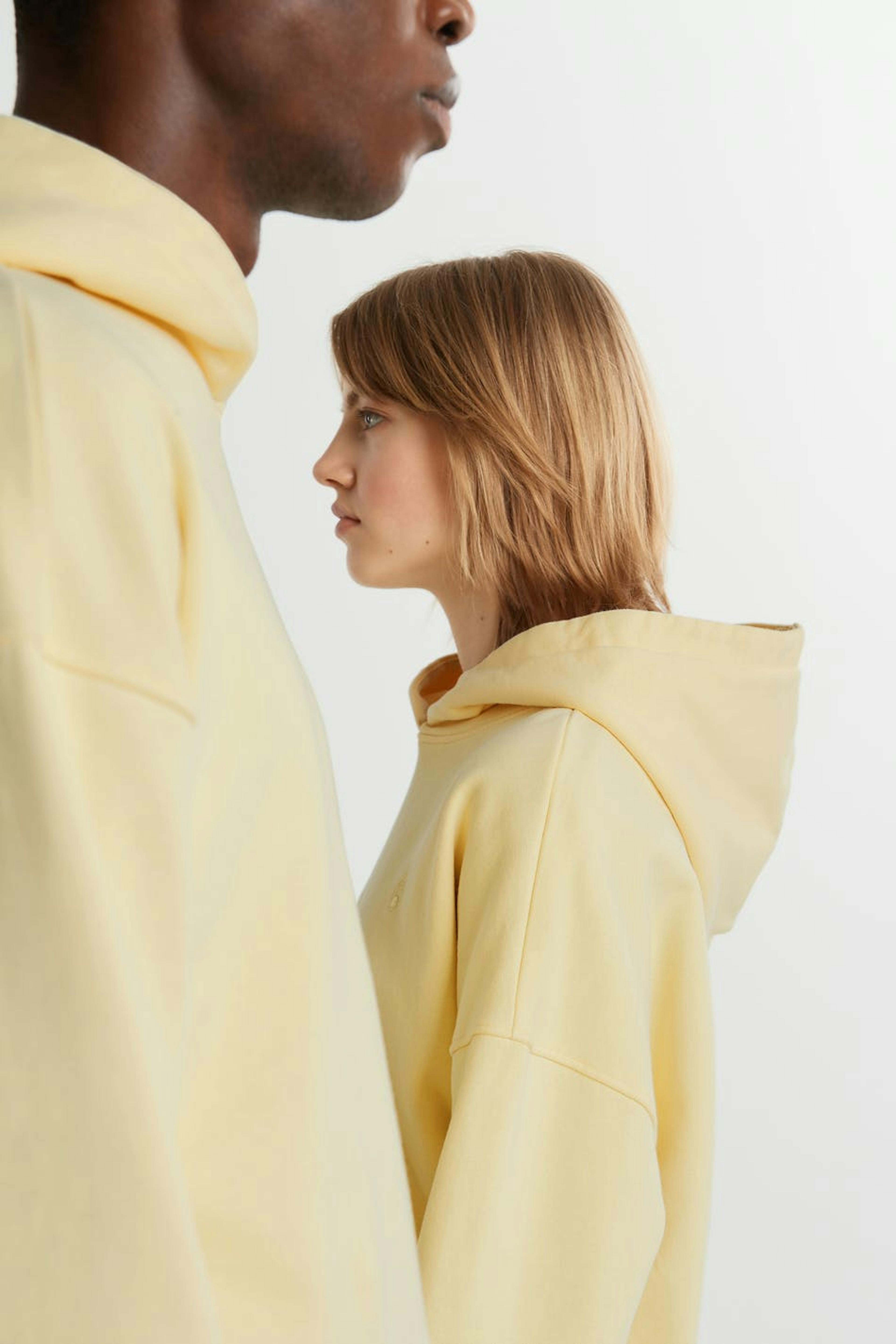Unisexes Sweatshirt von Gina Lab mit einer Oversize-Passform. Gelb, weich, zeitlos und gender-neutral. Es hat eine Kapuze, eine gerippte Manschette an den Ärmelenden und am Saum und ein kleines, gesticktes Logo auf der Brust.