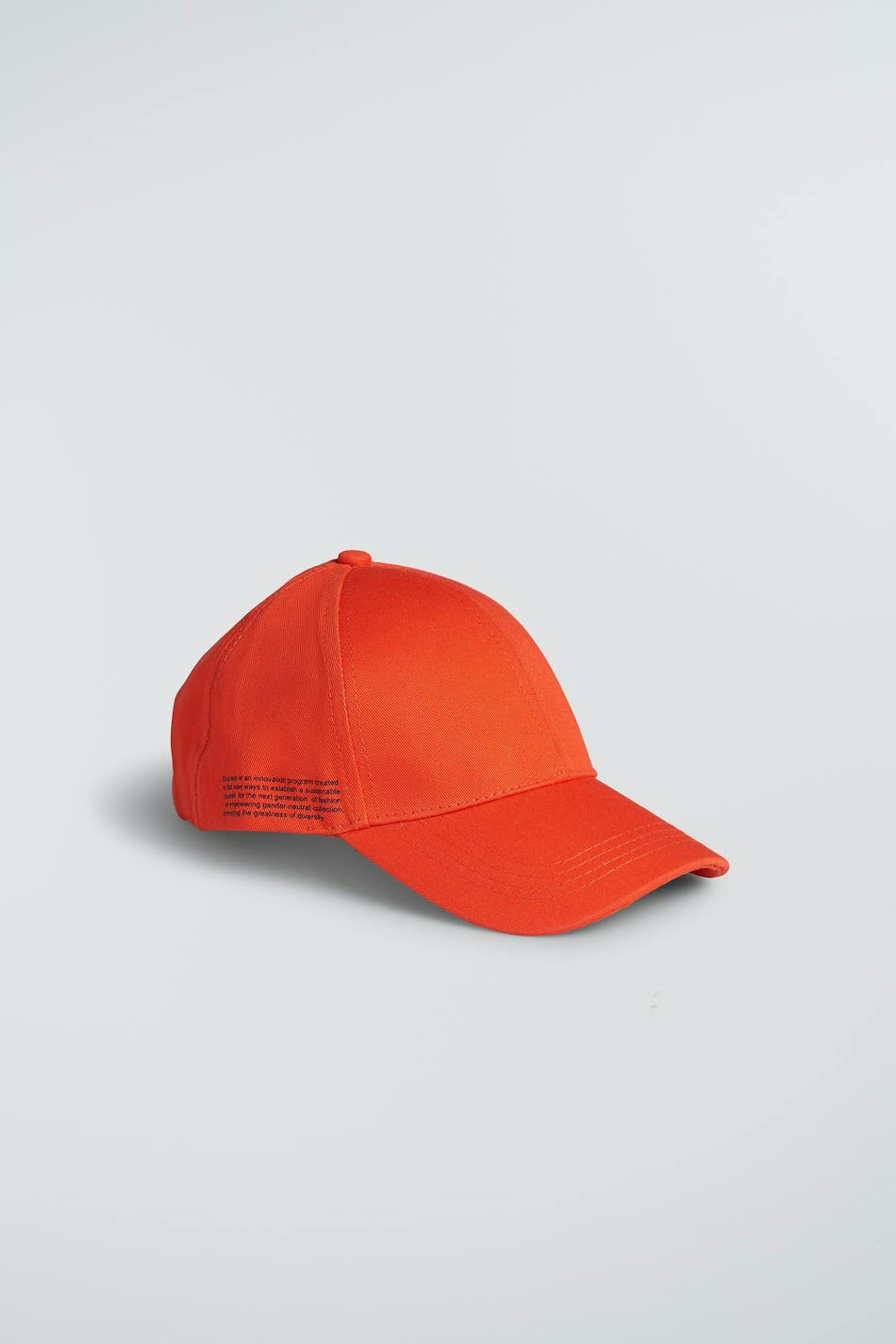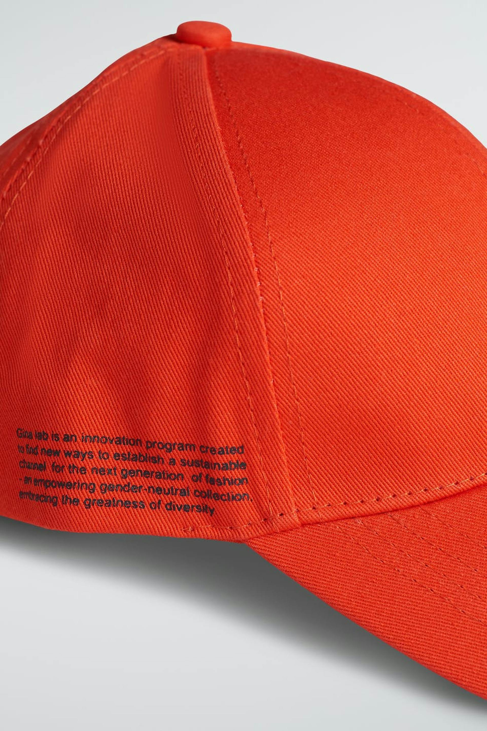 Kappe von Gina Lab für Kinder mit einstellbaren Größen. Die Kappe ist orange und hat einen kleinen Druck mit einem Text auf einer Seite.