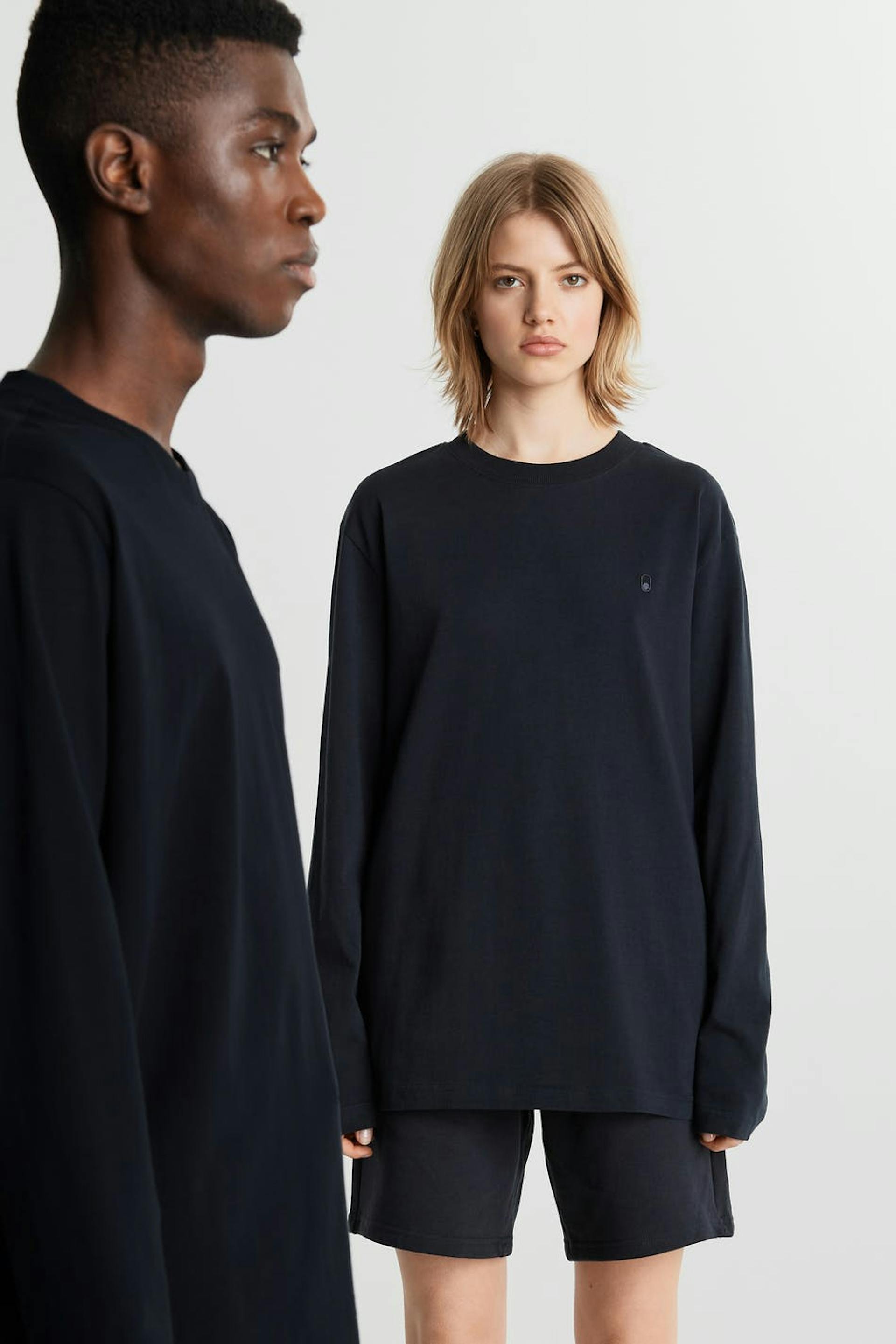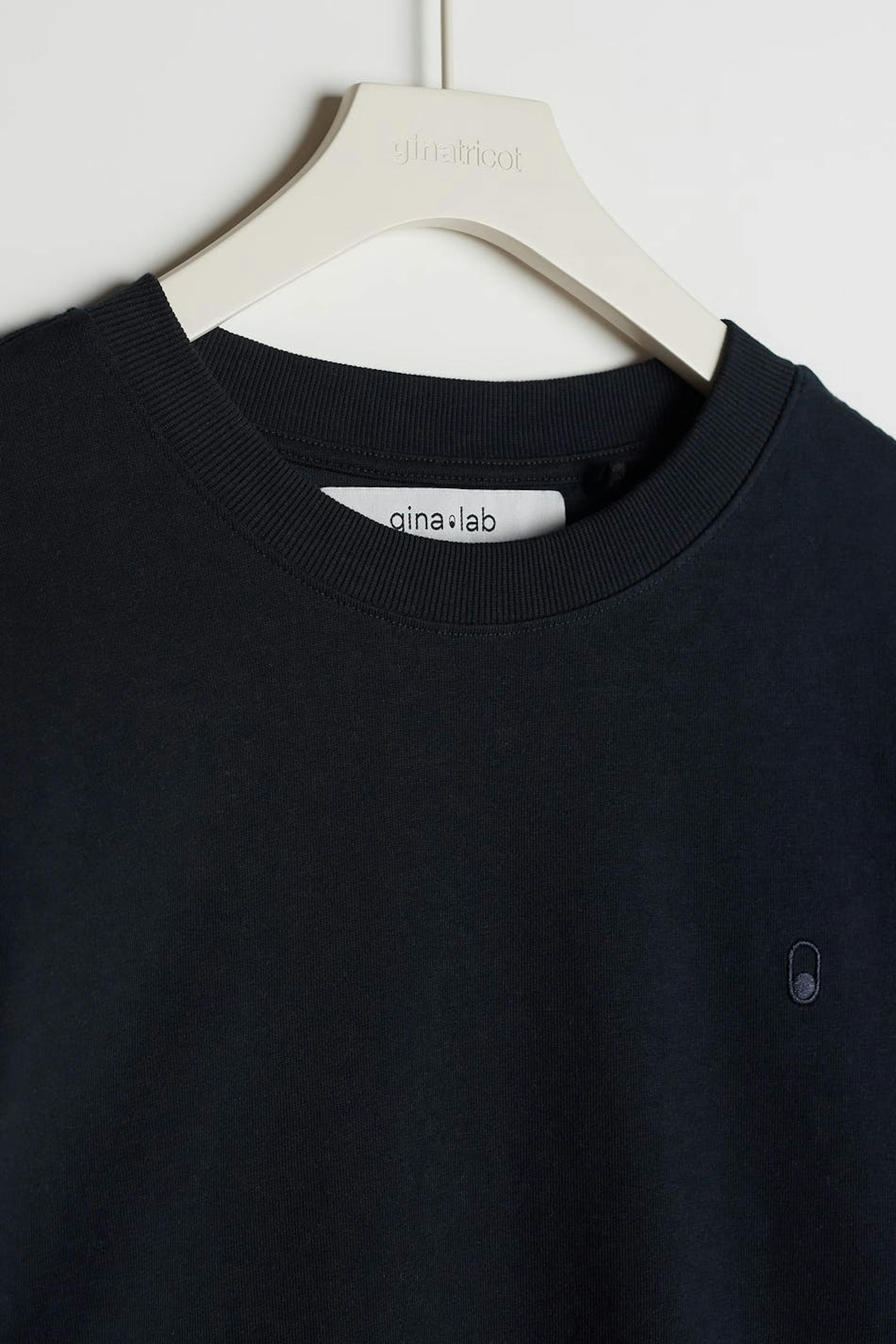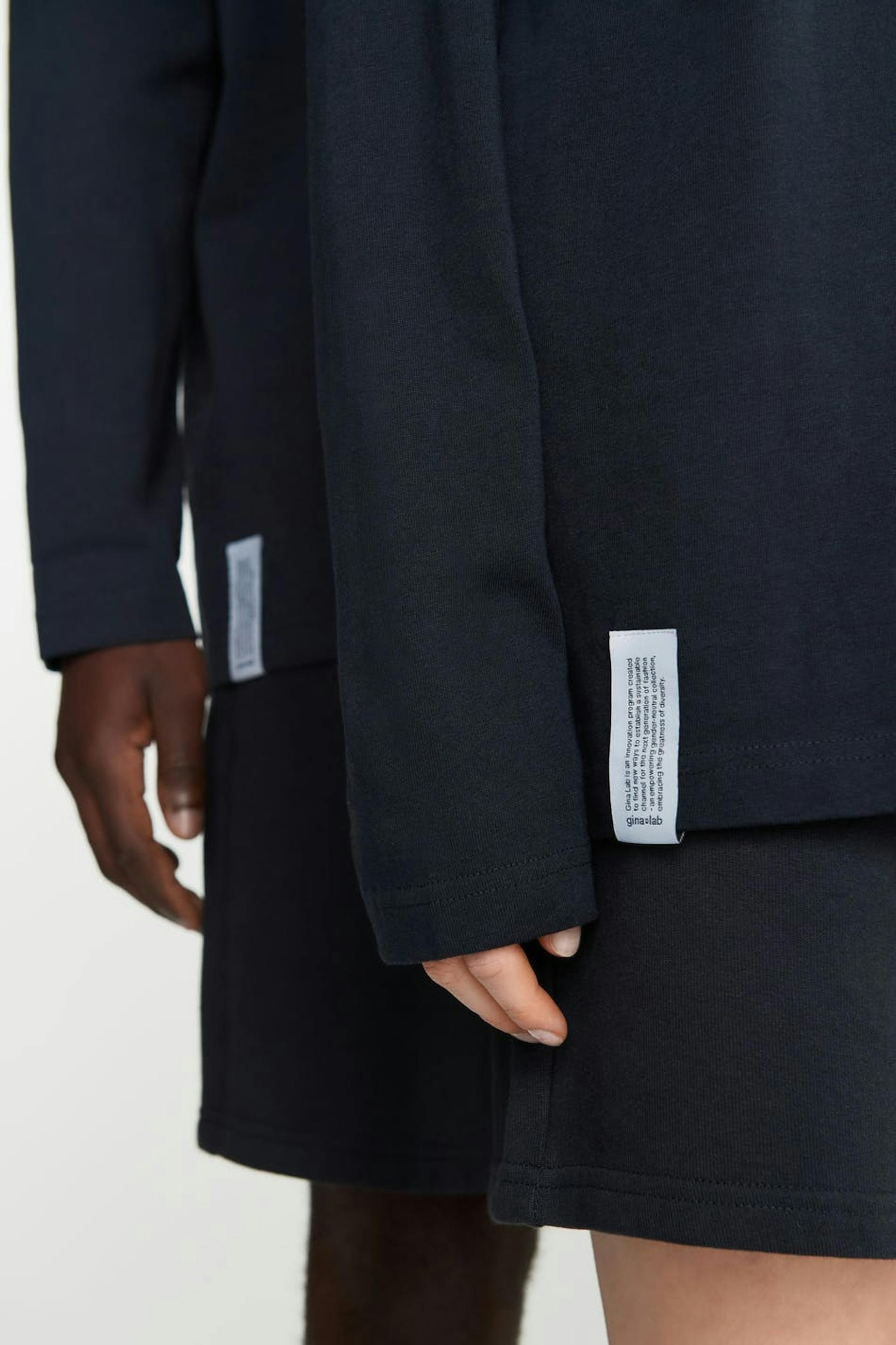 Langärmliges Top von Gina Lab mit einer Oversize-Passform. Schwarz, unisex, gender-neutral und zeitlos. Es hat eine gerippte Manschette am Ausschnitt und ein kleines, gesticktes Logo auf der Brust.