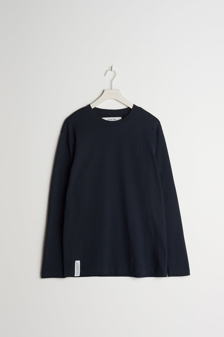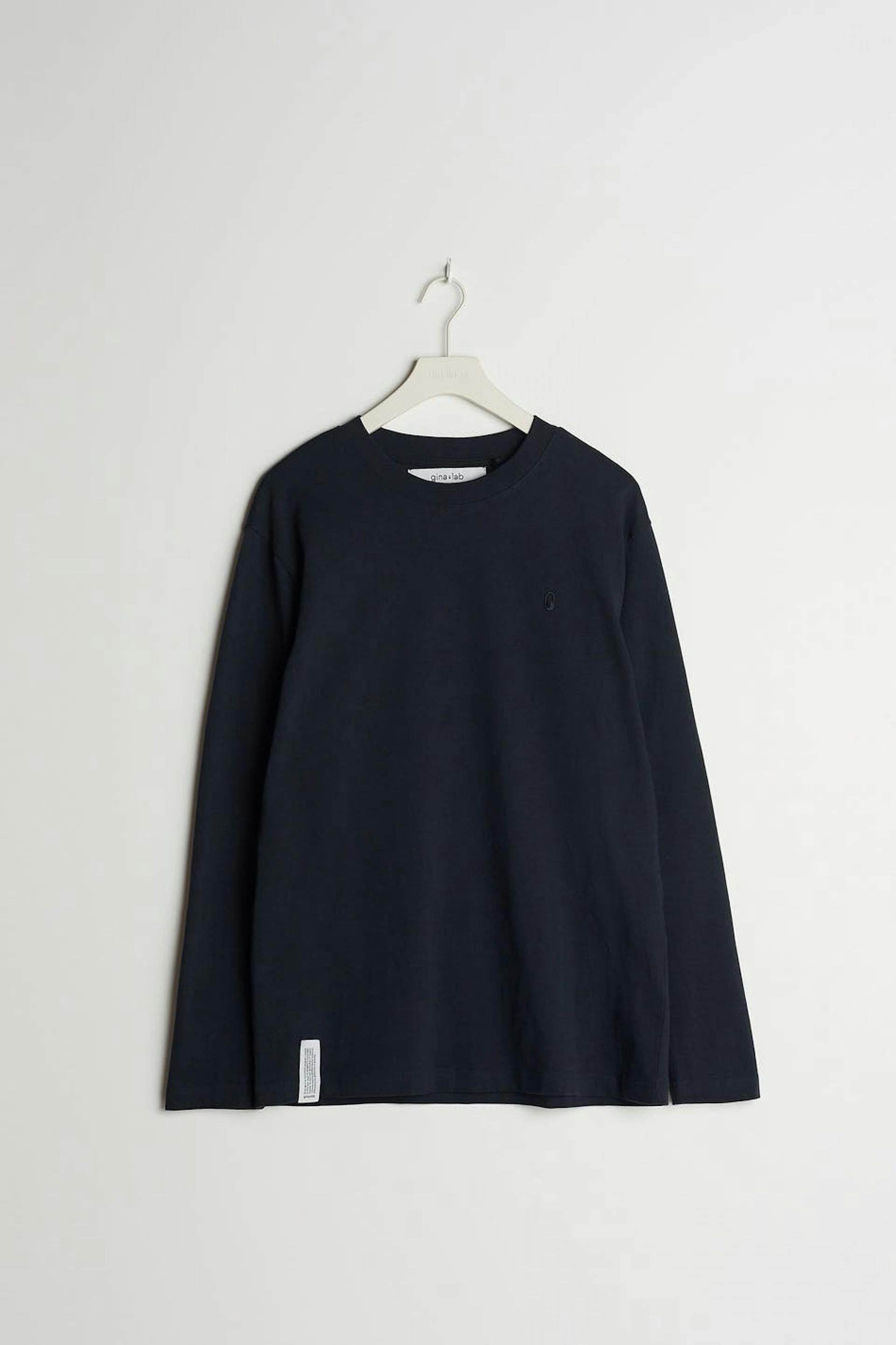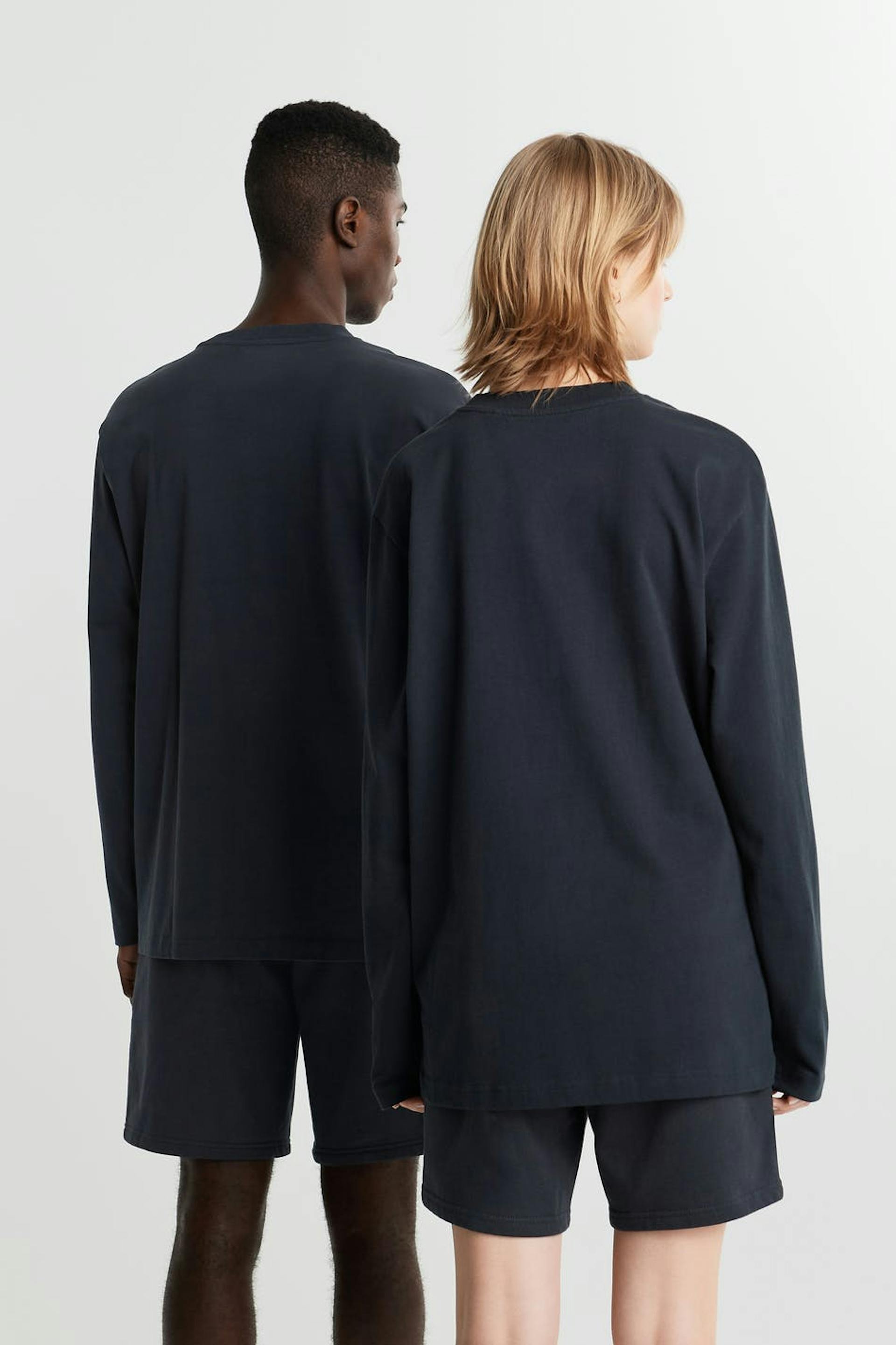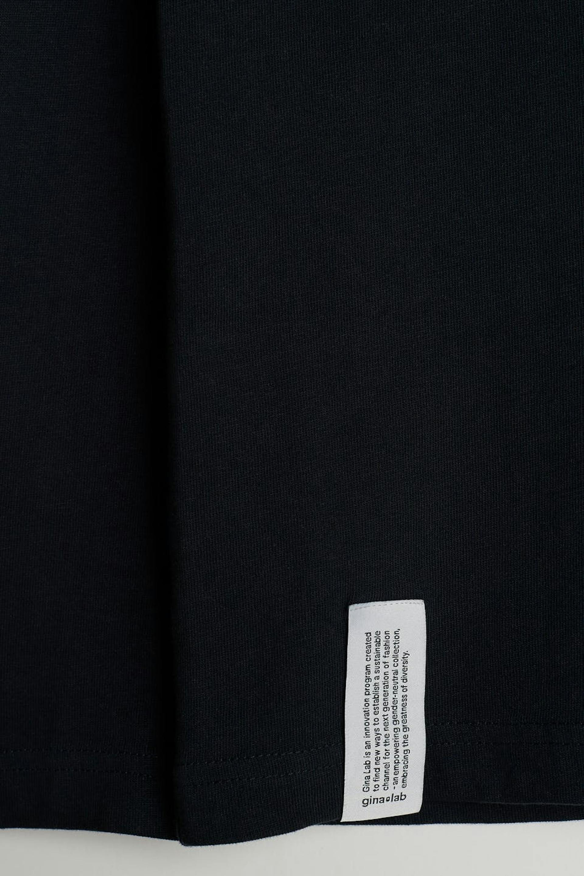 Langärmliges Top von Gina Lab mit einer Oversize-Passform. Schwarz, unisex, gender-neutral und zeitlos. Es hat eine gerippte Manschette am Ausschnitt und ein kleines, gesticktes Logo auf der Brust.