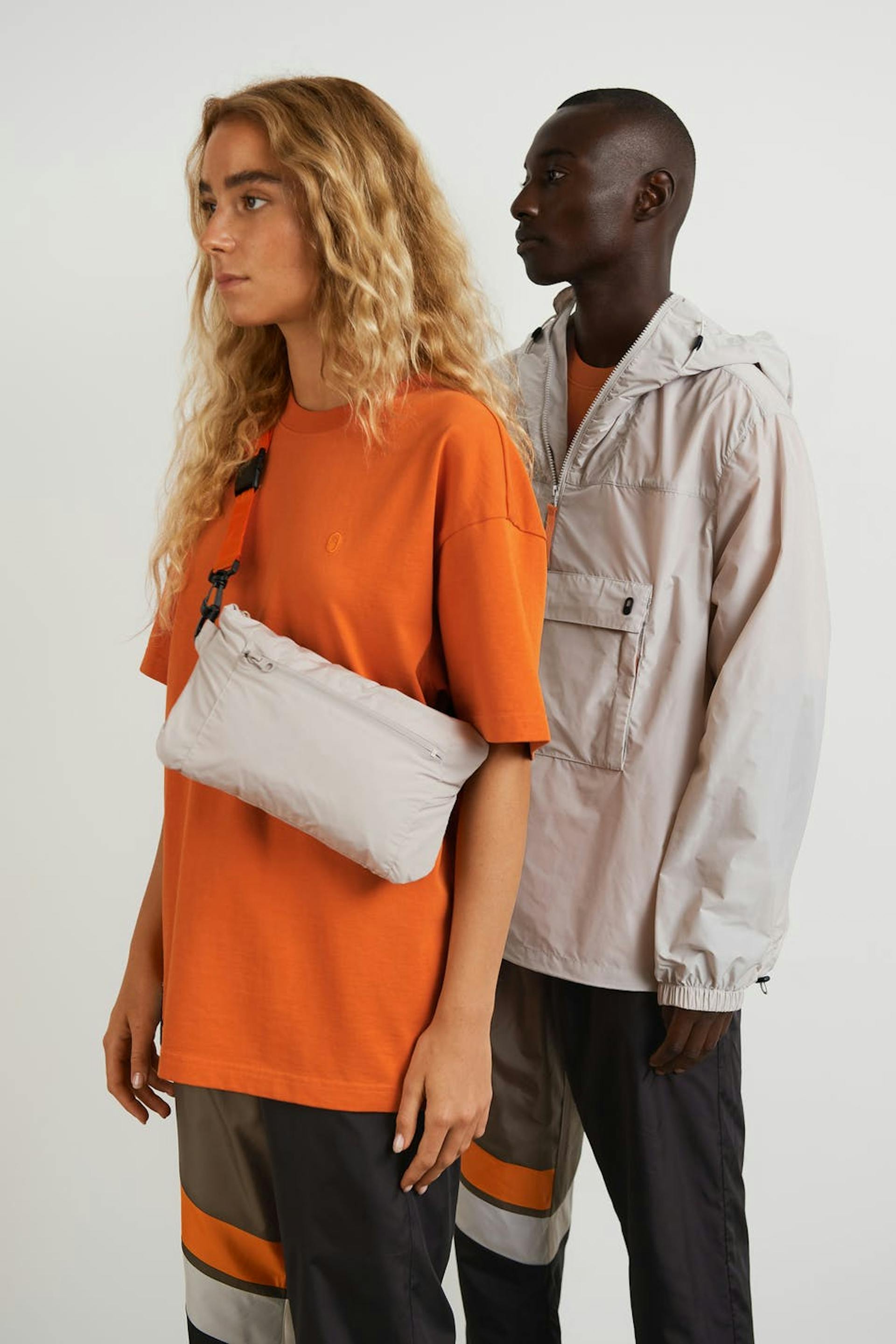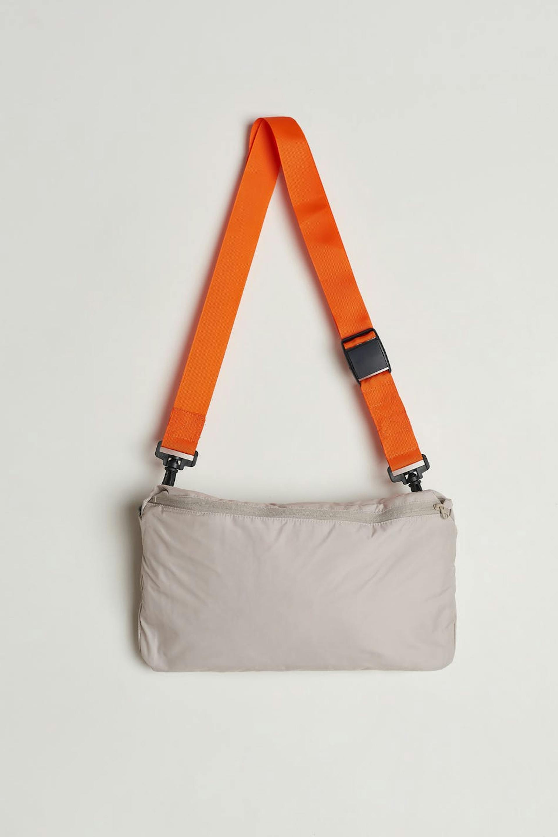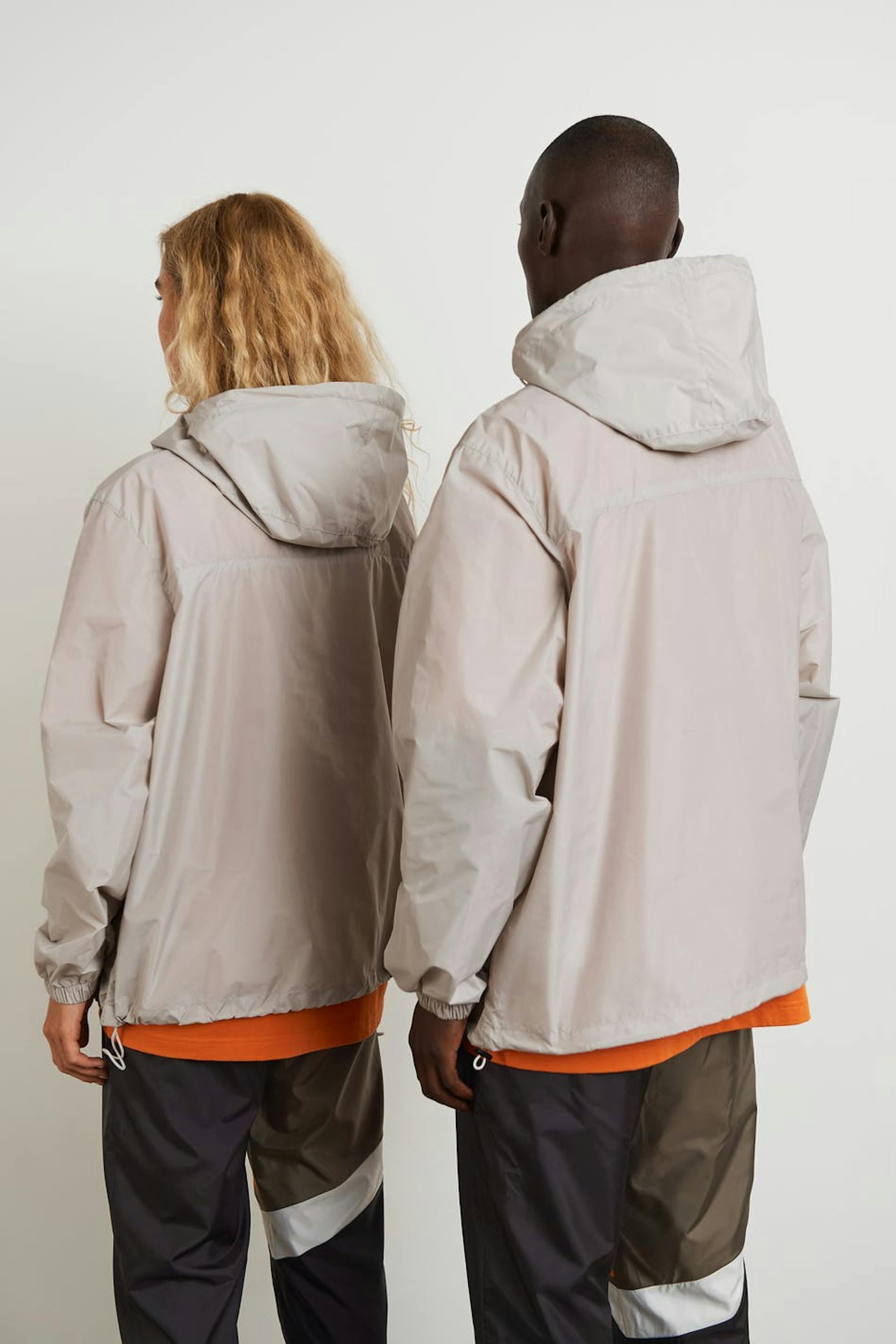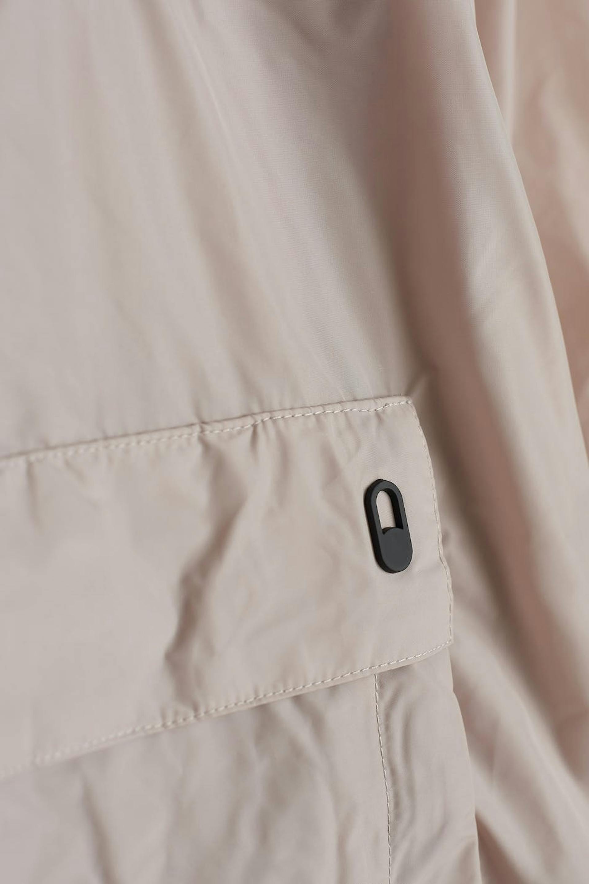 Anorak von Gina Lab mit einer großen, vorderen Tasche. Der Anorak ist beige und hat eine Kapuze hinten. Er hat elastische Manschette, einen halben Reißverschluss auf der Oberseite und einen einstellbaren Kordelzug am unteren Saum. Die Jacke kann mühelos in eine praktische Tasche verwandelt werden.